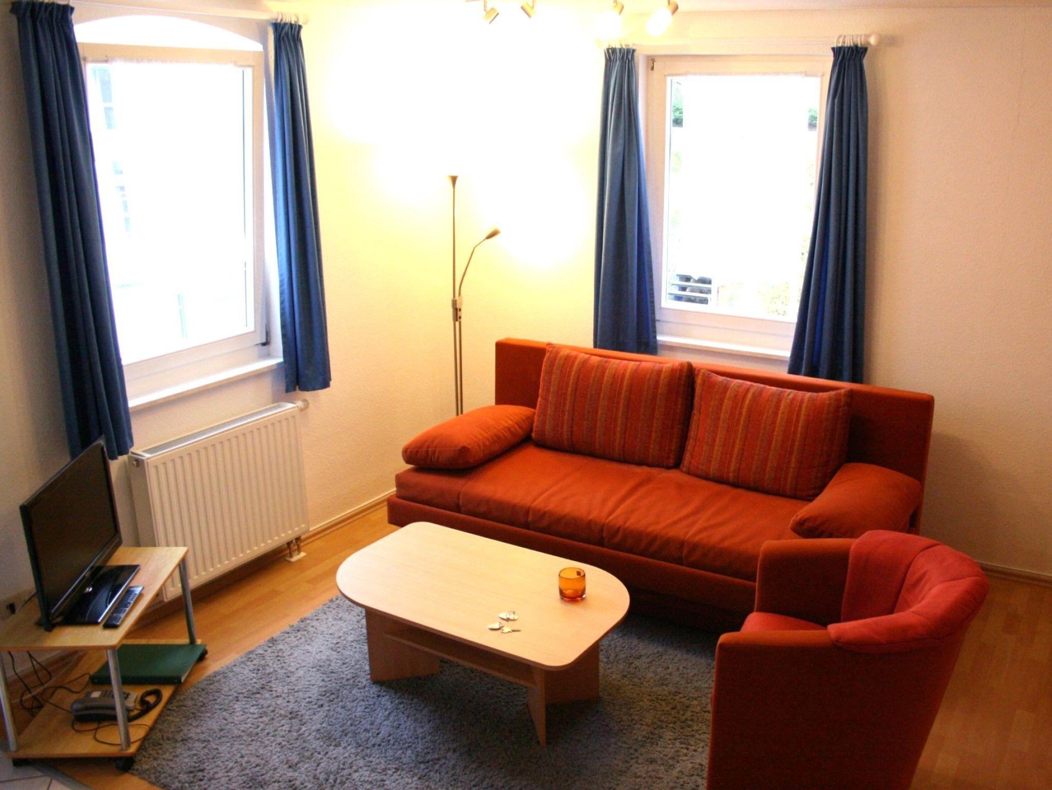 • Wohnzimmer mit Schlafcouch, Essecke sowie Flachbild-TV