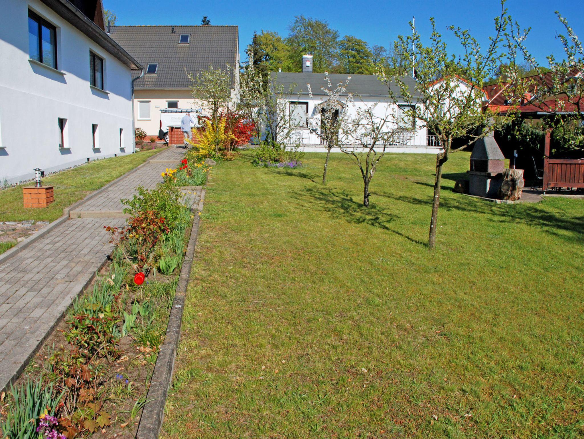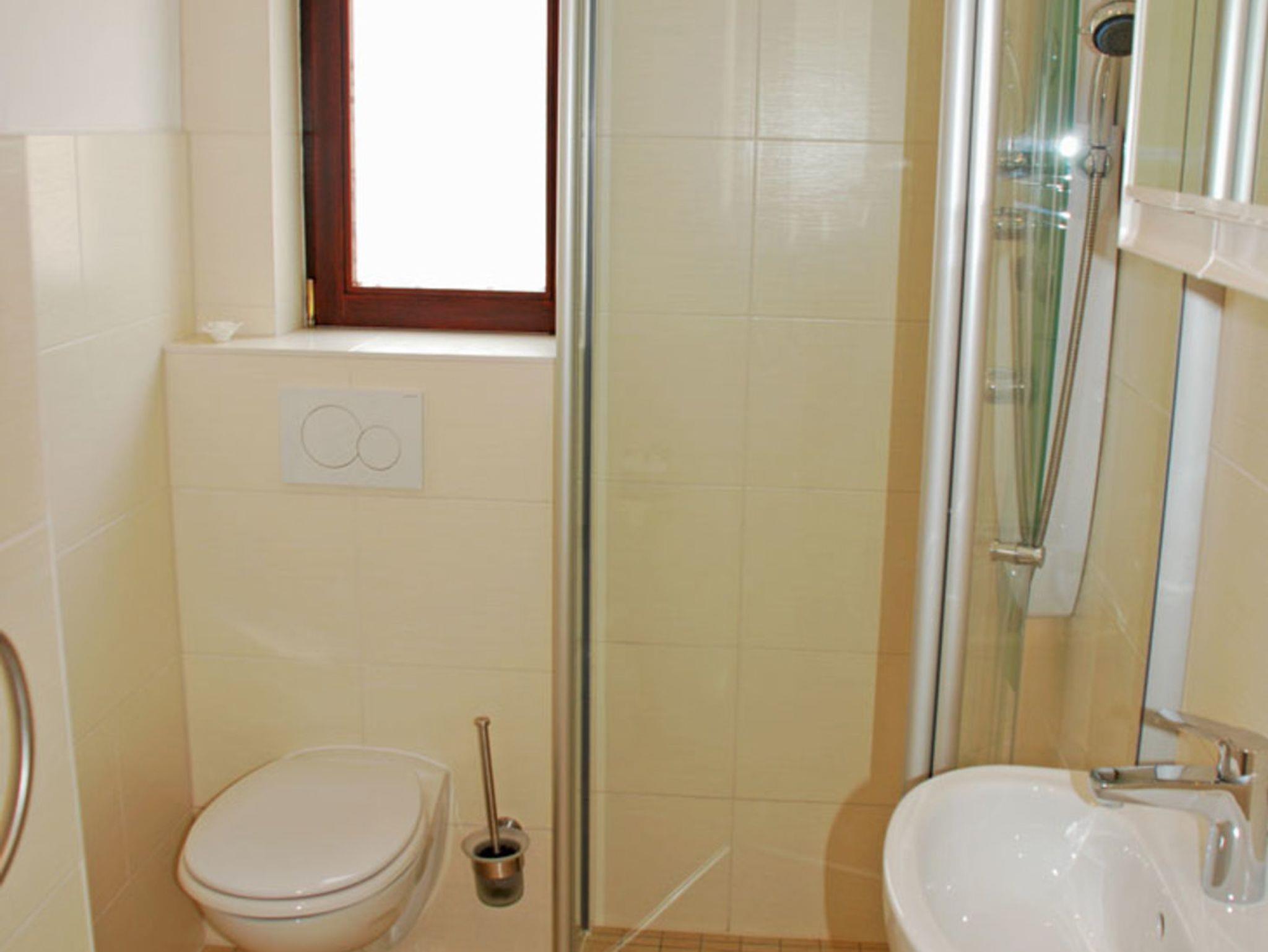 Das helle Bad mit Fenster ist mit Dusche, WC und Waschtisch ausgestattet. Direkt vor dem Haus gibt es eine große Sonnenterrasse mit Sitzmöbeln. Davor befindet sich in einem großer Garten ein Pavillon mit Gartenmöbeln und ein Grill, die mitgenutzt werden können.