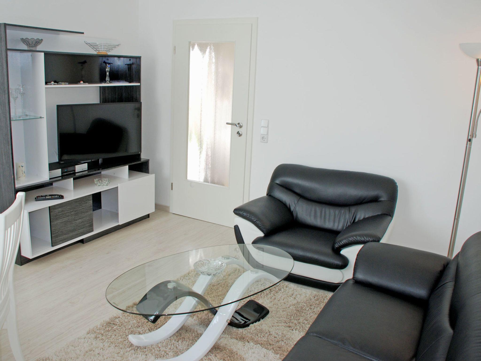 Dieses modern eingerichtete Ferienhaus befindet sich auf einem Gartengrundstück und bietet auf 55 qm großzügig Platz für max. 2 Erwachsene sowie 2 Kinder bis 17 Jahren und hat Internet - WLAN. Für ein drittes Kind bis drei Jahren kann hier ein Kinderreisebett bereitgestellt werden. Dieses bitte bei Buchung mit angeben. Über den Eingang gelangen Sie in den Flur. Im großen, hellen Wohnzimmer stehen eine bequeme Polstersitzgruppe mit Tisch und Sesseln und ein Schrank mit Flachbild - TV - Gerät. Hier steht auch ein Esstisch mit Stühlen. Im ersten Schlafzimmer stehen ein bequemes Doppelbett mit Nachttischen und Leselampen sowie ein Kleiderschrank.
