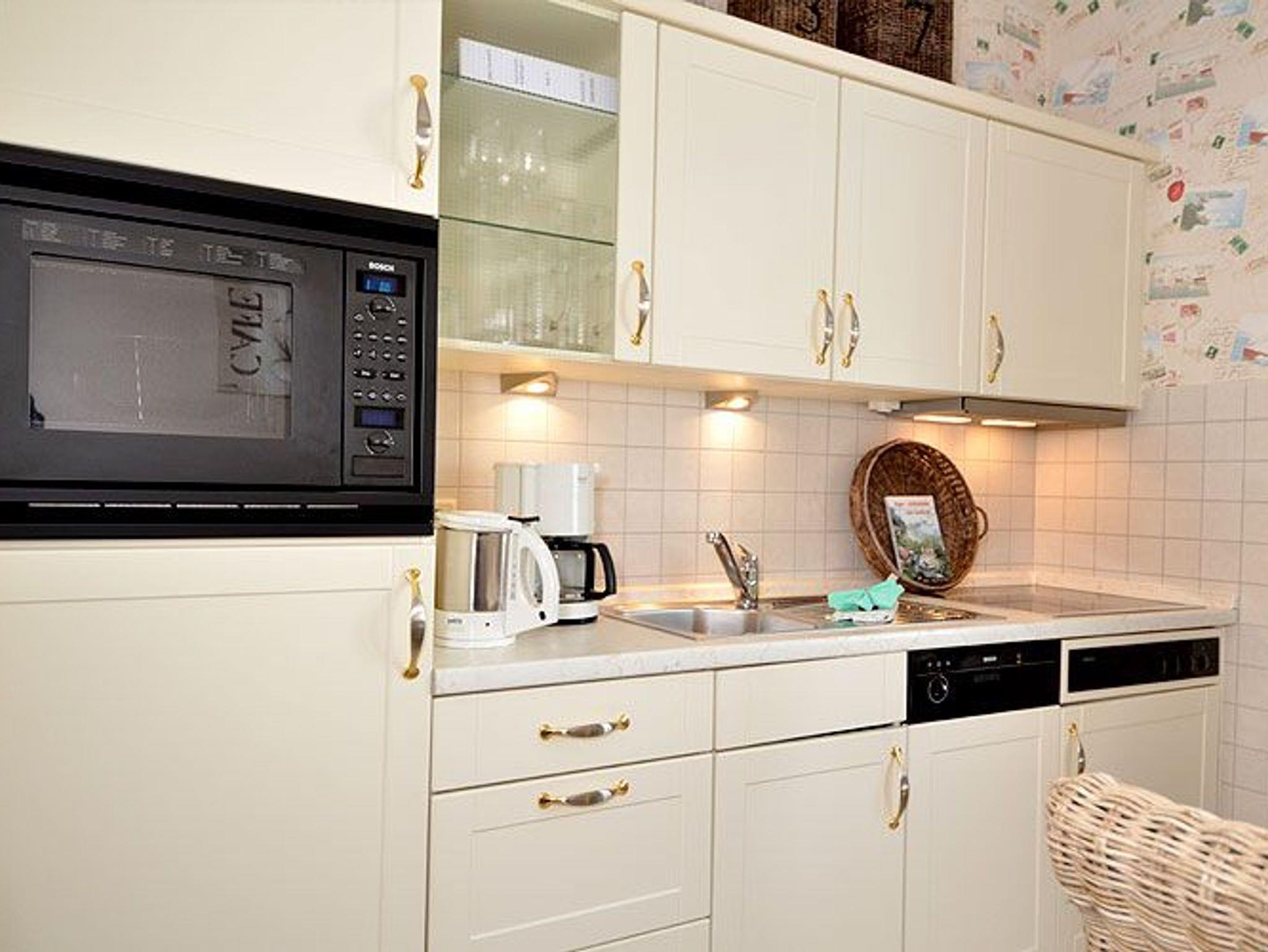 Die separate Küche mit einem Esstisch für 4 Personen lässt keine Wünsche offen. In dieser finden Sie einen Kühlschrank mit Gefrierfach, ein 4-Platten-Ceranfeld, eine Spülmaschine, eine Mikrowelle mit Grillfunktion und diverses Kleininventar, das die Küchenausstattung komplettiert.
