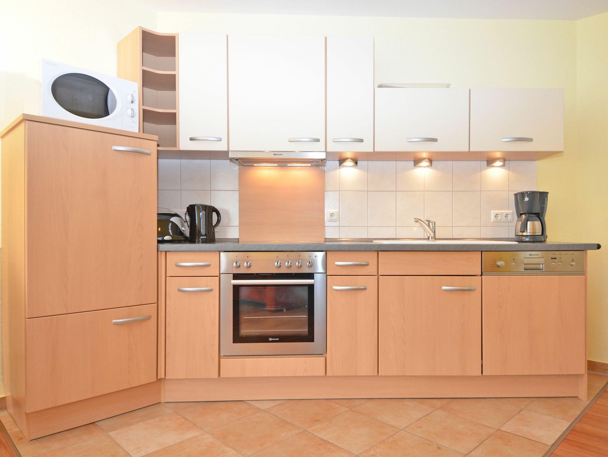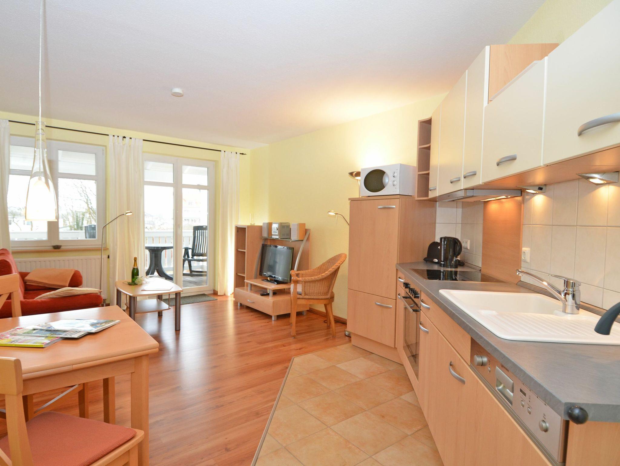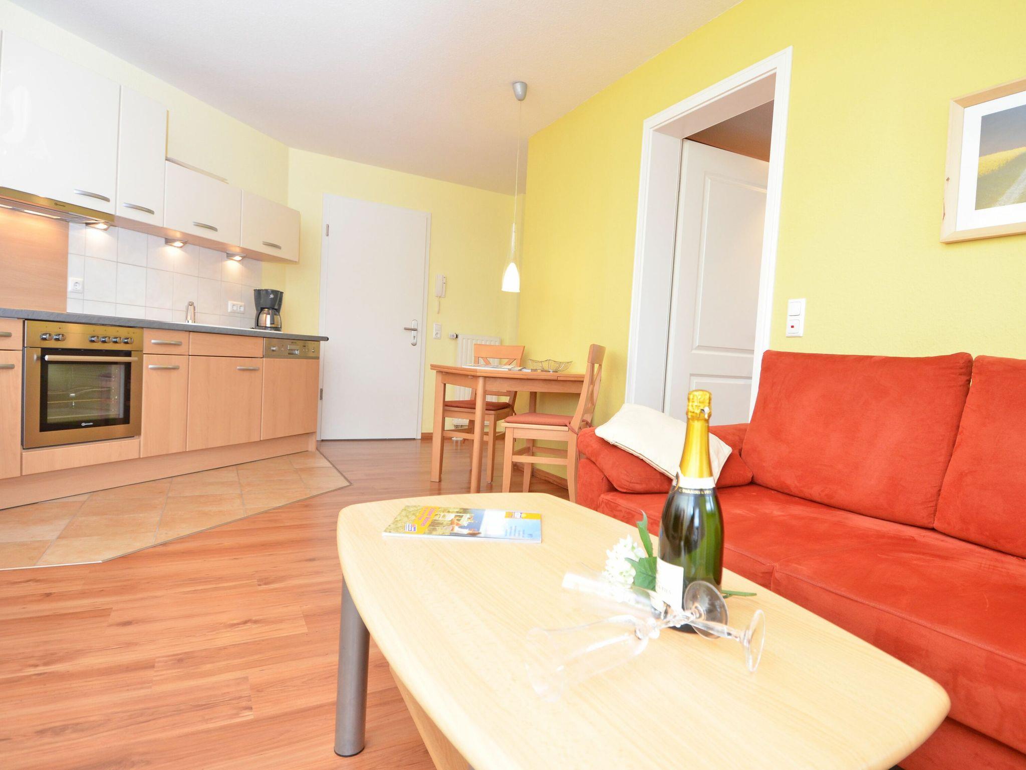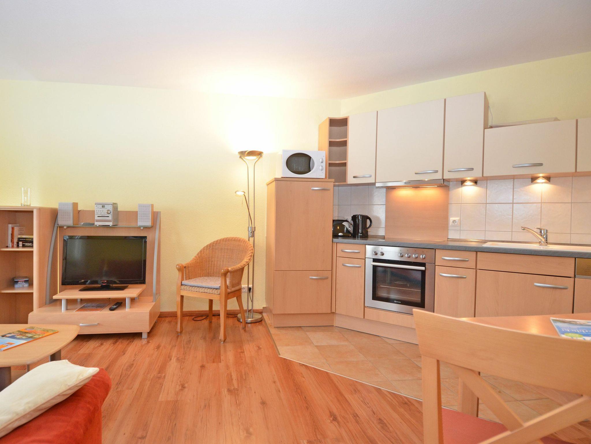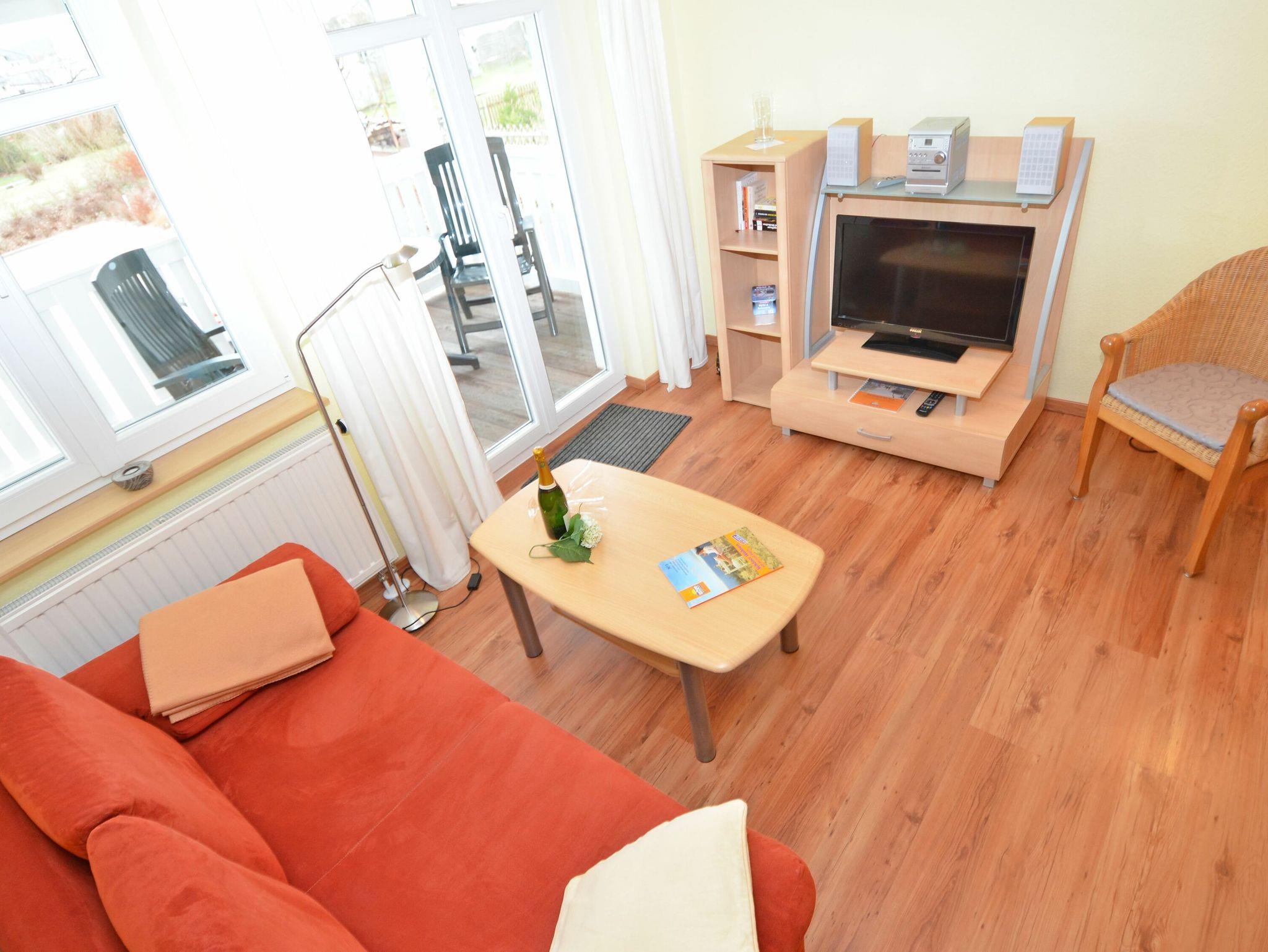 Der helle, freundliche Wohnraum ist mit einer bequemen Couch, einem Flachbild-TV, einer Mini-Stereoanlage mit CD-Player und einem Esstisch ausgestattet. Die harmonisch in den Wohnbereich integrierte Küchenzeile verfügt über einen Kühlschrank mit Gefrierfach, ein 4-Platten-Cerankochfeld, einen Backofen, eine Geschirrspülmaschine, eine Mikrowelle, Wasserkocher, Kaffeemaschine, Toaster und diverses Kleininventar, das die Küchenausstattung komplettiert.