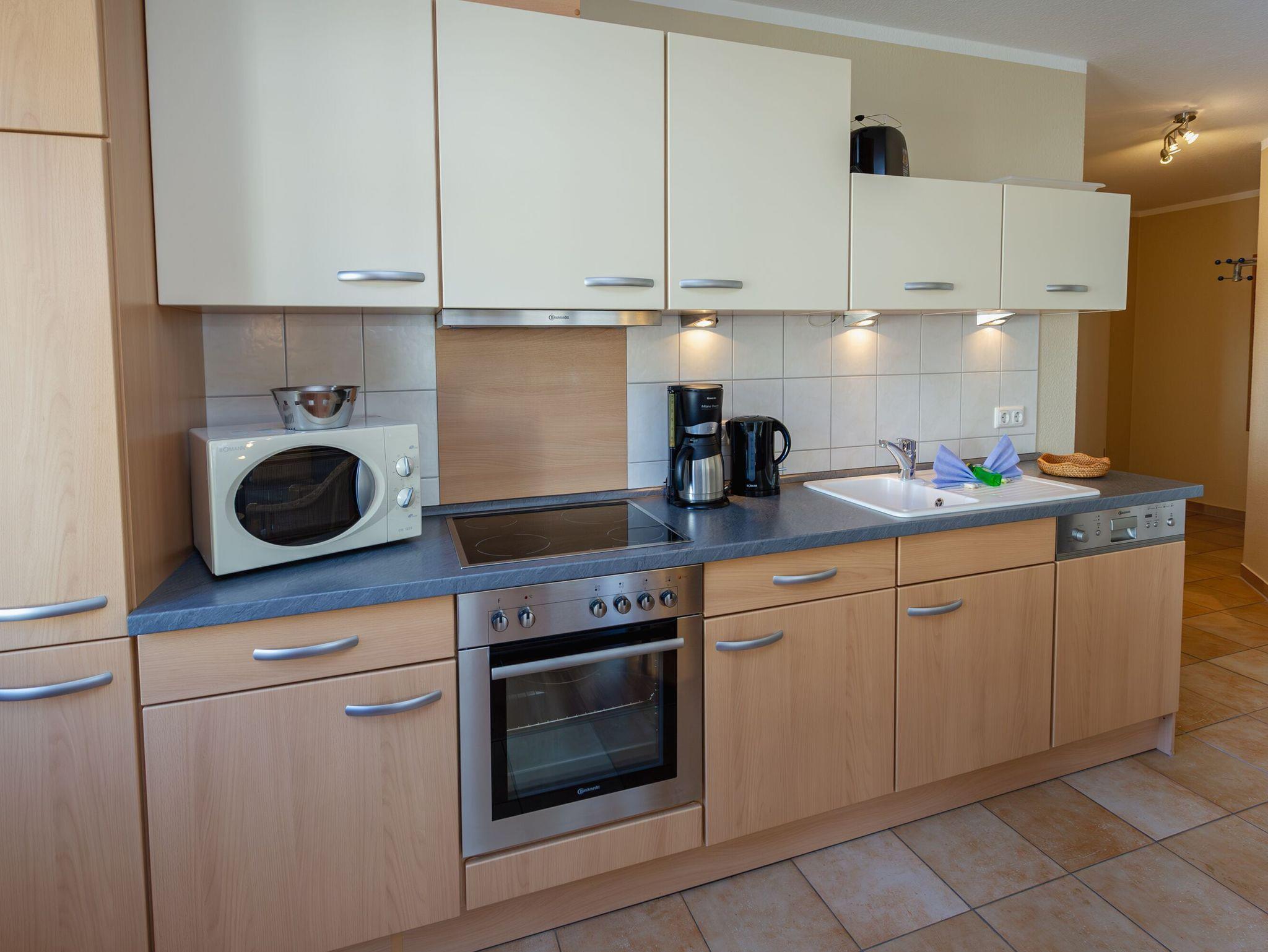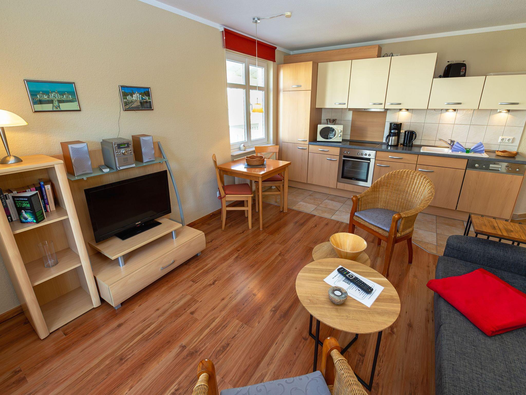 Der helle, freundliche Wohnraum ist mit einer bequemen Lederschlafcouch (Aufbettungsmöglichkeit für 2 Personen), zwei Korbsesseln, einem Flachbild-TV, einer Mini-Stereoanlage mit CD-Player und einem Esstisch ausgestattet. Die harmonisch in den Wohnbereich integrierte Küchenzeile ist ausgestattet mit einem Kühlschrank mit Gefrierfach, einem 4-Platten-Cerankochfeld, einem Backofen, einer Geschirrspülmaschine, einer Mikrowelle, Wasserkocher, Kaffeemaschine, Toaster und diversem Kleininventar, das die Küchenausstattung komplettiert.