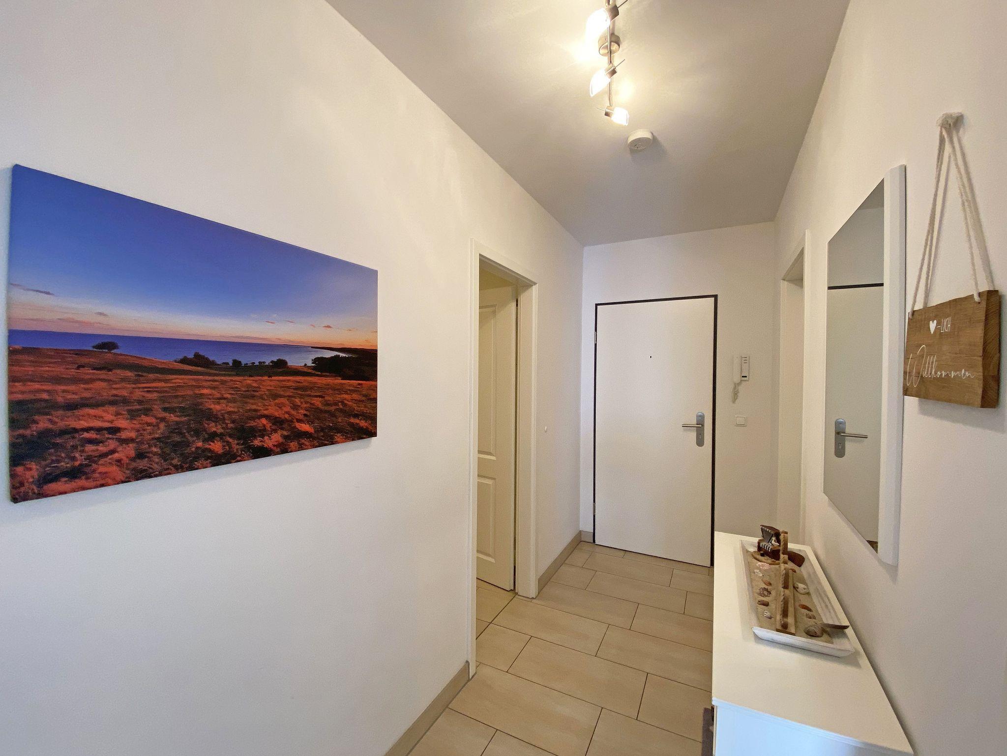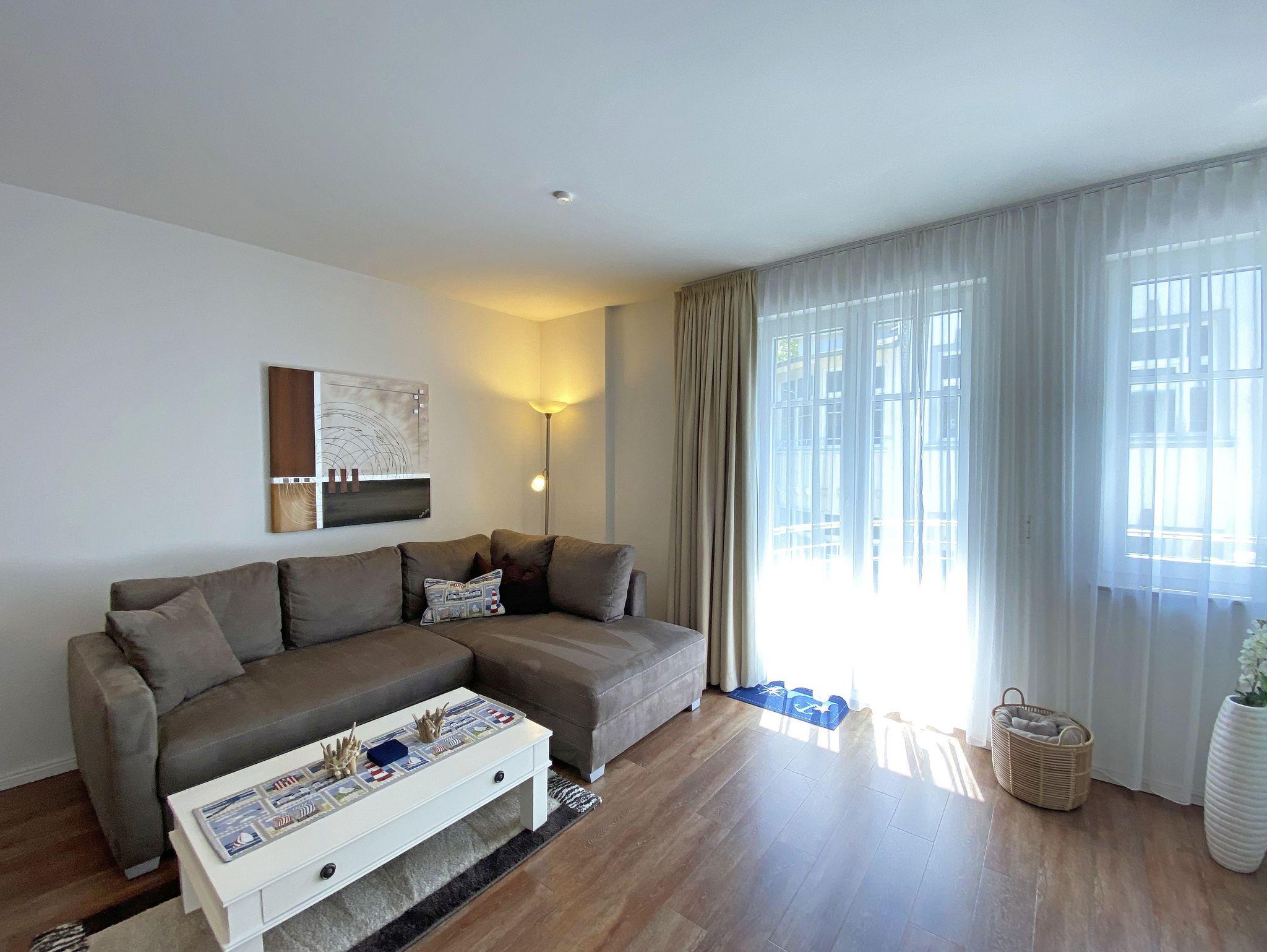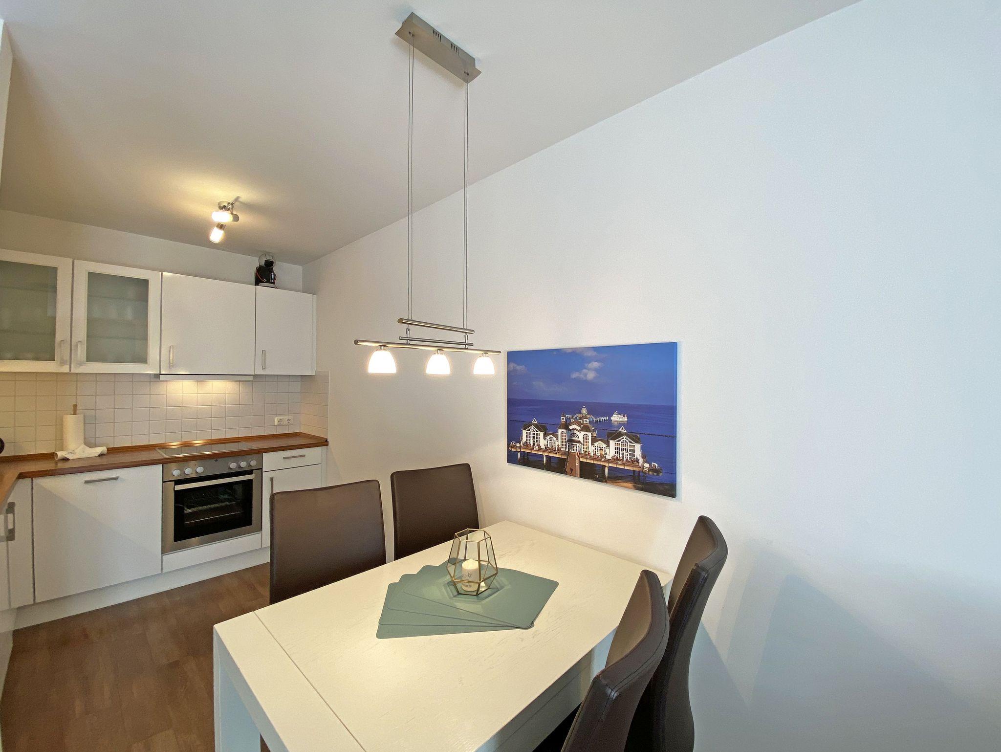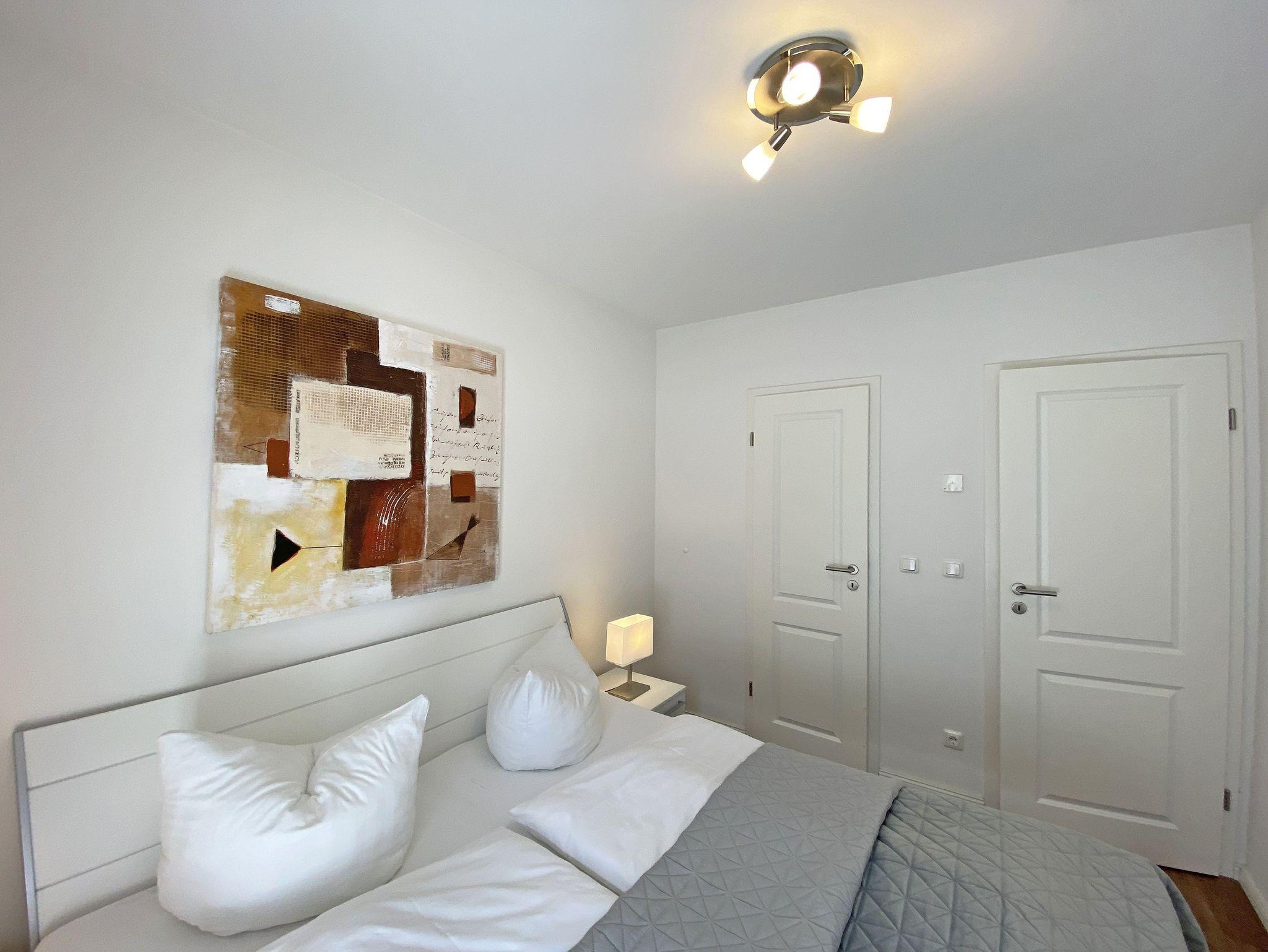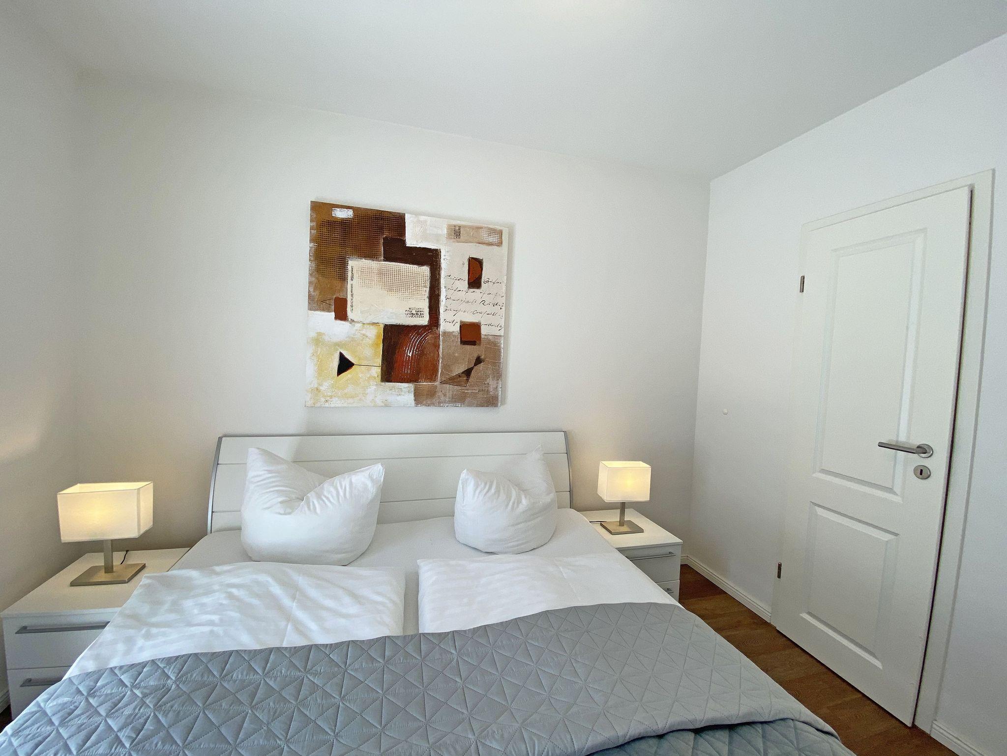 Die 2-Zimmer Nichtraucherwohnung ?Wellnesszeit befindet sich im 2. OG und ist bequem per Fahrstuhl zu erreichen. Die Wohnfläche beträgt ca. 54 m² und ist für max. 2 Personen geeignet. Der zu der Wohnung gehörende bestuhlte Balkon mit Sonnenschirm hat eine sonnige Süd/West Ausrichtung und lädt zum Verweilen ein. Das großzügige Wohnzimmer ist mit einem Essbereich, einer geschmackvollen weißen Wohnzimmereinrichtung und einer Couch ausgestattet. Der angrenzende und offene Küchenbereich umfasst einen 4-Zonen Ceranherd, Backofen, Dunstabzugshaube, Kühlschrank, Geschirrspüler, Mikrowelle, Wasserkocher, Toaster, Kaffeemaschine, Padmaschine (Dolce Gusto), Stabmixer, Eierkocher und diverse Küchenutensilien. Abgerundet wird der Wohnbereich von einem Smart-TV (48 Zoll), eine Soundbar von Bose mit Bluetooth, ein Digitalradio mit CD-Player und Bluetooth sowie Spielesammlung und Bücher, wenn das Wetter mal nicht mitspielt. Ein Internetanschluss (WLAN) können Sie inklusive in der Wohnung nutzen. Das Schlafzimmer ist mit einem Doppelbett (1,80m x 2,00m), verstellbaren Lattenrosten, Nachttischkonsolen, Flachbild-TV und Bluetooth-DAB-Radiowecker von Teufel ausgestattet. Der Kleiderschrank befindet sich im angrenzenden Ankleideraum. Abdunkelnde, beschichtete Übergardinen im Wohn- und Schlafbereich sorgen für einen ungestörten Schlaf. Das Bad ist mit einer flachen Glasdusche, Fön, Kosmetikspiegel, Waschmaschine, WC und Waschplatz ausgestattet. 2 Abstellräume sorgen für genügend Stauraum (Gepäck etc.). Hier befinden sich auch diverse Reinigungsutensilien, ein Bügelbrett und Bügeleisen sowie ein Wäscheständer. In allen Räumen sorgt eine Fußbodenheizung für angenehme Wärme. Der sich im Erdgeschoss befindliche Wellnessbereich (kostenpflichtig) verfügt über eine finnische Sauna, Dampfbad und einen stilvollen Ruhebereich. Die Wertmarken können Sie auf Nachfrage während Ihres Urlaubes erwerben. Der Parkplatz Nr. 13 (Einfahrtshöhe 2,00 m) befindet sich in der Tiefgarage (Doppelparker: bis 1,80m Höhe, 5,00m Länge sowie 2 t Gewicht) und ist für Pkws und Kombis (bis 1,80 m Höhe und 1,90 m Breite) geeignet. Ihre Fahrräder können Sie im hauseigenen Fahrradkeller unterbringen. Ein kleines Haustier (keine Katzen) mit eigenem Schlafplatz ist gegen eine Gebühr ein gern gesehener Gast. Ein Fress- und Wassernapf und ein Hundebett stehen auch zur Verfügung. Die Erstausstattung eines Wäschepaketes (komplette Bettwäsche, 1 Duschhandtuch, 2 kleine Handtücher) können Sie bis 14 Tage vor Anreise gegen einen Aufpreis dazu buchen oder durch eigene ergänzen. Ab 2 gebuchten Paketen erhalten Sie einmalig 1 Geschirrhandtuch und 1 Duschvorleger hinzu.