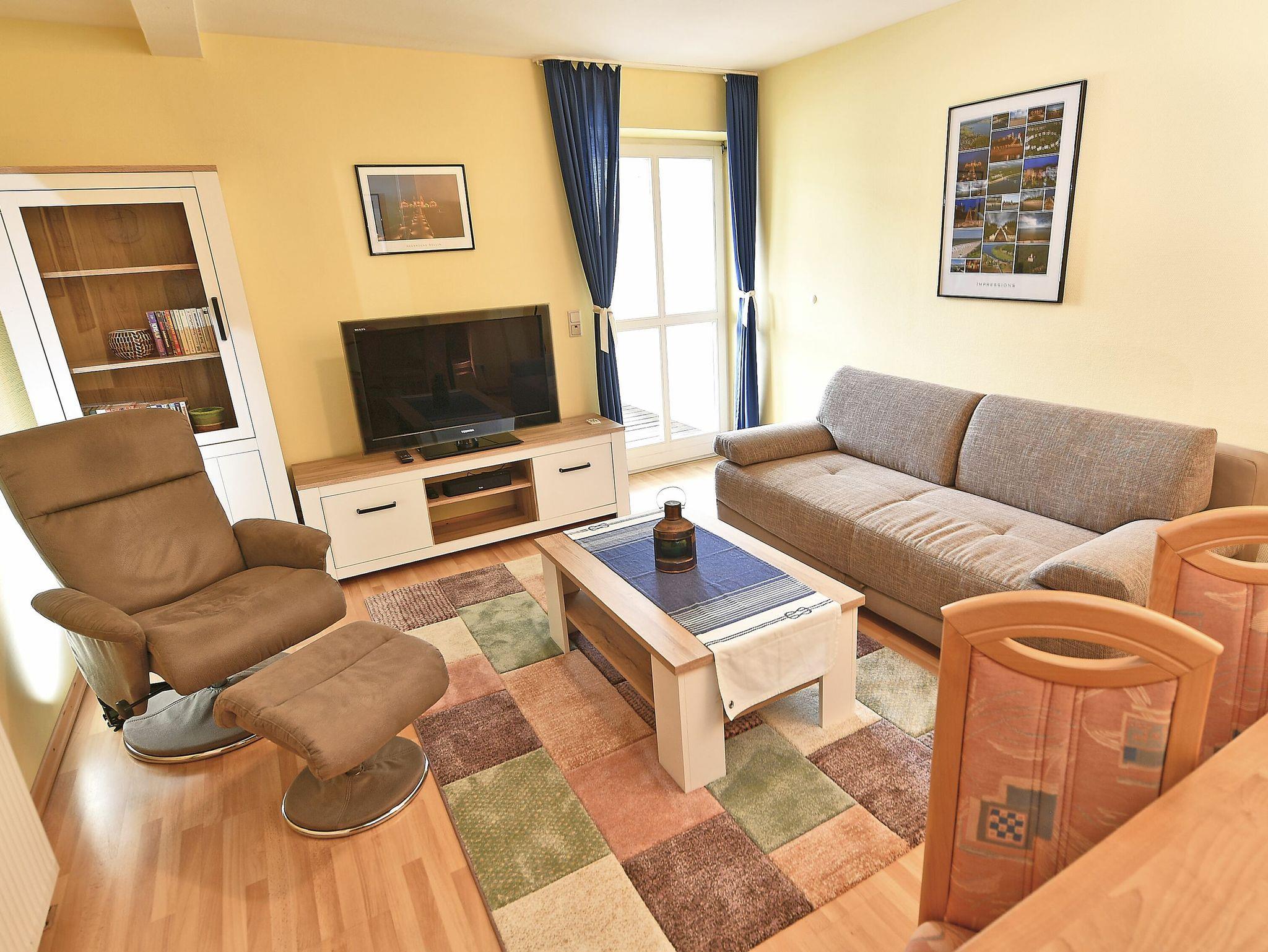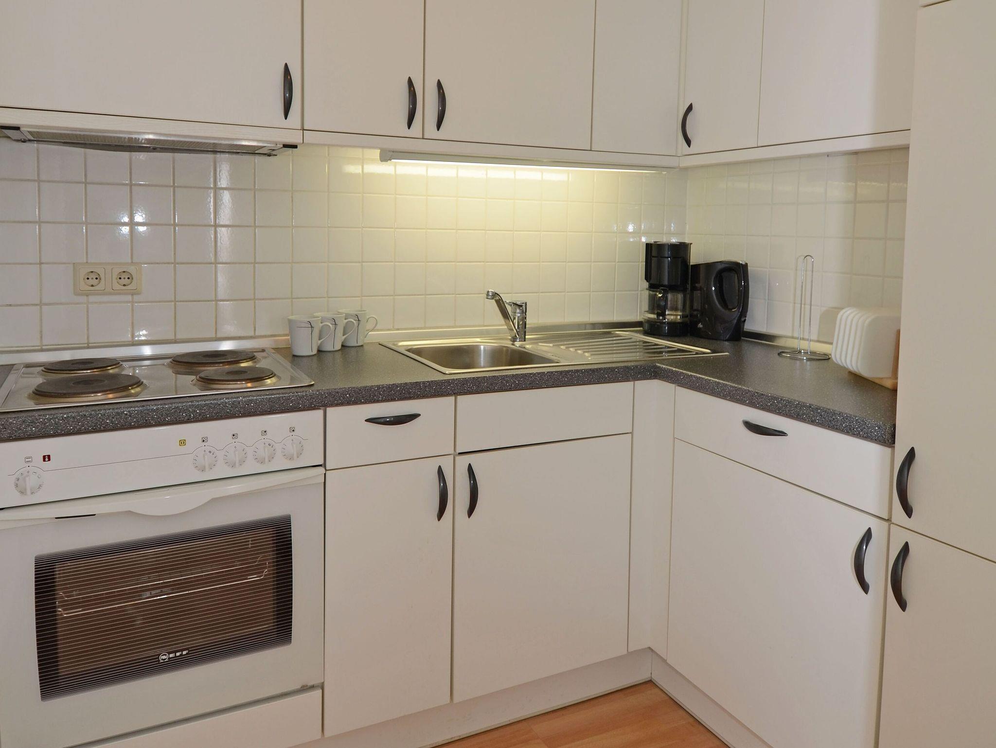 Vom Eingangsbereich aus gelangen Sie in den großen, modern und sehr gemütlich ausgestatteten Wohnbereich mit einer großen Sitzecke und einem Schlafsofa. Die Wohnung verfügt über eine separate Küche, die mit einem Kühlschrank mit Gefrierfach, einem Backofen, einem 4-Platten-Herd und diversem Kleininventar ausgestattet ist.