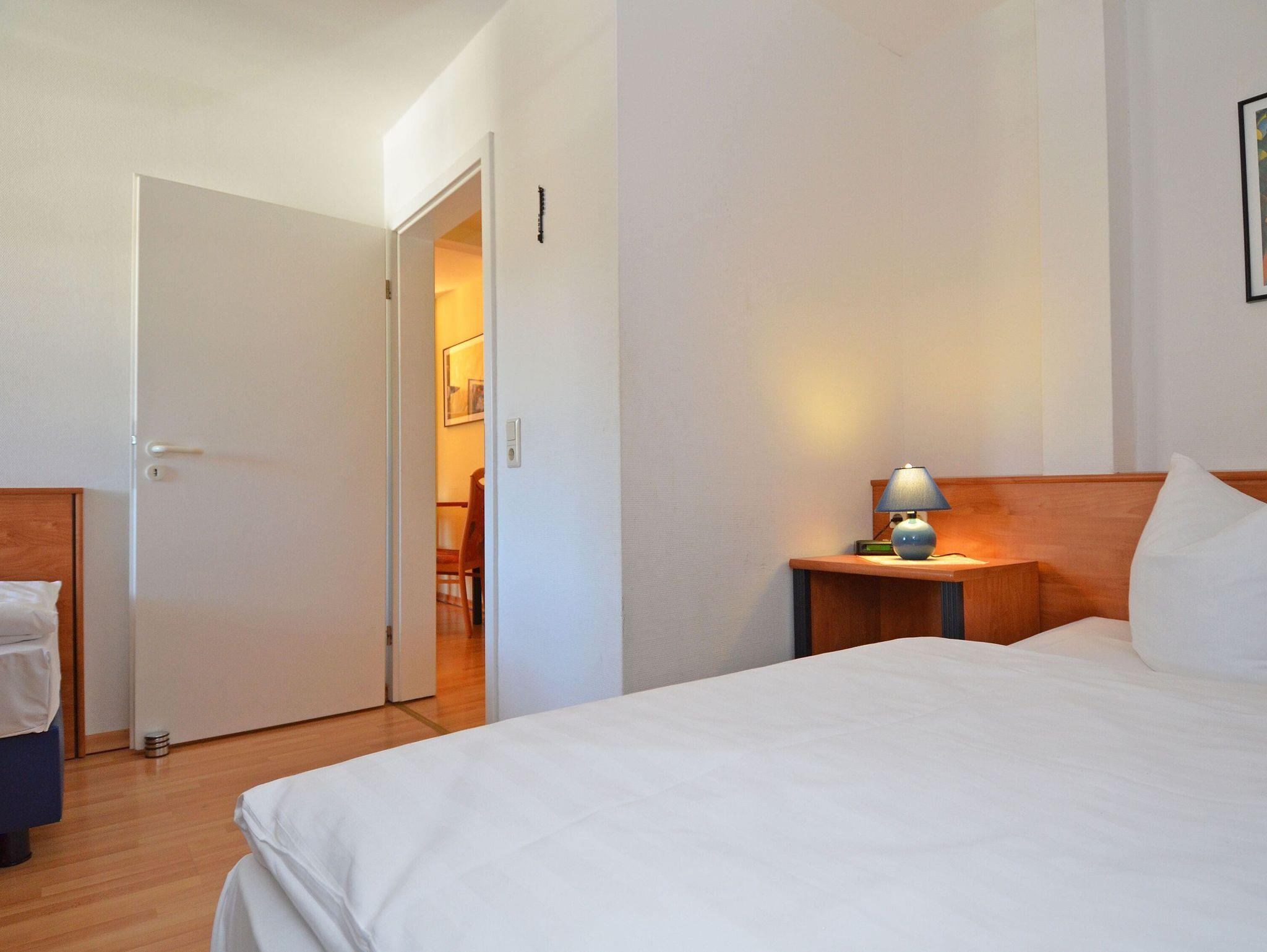 Das große Schlafzimmer mit Balkon ist mit einem Doppelbett ausgestattet und das zweite Schlafzimmer mit zwei Einzelbetten. Ein modernes Duschbad ist ebenfalls vorhanden.