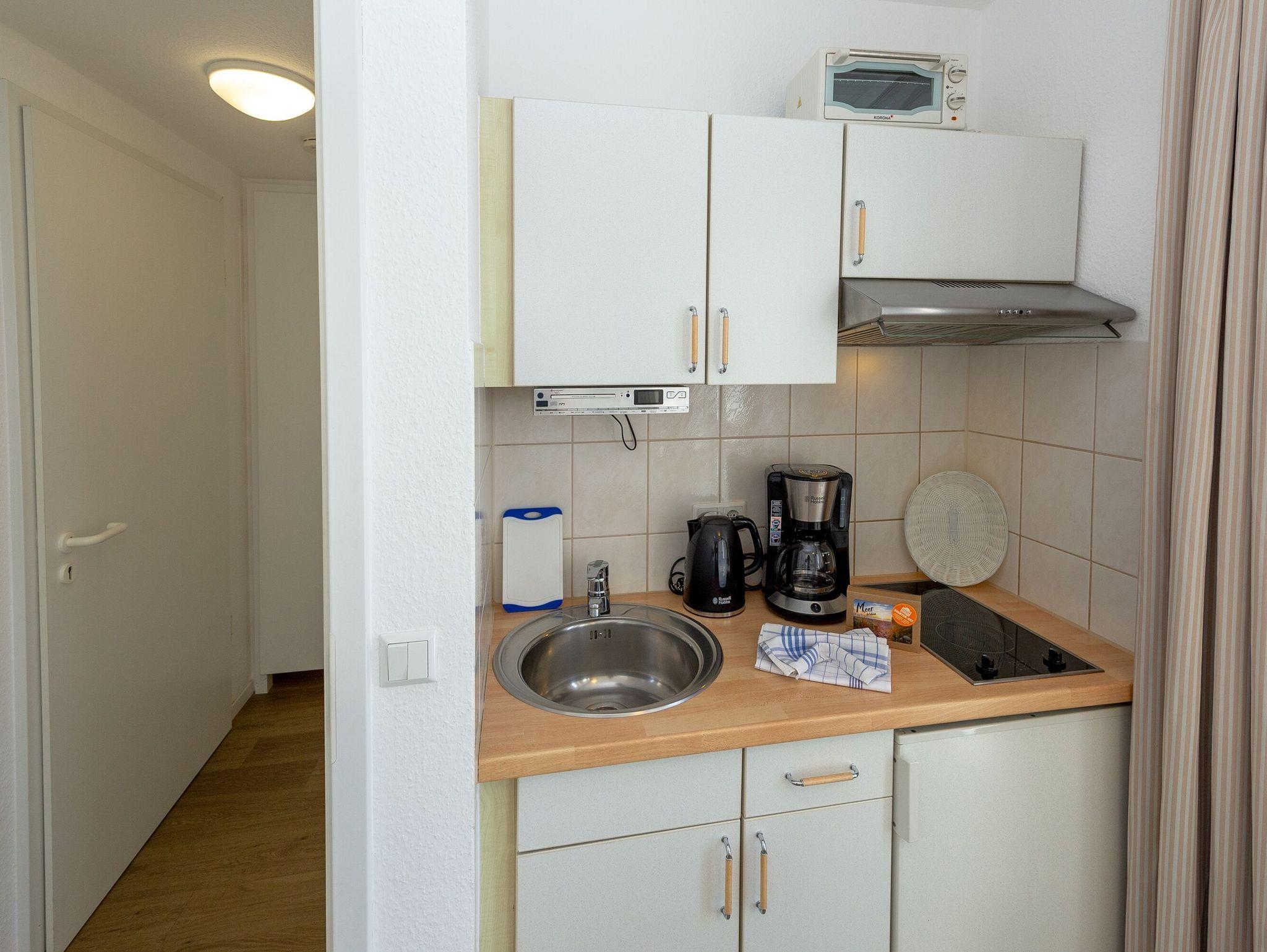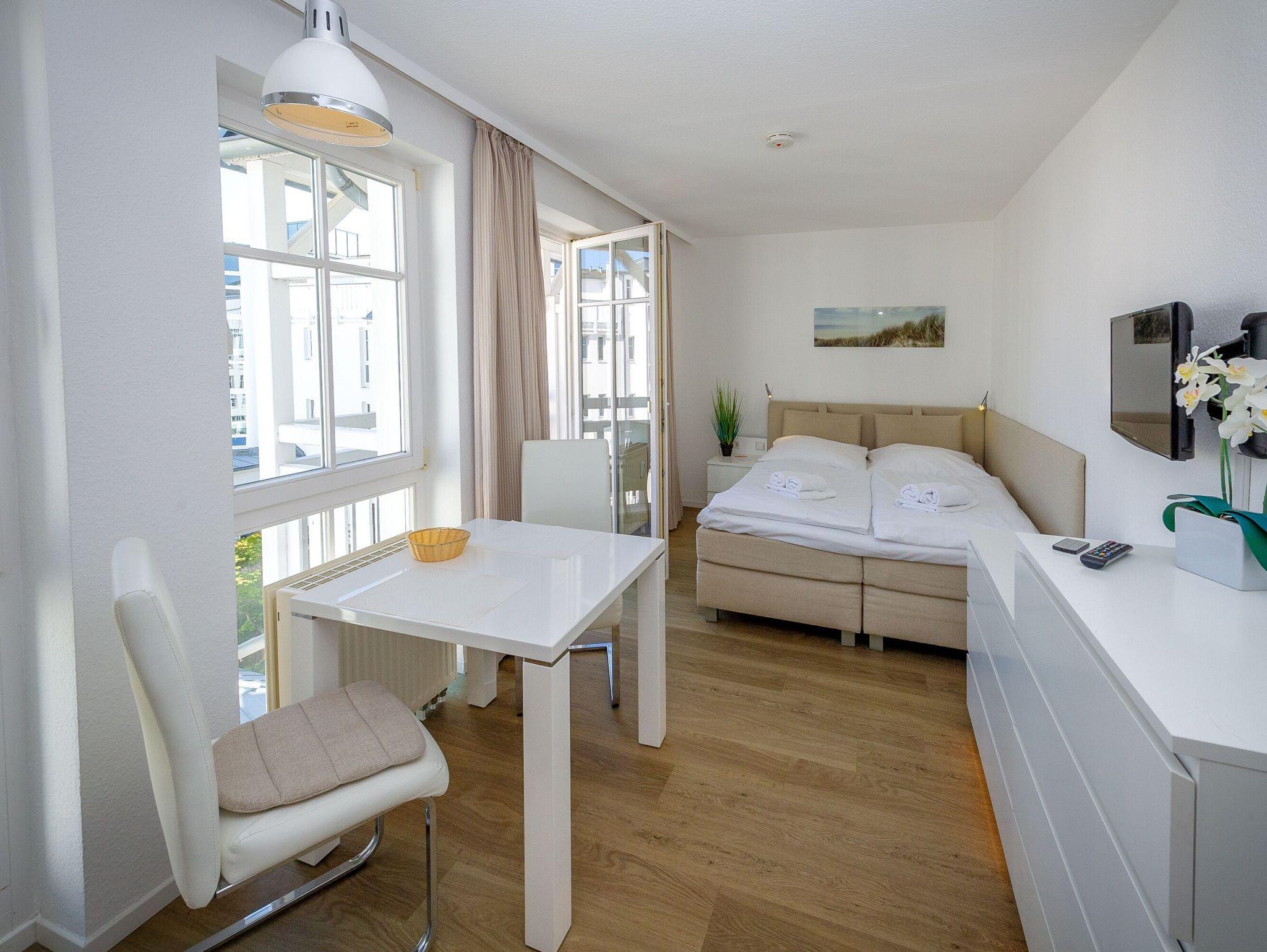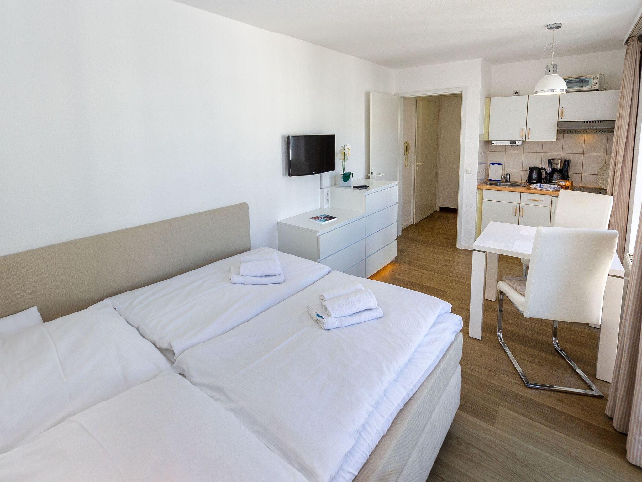 Die angenehm helle 1-Zimmer-Wohnung verfügt über einen kombinierten Wohn-/Schlafbereich mit einem kuscheligen Doppelbett (160 x 200 cm), einem Flachbild-TV, einem Radio und einer integrierten Küchenzeile.