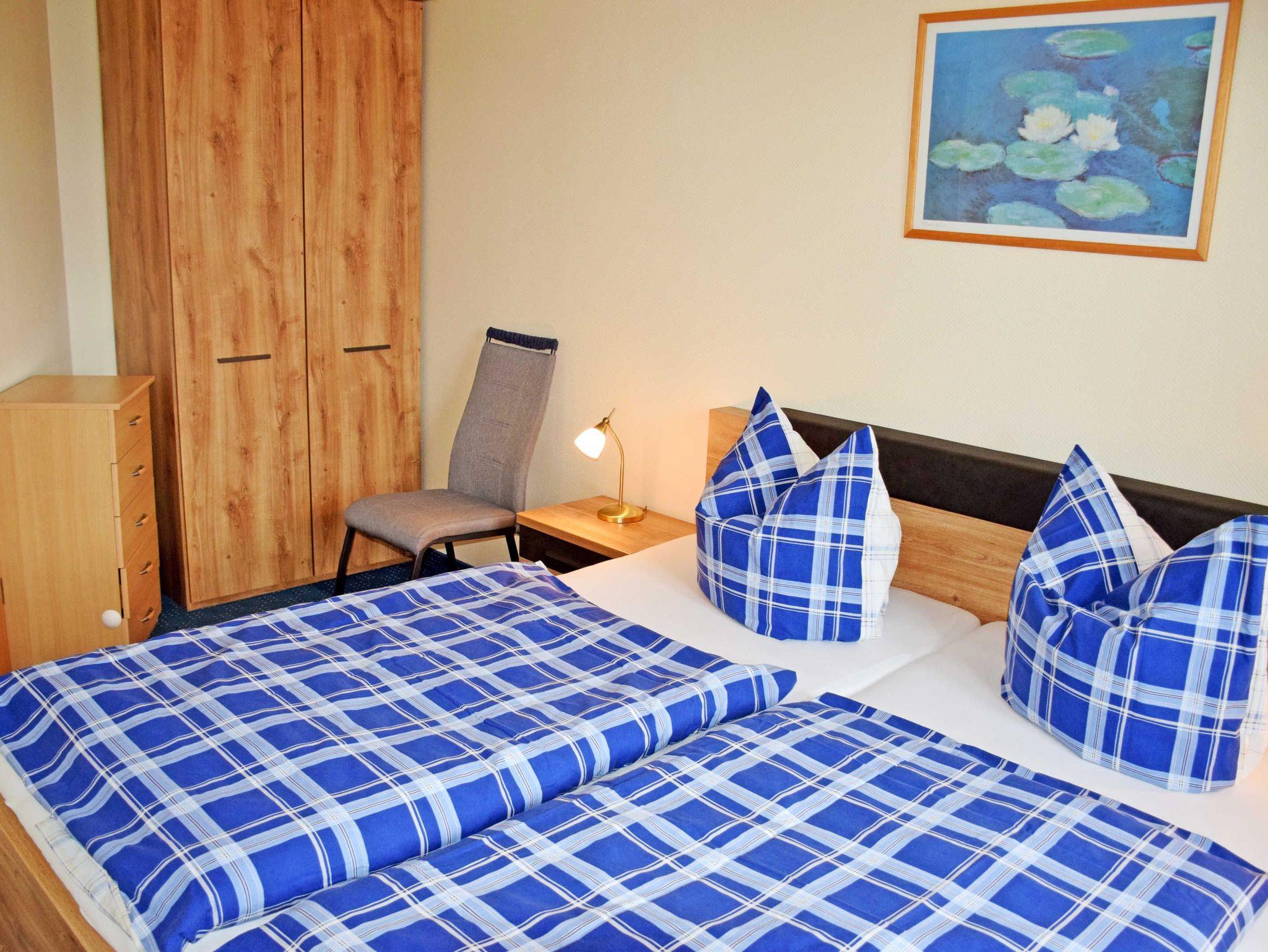 Das Ferienappartement (WLAN-Internetanschluss) bietet auf 58 qm Platz für 4 Gäste und hat einen Wohn- und zwei Schlafzimmer, Küchenzeile, sowie Bad mit Dusche und Wanne, Südterrasse mit Strandkorb.