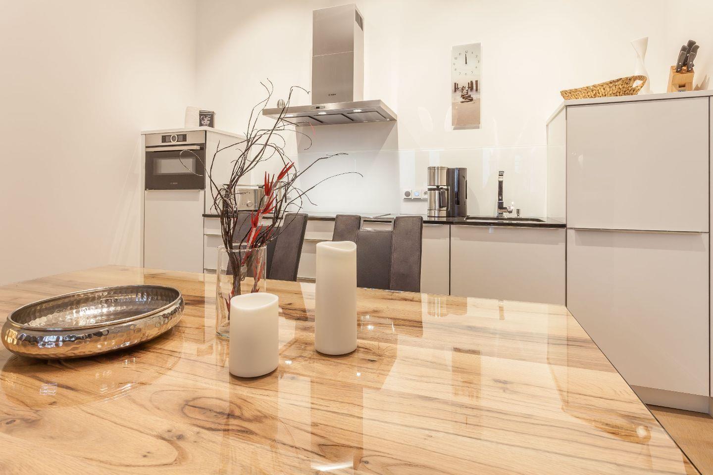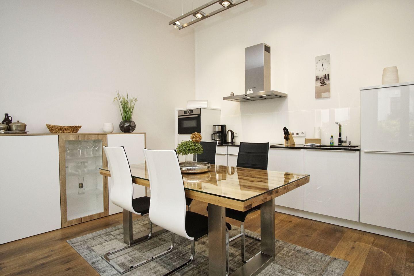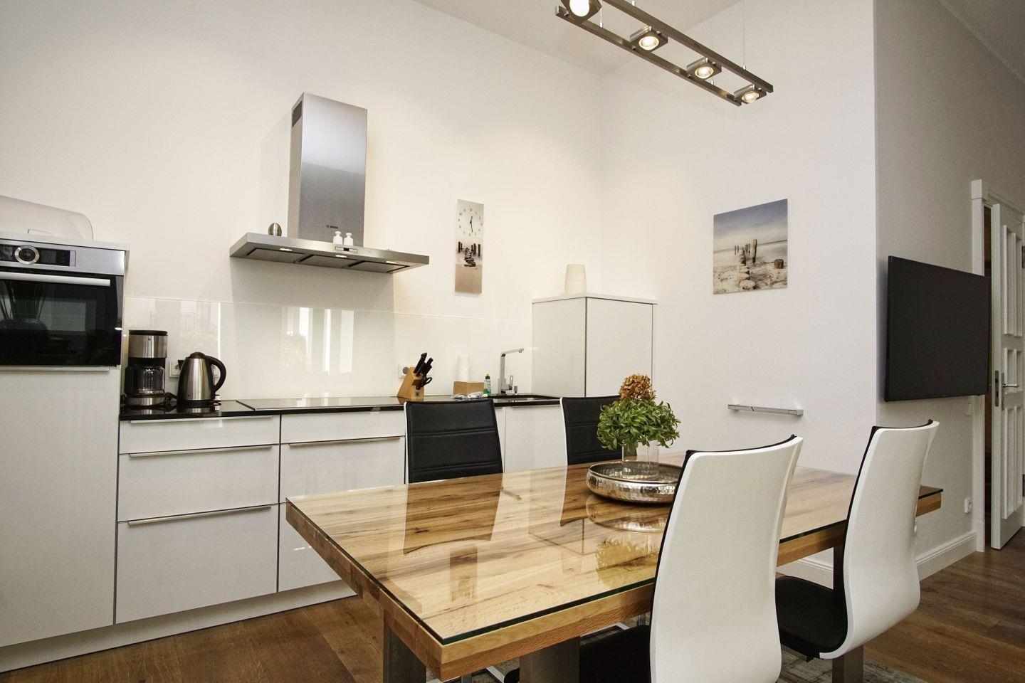 KÜCHE // offene Küche, 4-Platten Ceranherd, Spülmaschine, Kühlschrank mit Gefrierfach, Backofen, Mikrowelle, Toaster, Wasserkocher, Kaffeemaschine, reichlich Besteck, Geschirr und Küchenutensilien ++