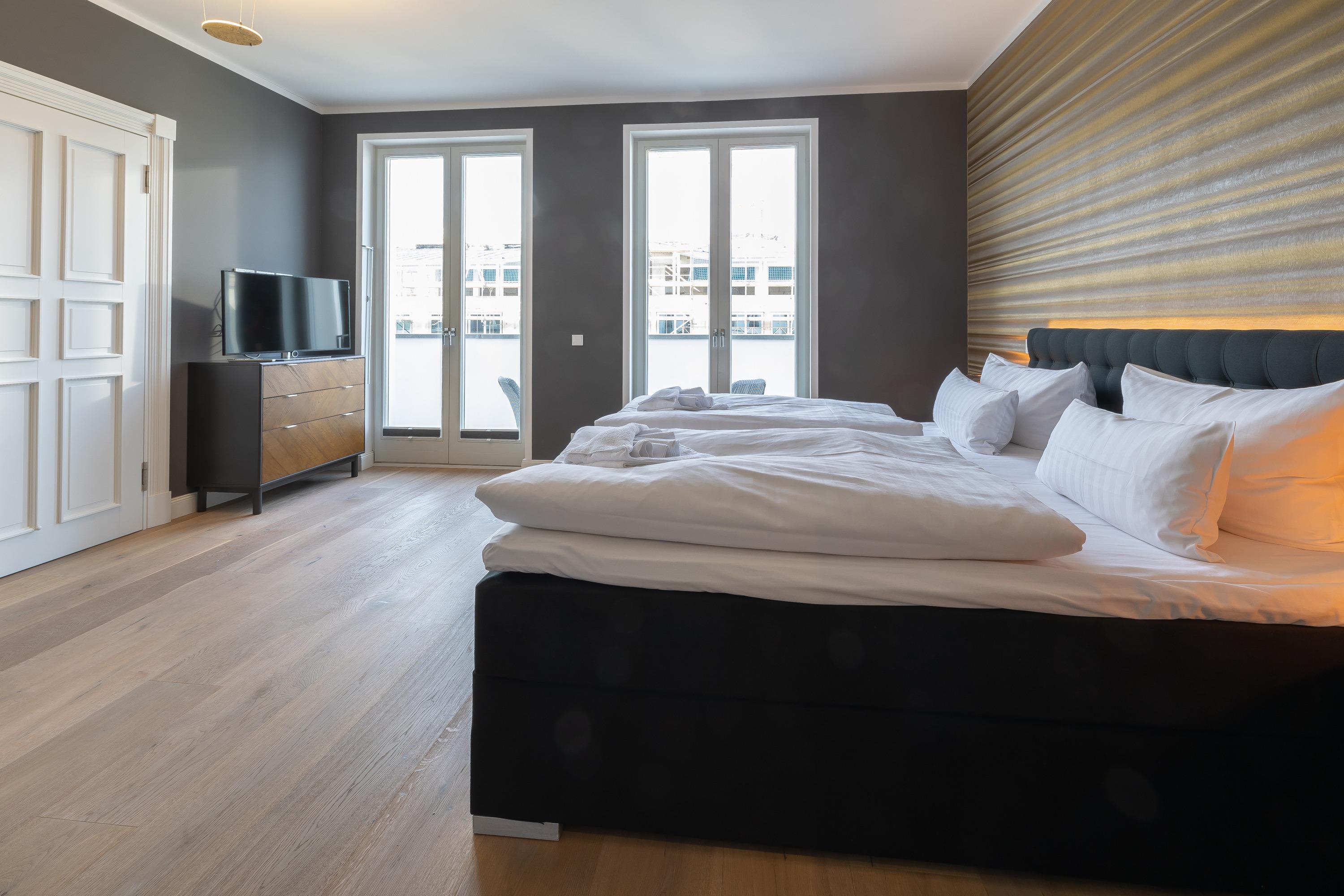 Zwei Schlafzimmer mit standesgemäßen Boxspringbetten in 180x200cm, großem Ankleideraum und LOEWE-Fernsehern bieten Ihnen den notwendigen Rückzugsraum. Von beiden Schlafzimmern aus lässt sich der riesige Balkon der Wohnung betreten, welcher neben dem fantastischen Meerblick auch einen Blick auf das bunte Treiben der berühmten Wilhelmstraße zulässt. Selbstverständlich lassen auch die beiden elegant gefliesten Badezimmer mit bodentiefer Dusche bzw. Badewanne, großzügigen Waschtischen, Kosmetikspiegel und Handtuchwärmer keine Wünsche offen.