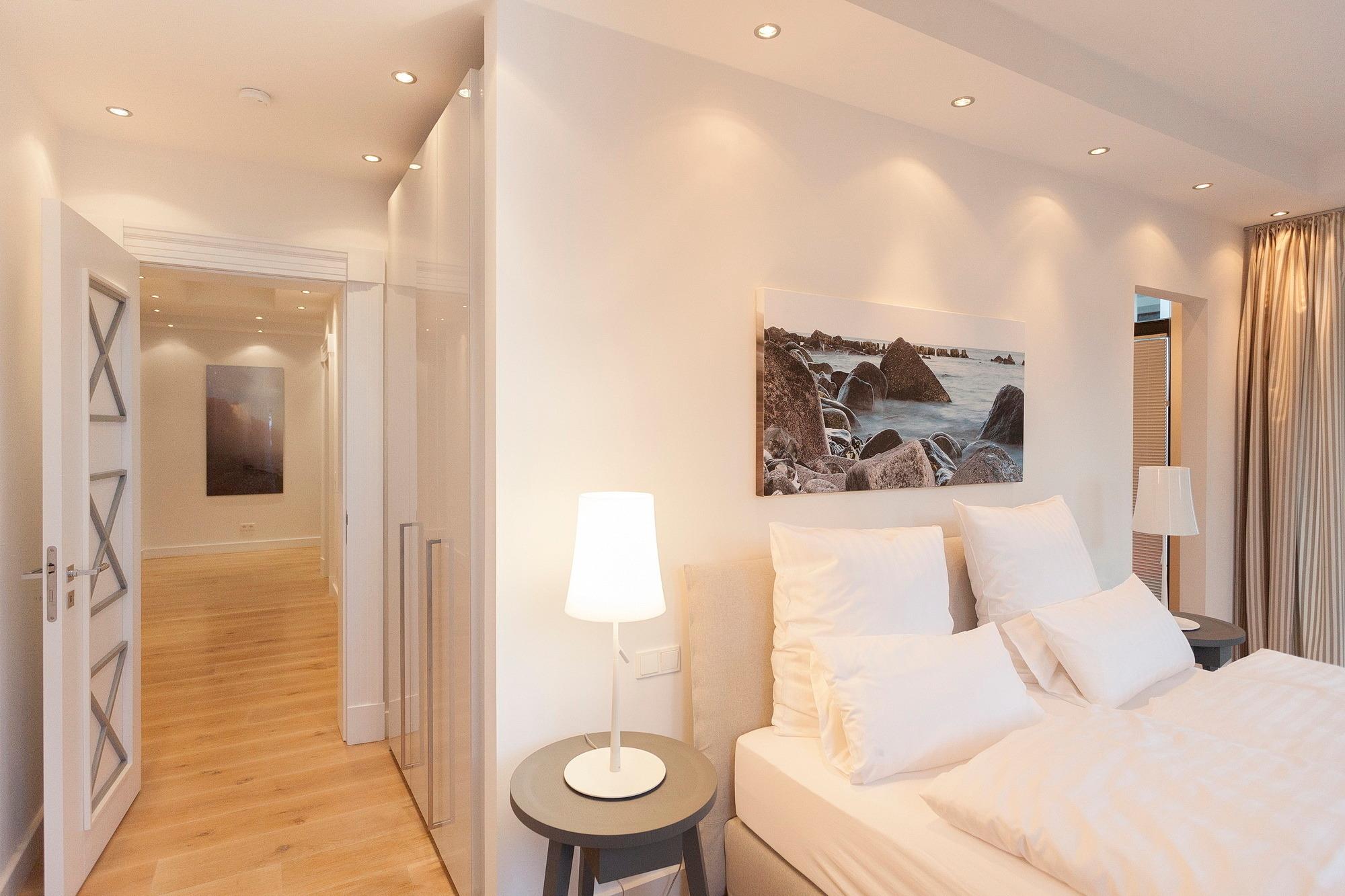 Drei stilvolle Schlafzimmer, zwei davon auf der Meerseite, alle ausgestattet mit Traumbetten von Schramm und großzügigen Einbauschränken werden jeweils von eigenen Ensuite-Bädern mit bodentiefen Duschen, Handtuchtrocknern, Kosmetikspiegeln und Dornbracht-Armaturen ergänzt.