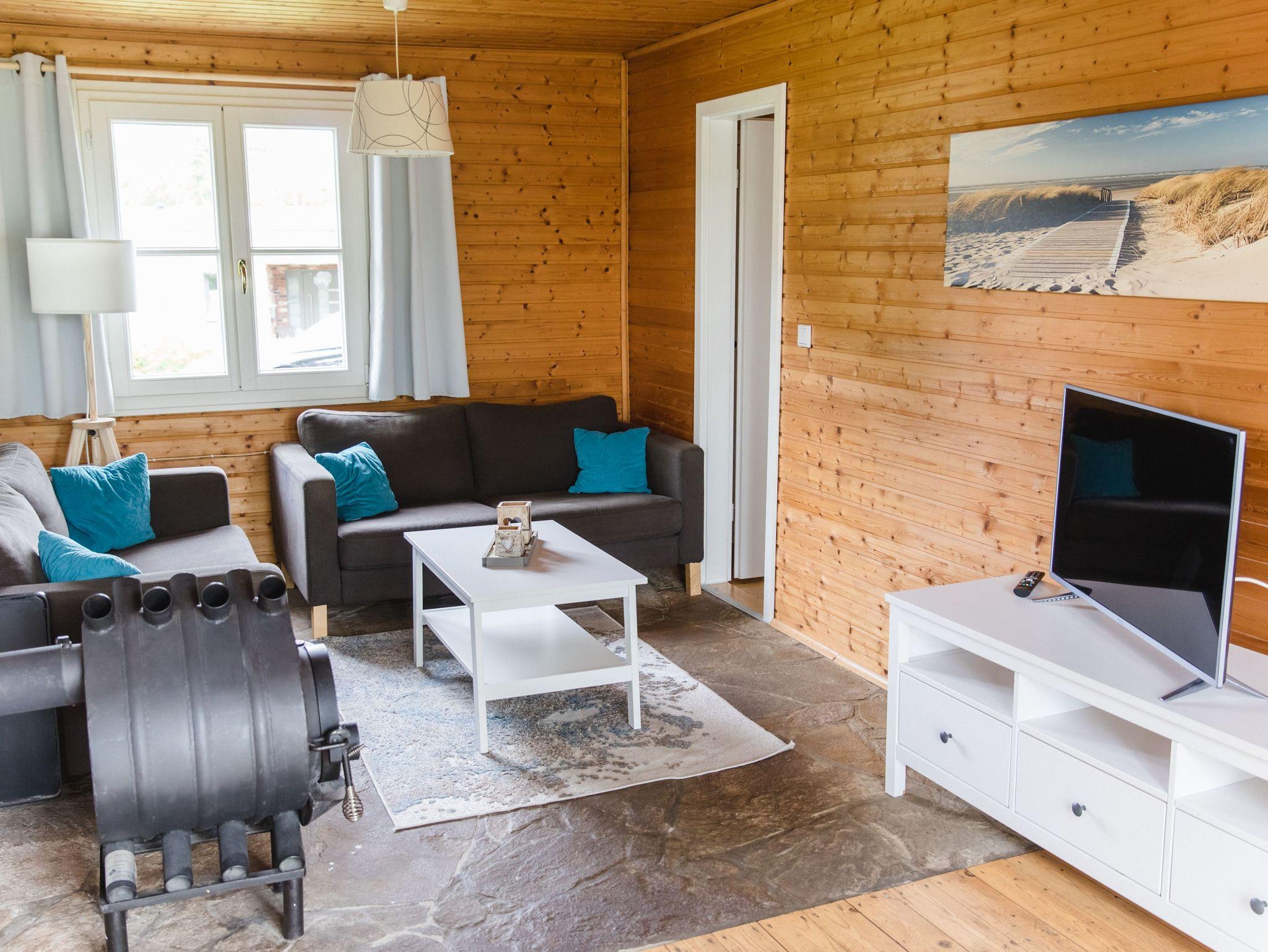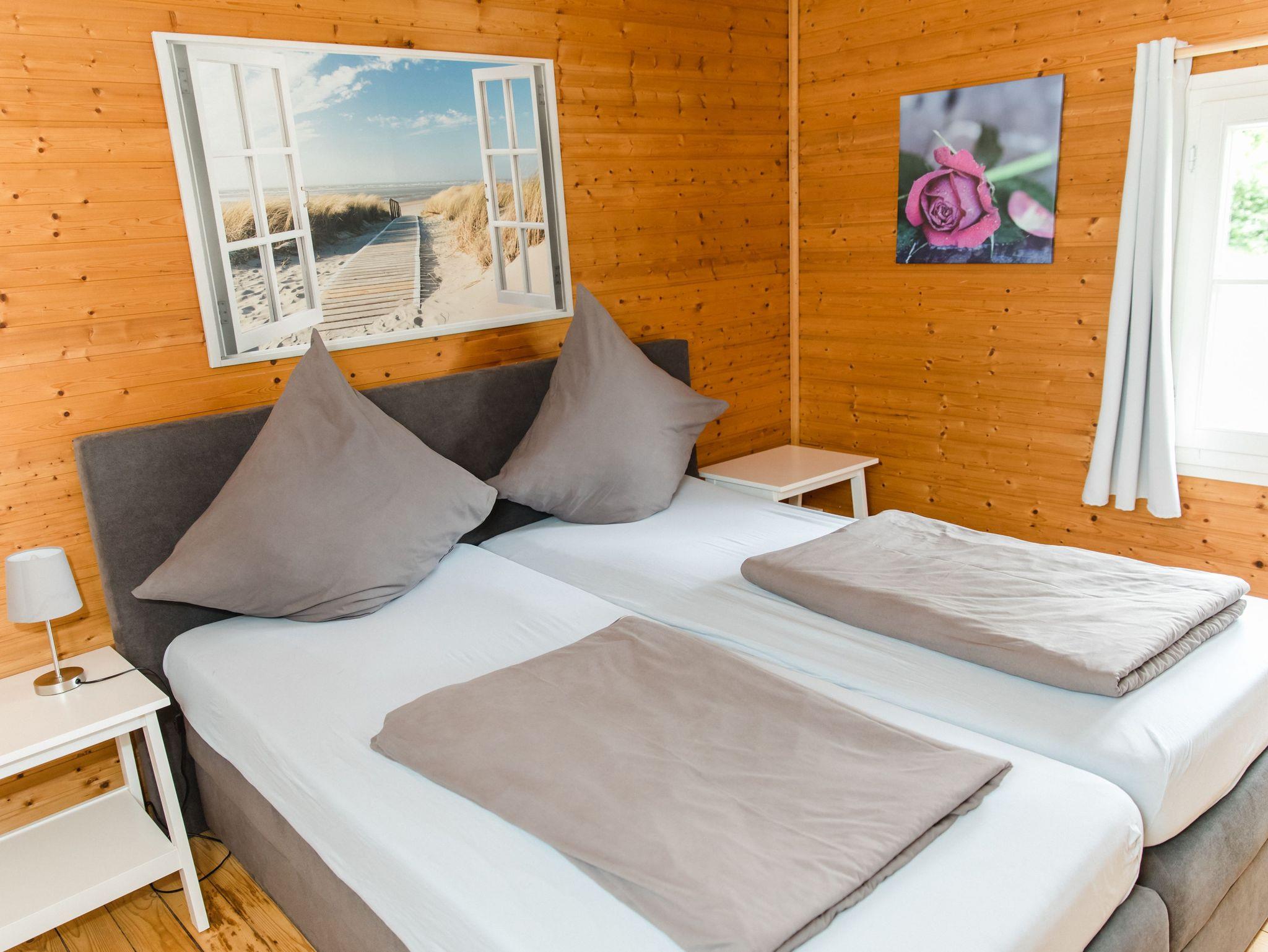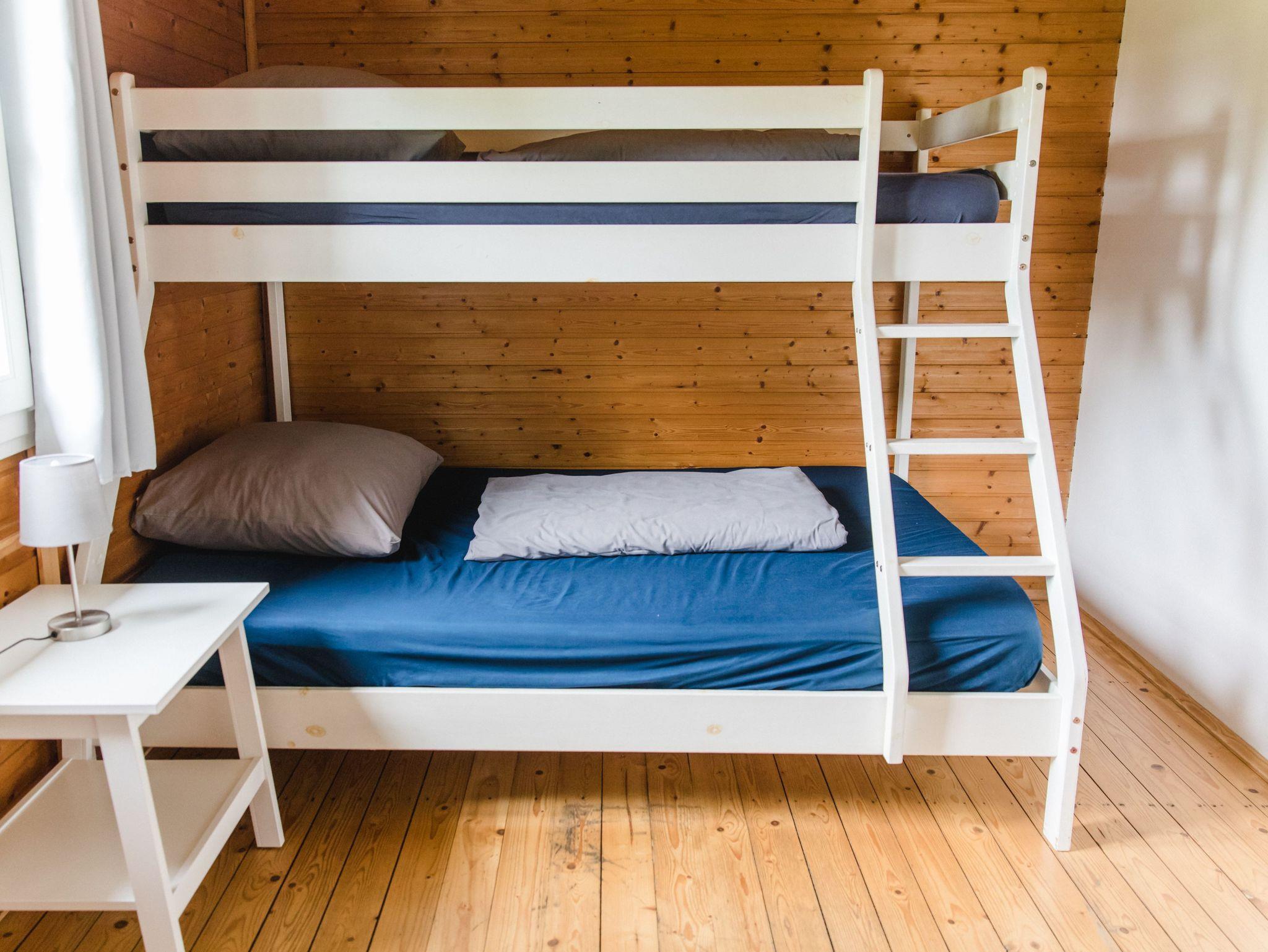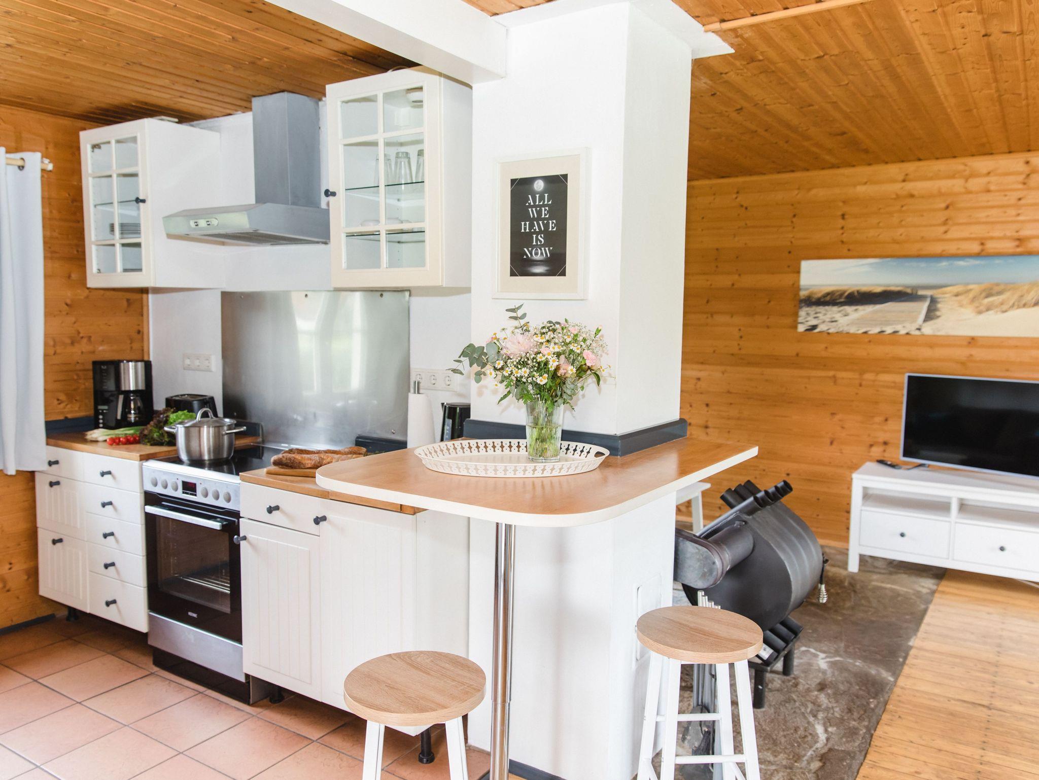 Das Ferienhaus direkt am See besteht aus einem gemütlichen Wohn-Essbereich mit offener, voll ausgestatteter Küche. Es gibt zwei Schlafzimmer, eines mit Doppelbett und eines mit einem Hochbett, wobei die untere Liegefläche 1,40 m x 2,00 m misst. Ein gemütliches Duschbad vervollständigt die schöne Ausstattung des Ferienhauses, welches natürlich auch über kostenloses W-LAN verfügt.