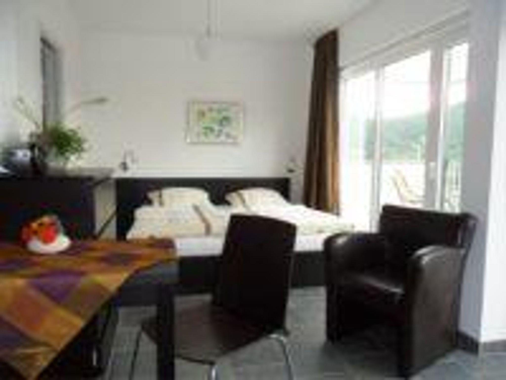 Helles 1-Raum-Appartement (30 qm), Dusche/WC, voll eingerichtete Kochnische, Doppelbett, Schlafsofa als zusätzliche Schlafmöglichkeit, Balkon mit Panoramablick ins Moseltal, WLan, Radio/CD