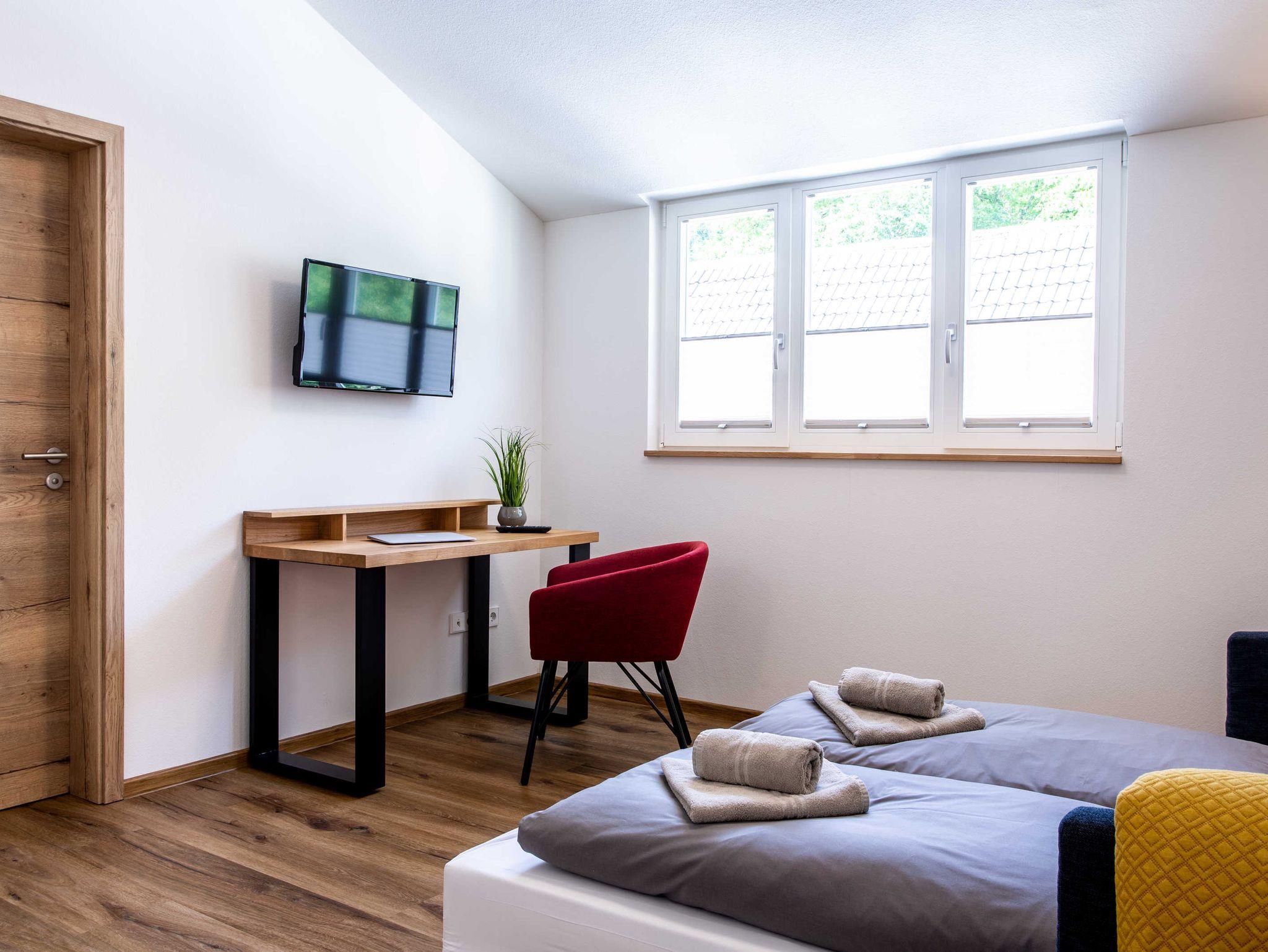 Die Ferienwohnung Weißbuche ist die zweite geräumige Wohnung im Dachgeschoss. Man hat einen schönen Blick auf den Wald, ob beim Kochen oder aus dem Schlafzimmer heraus.