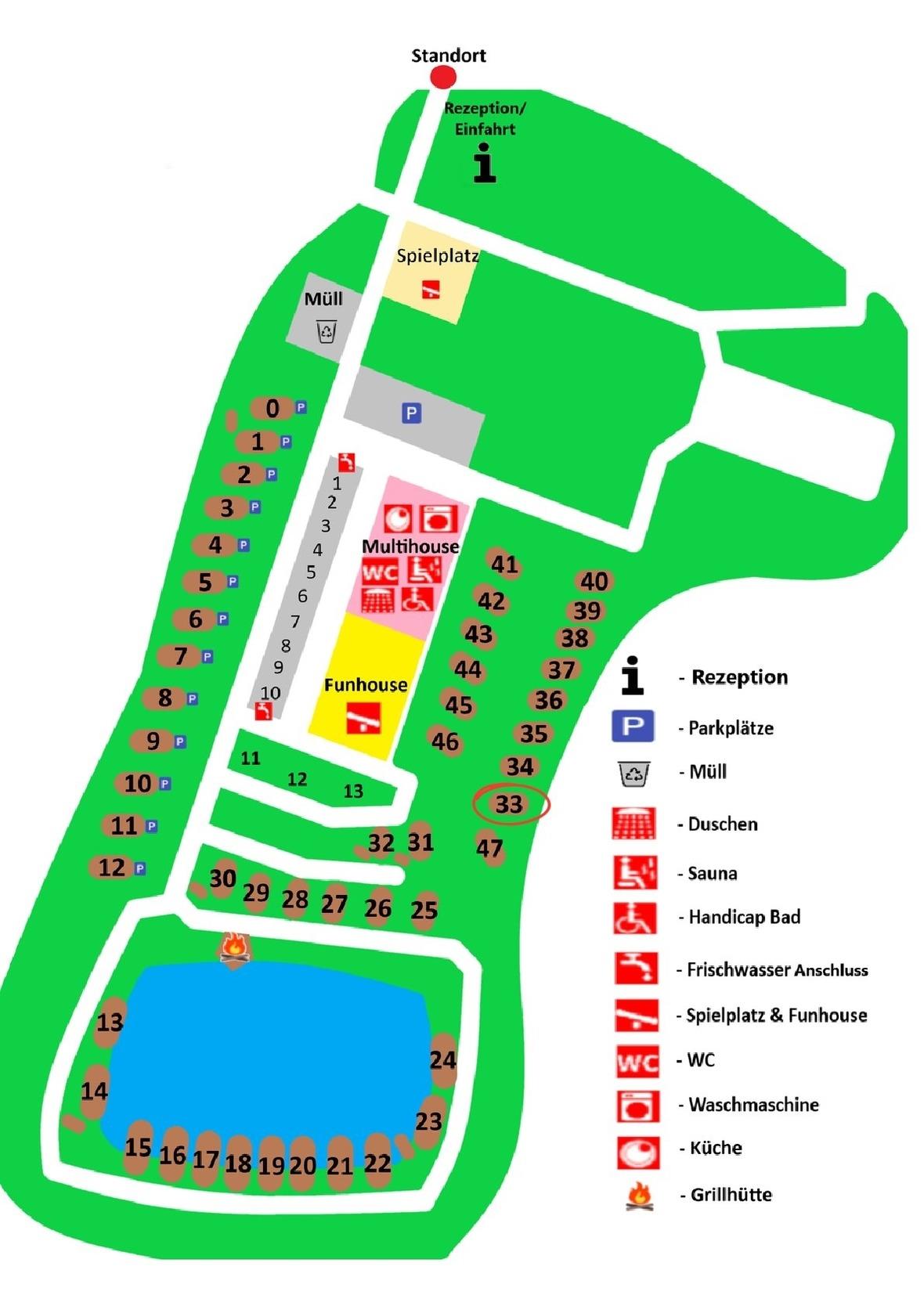 In unserm Multihouse, direkt über die Wiese zu erreichen, befinden sich die Sanitäranlagen und eine Küche mit Münzbetrieb.