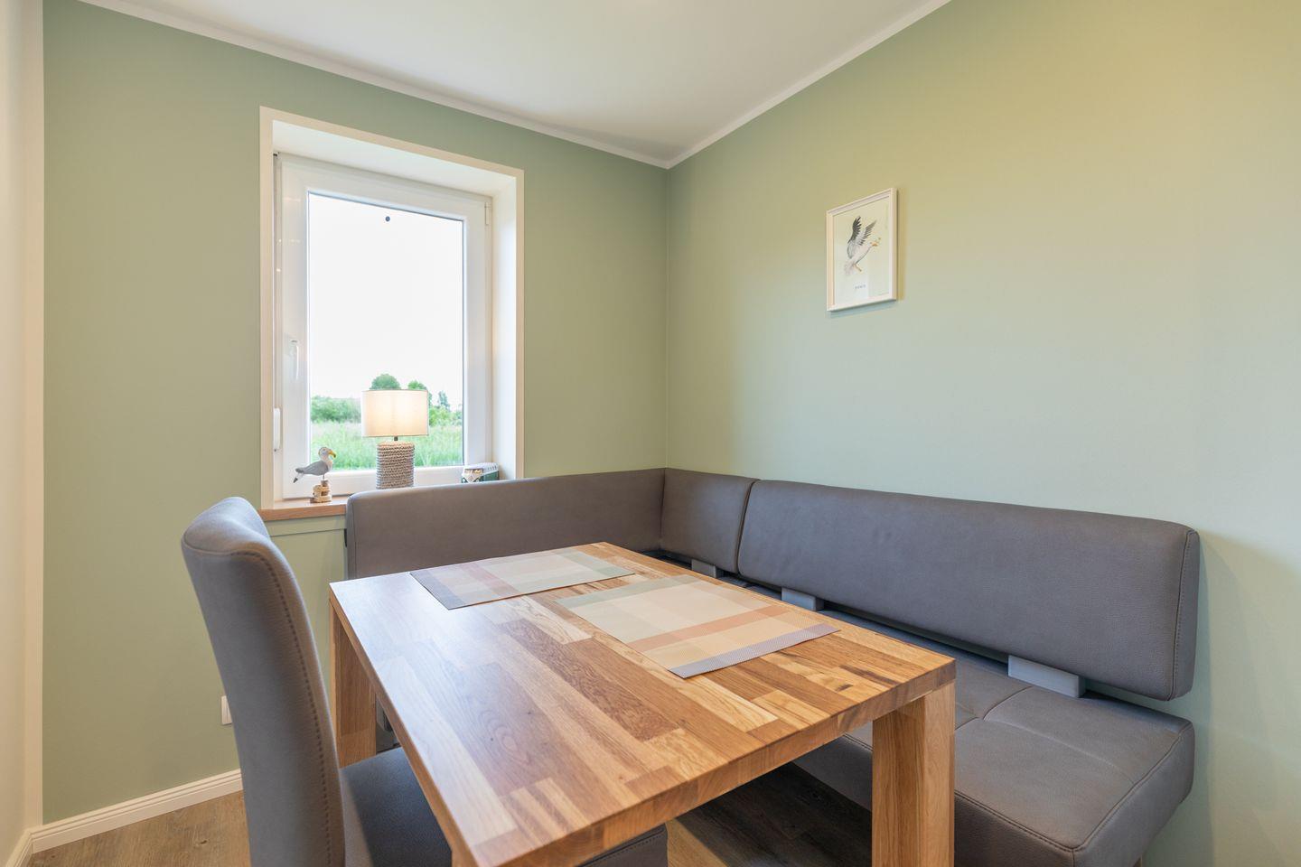 „De lütte Mööv“ bietet im Erdgeschoss eine voll ausgestattete Küche mit gemütlicher Sitzecke, in der von Kaffeemaschine und French-Press, über Toaster und Tupperware bis Auflaufformen alles an Bord ist. Das gemütliche Wohnzimmer ist mit waipu.tv und einer Sony Playstation 4 inklusive Blu-ray-Player ausgestattet. Dank Glasfaseranschluss ist man digital ganz fix unterwegs. Das Schlafzimmer bietet ein Doppelbett (160 x 200) und viel Stauraum im Wandschrank. Das kleine Bad verfügt über eine Dusche und WC.
