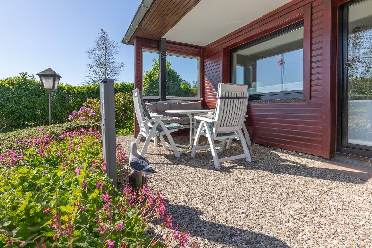 Eine große überdachte Terrasse mit Gartenmöbeln und Grill, viel Rasen und schöne Plätze laden zum Verweilen ein. Weil das Grundstück nicht umzäunt ist, gibt es auf der Terrasse die Möglichkeit, einen kleinen Teilbereich für den vierbeinigen Gast mit einer Seitenmarkise abzusichern.