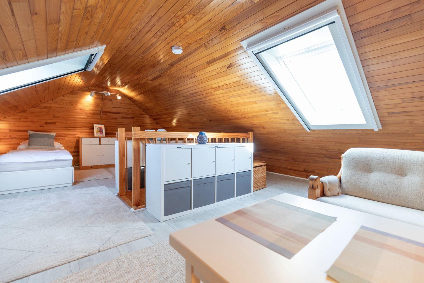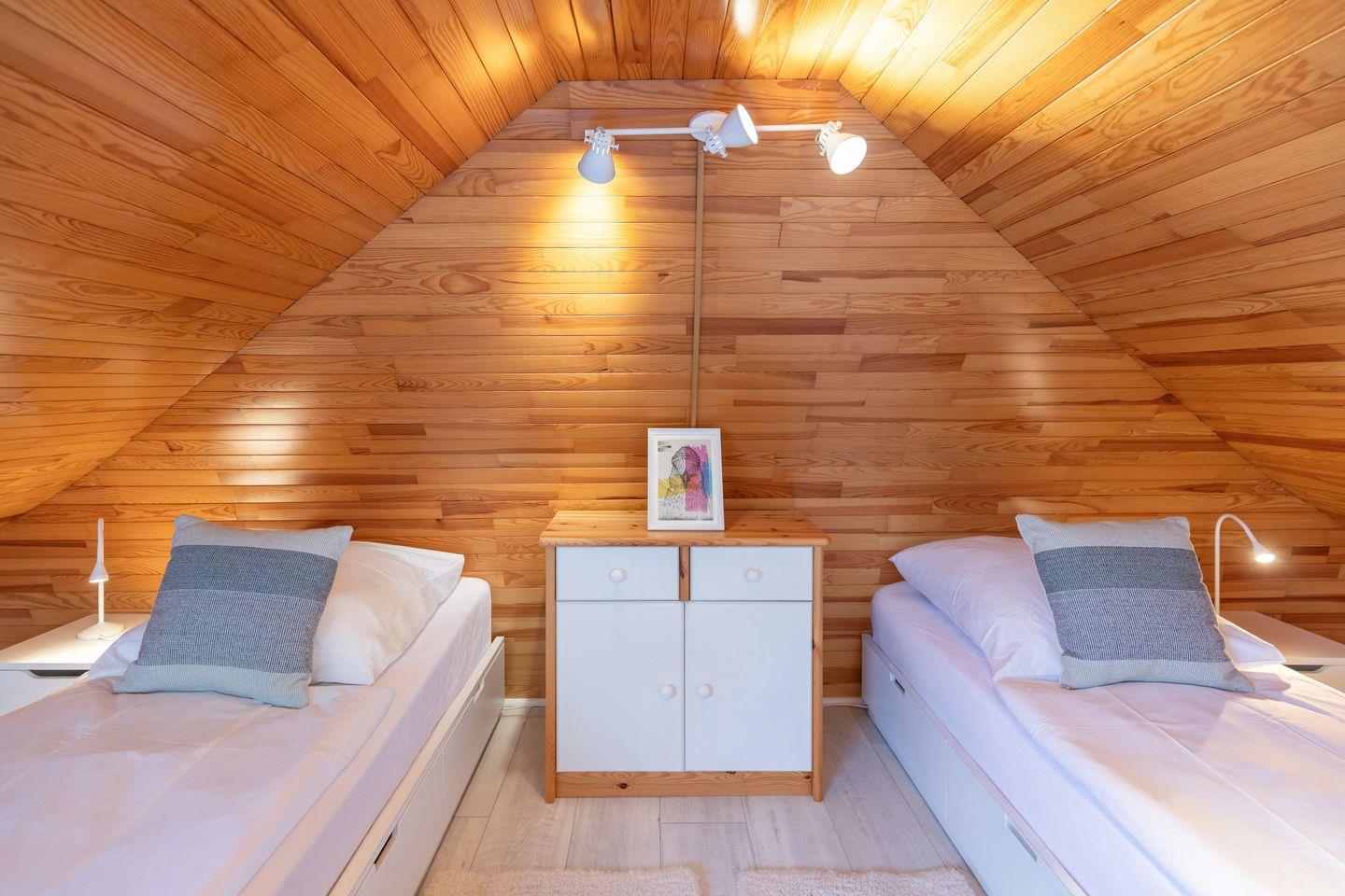 Über eine Holztreppe gelangt man in die offene, zweite Etage. Hier finden sich zwei Einzelschlafplätze (90 × 200) mit Stauräumen, sowie eine kuschelige Sitz- und Spielecke. Das Regal ist hier gefüllt mit Spielen, Büchern und Puzzles. Unter dem Spitzdach mit großen Dachfenstern befindlich, gibt es zwar nur eine Stehhöhe von maximal 1,93 Metern, aber dafür einen hohen Gemütlichkeitsfaktor.