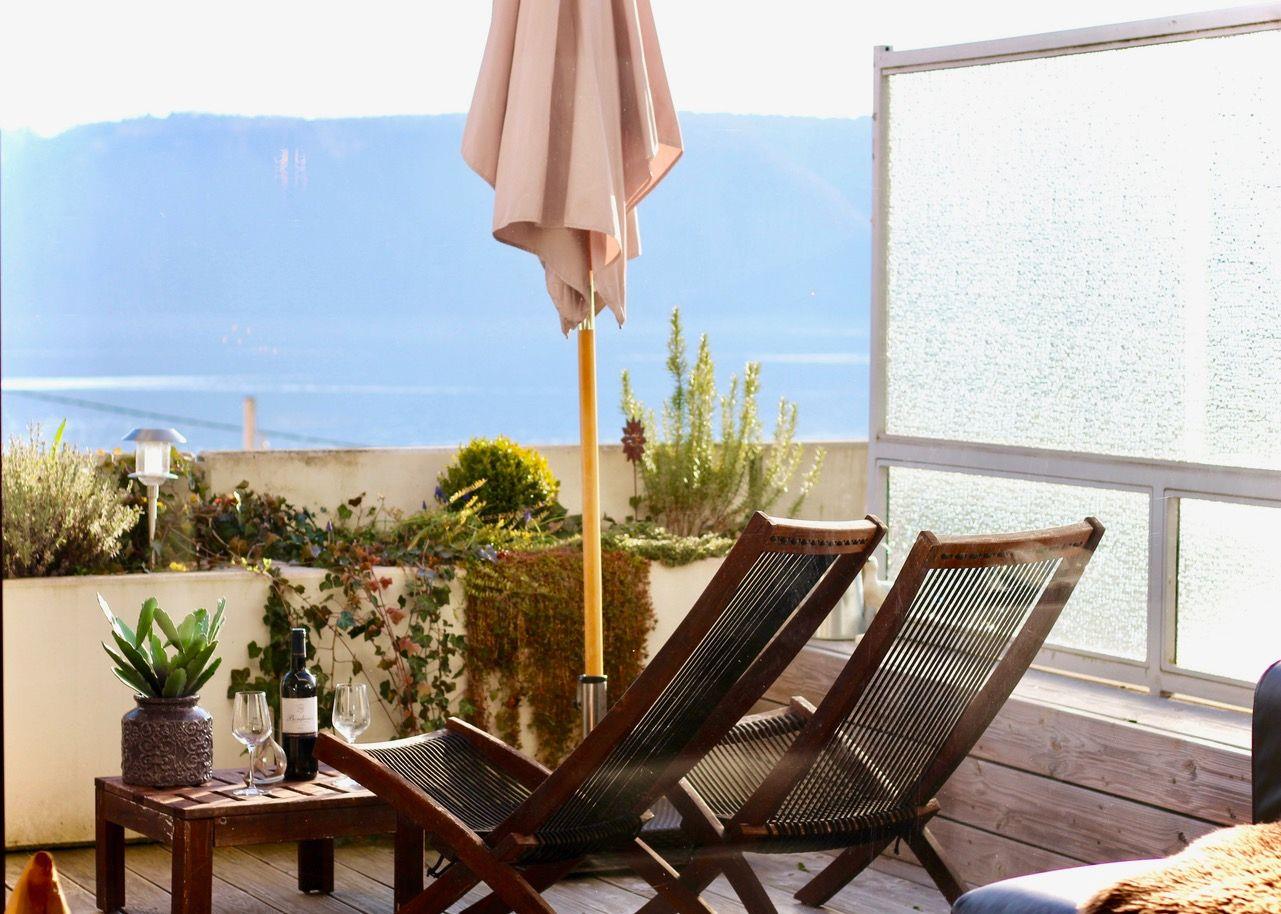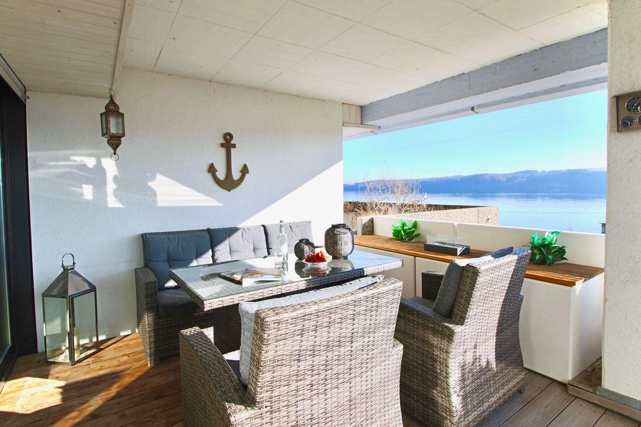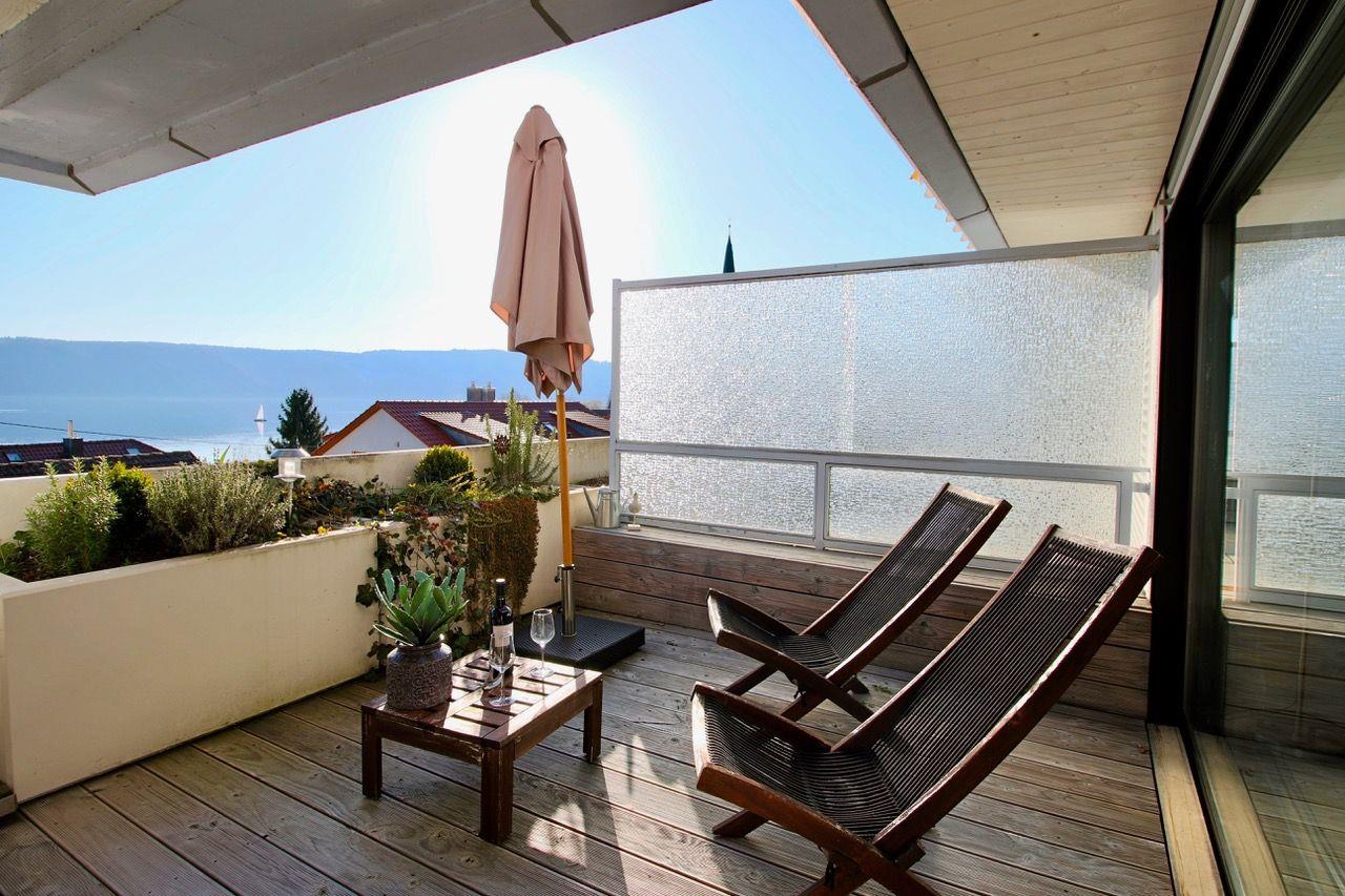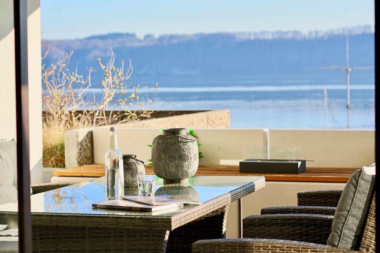 Die Ferienwohnung erstreckt sich über 65 Quadratmeter und bietet Platz für 2 bis 4 Personen. Der absolute Höhepunkt dieser Wohnung ist zweifelsohne die private Terrasse, die einen direkten Blick auf den Bodensee gewährt. Hier können Sie entspannte Stunden verbringen, sei es beim Sonnenbaden auf den bequemen Liegen, im Schatten des Schirms oder bei gemütlichen Mahlzeiten an der stilvollen Rattan-Essgruppe.