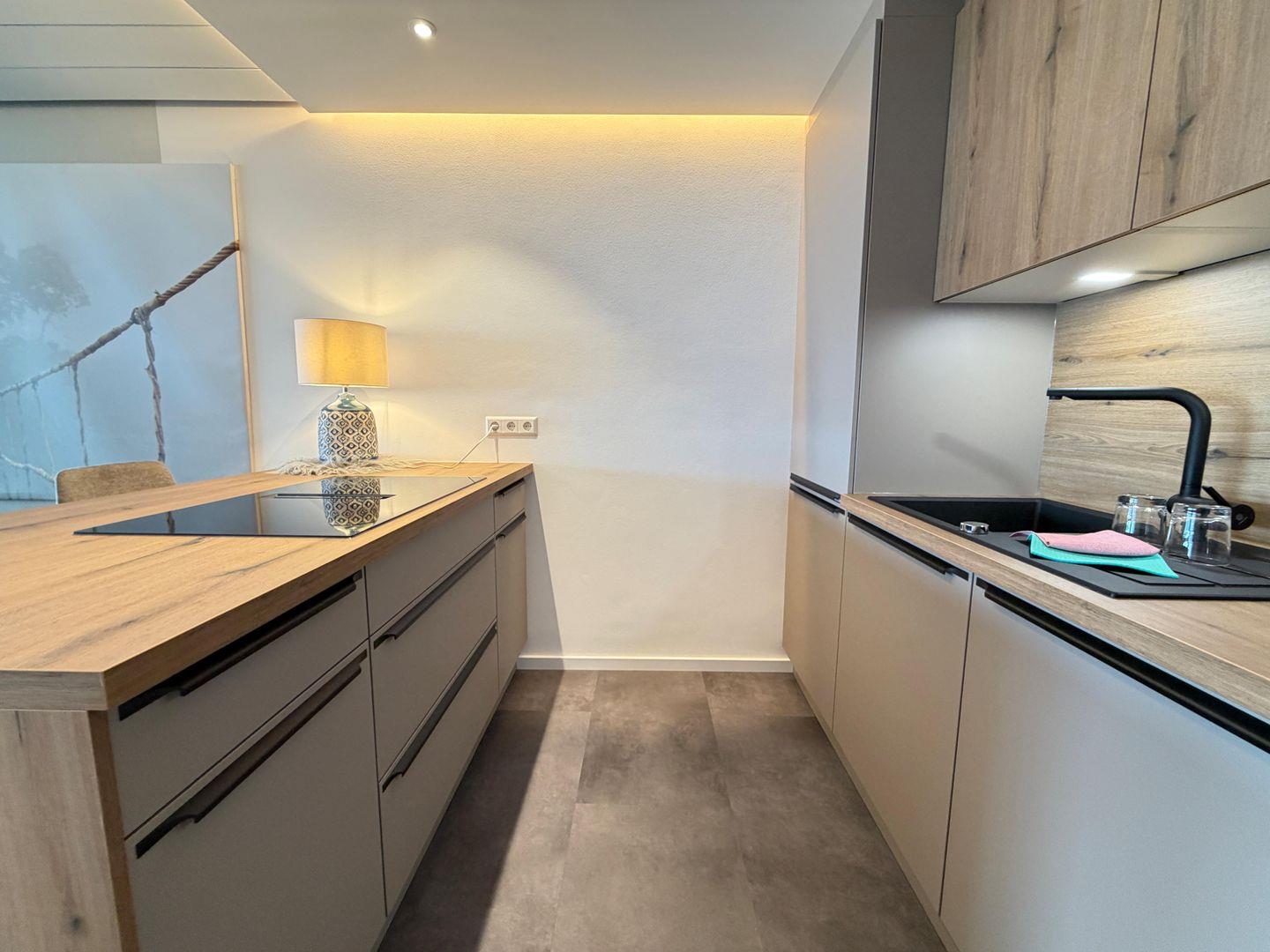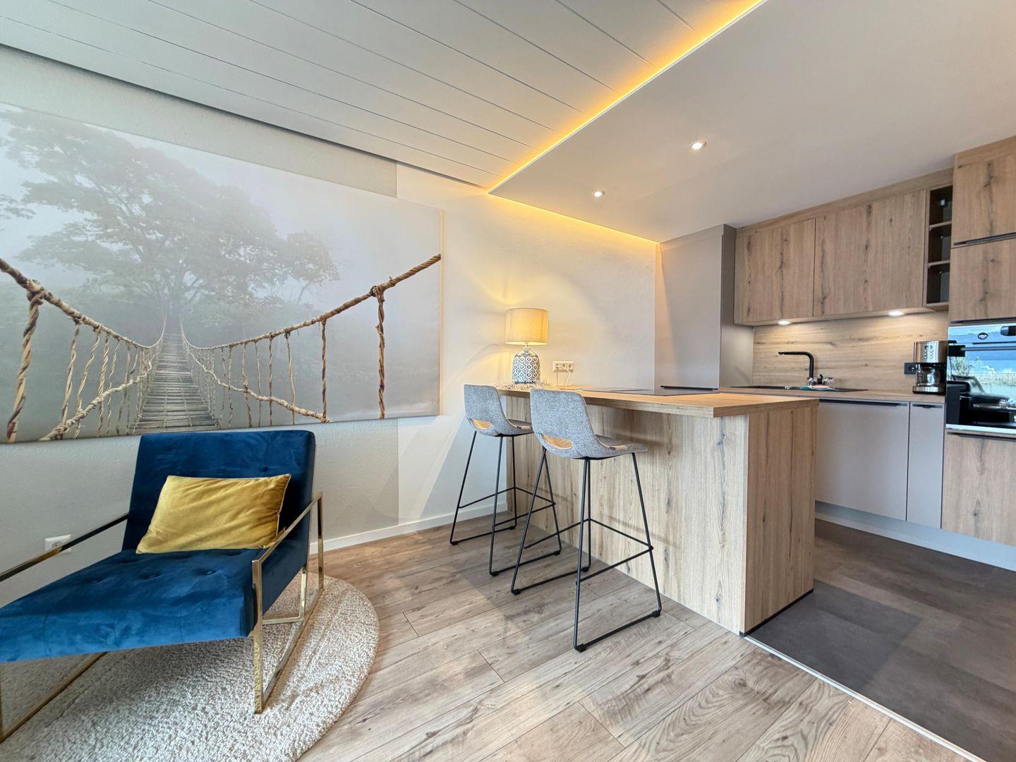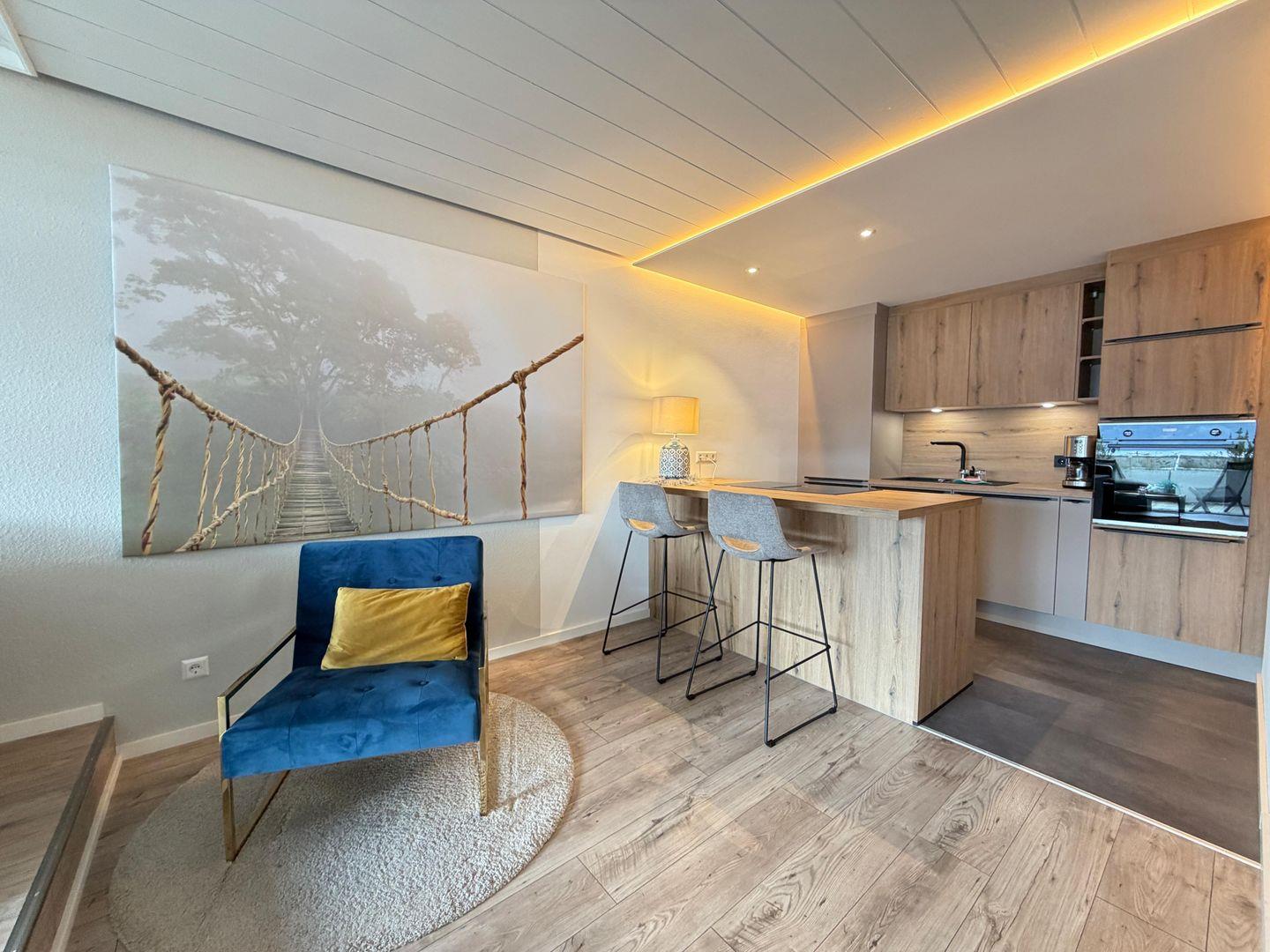 Der lichtdurchflutete Wohnbereich besticht durch eine großzügige Fensterfront, die den Blick auf den See auch im Inneren erlebbar macht. Die moderne Einrichtung mit Holz-Akzenten schafft eine warme und einladende Atmosphäre. Hier finden Sie eine komfortable Wohnlandschaft mit Schlaffunktion, einen Flachbildfernseher und eine Essgruppe für bis zu vier Personen. Eine Relaxliege lädt zum Verweilen ein, während die offene Küche mit einem Küchentresen alle Annehmlichkeiten für die Zubereitung köstlicher Mahlzeiten bietet. Die Küche ist voll ausgestattet und lässt keine Wünsche offen.