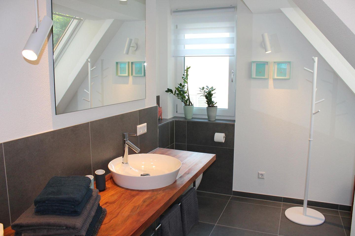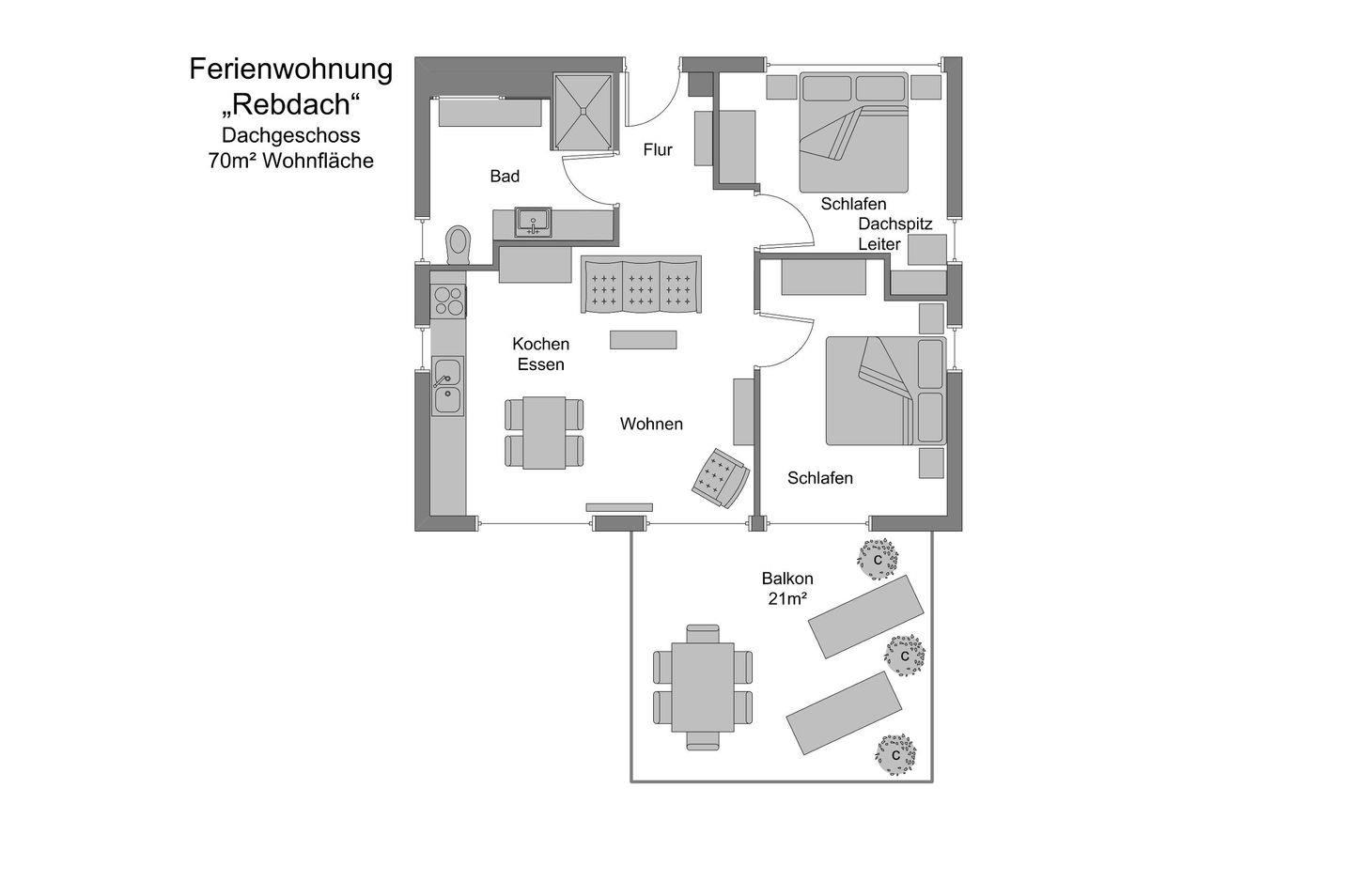 Die Ferienwohnung Rebdach liegt im Dachgeschoss des Ferienhauses Rebhaus. Sie ist 70 m² groß und besitzt einen sehr großen Balkon mit traumhaftem Ausblick. Von dieser Wohnung aus kann der Blick über den idyllischen Dorfkern von Sipplingen hinweg zum gegenüberliegenden Ufer des Bodensees bis zur Ortschaft Bodman schweifen. Die 3-Zimmer-Wohung hat 2 Schlafzimmer, die mit je einem Doppelbett (160x200cm / 180x200cm) ausgestattet sind. Der offene Wohn- Essbereich mit integrierter Küche ist stilvoll eingerichtet und hat durch die freigelegte sichtbare Dachkonstruktion im offenen Spitzboden ein besonderes Ambiente. Das modern gestaltete Bad ist mit großem Waschtisch und Sitzbank aus eingeöltem Birnbaumholz, WC und geräumiger, begehbarer Dusche ausgestattet.