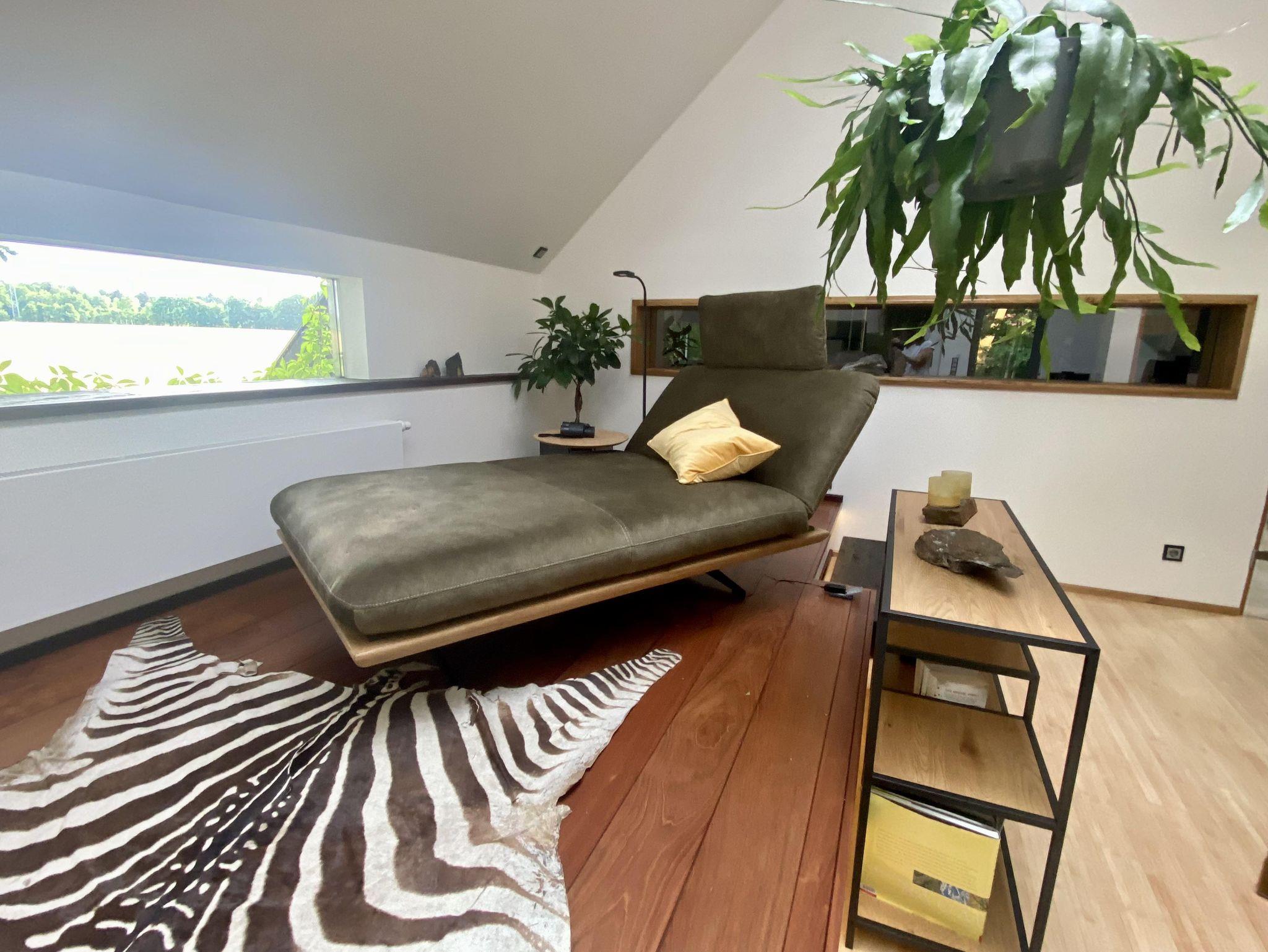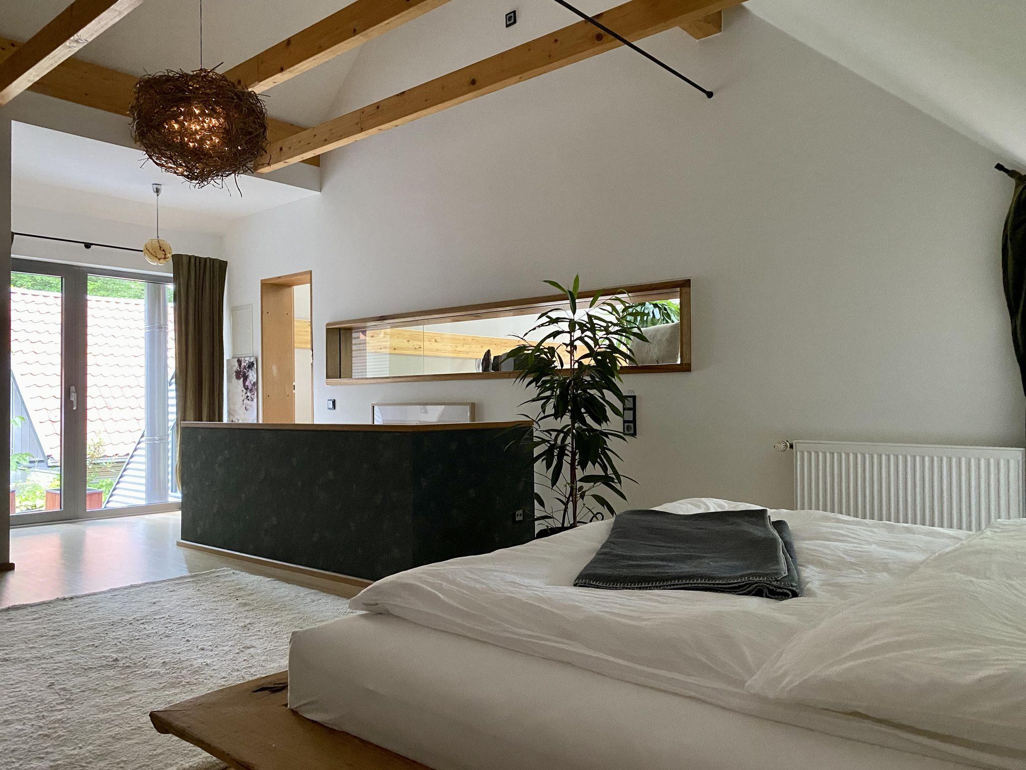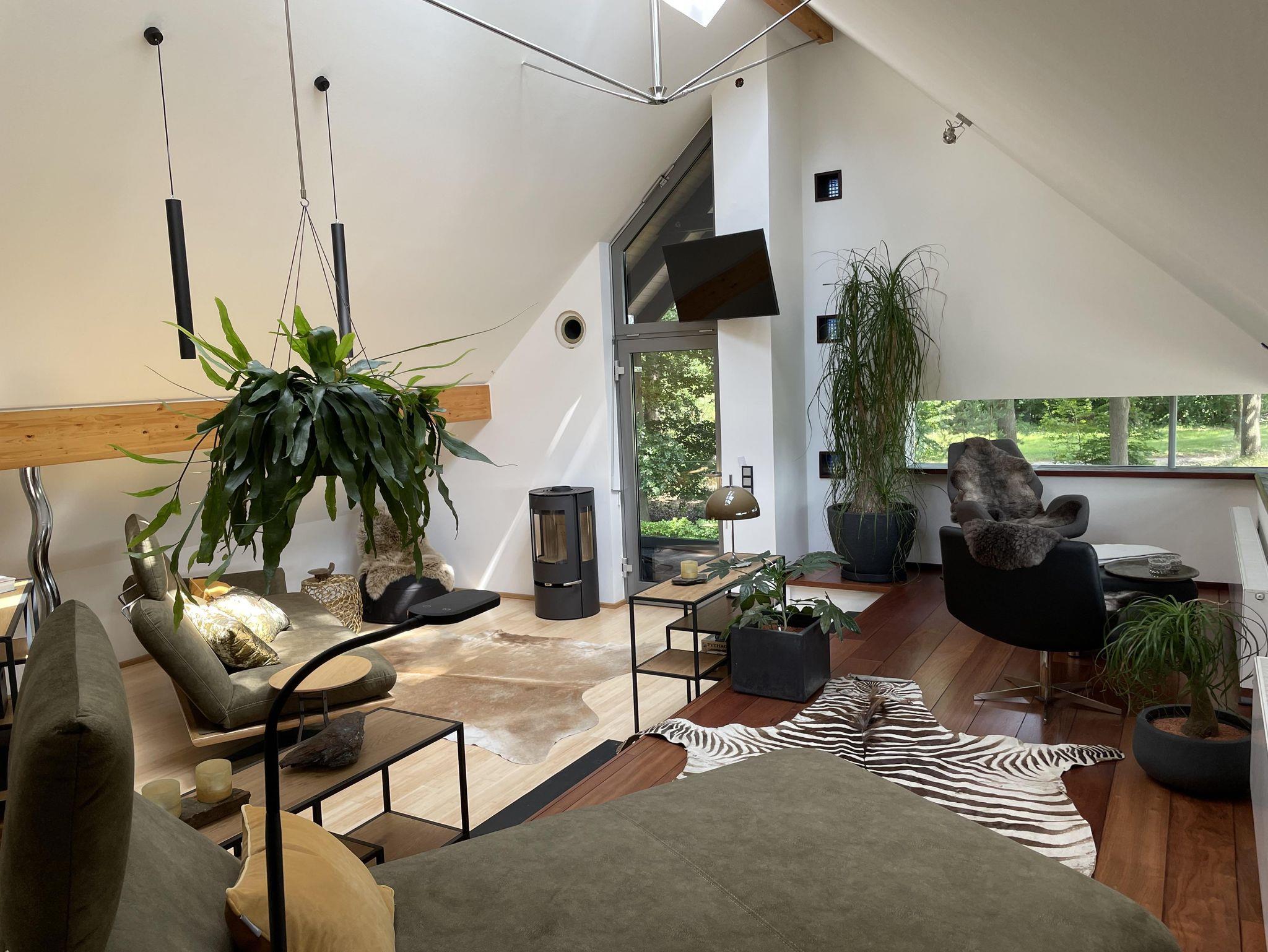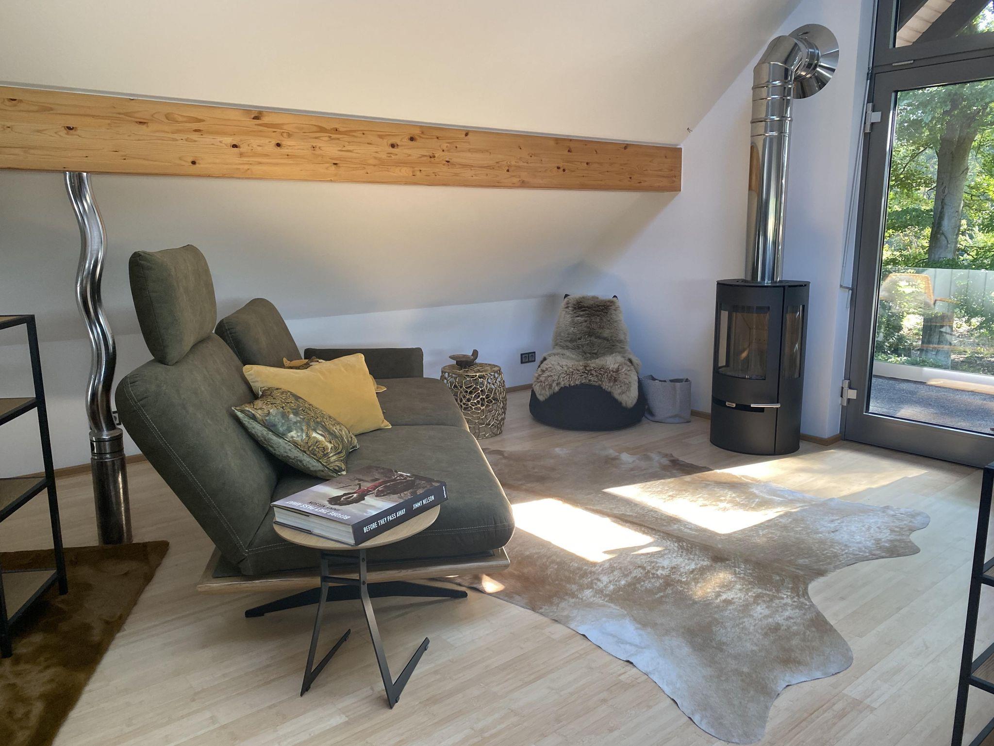 Über die Treppe gelangt man in das loftartig ausgebaute OG, mit Schlaf-Ankleidebereich, elektr. verstellbarem Massivholz-Doppelbett und dimmbaren Leseleuchten. Angrenzend liegt das separate Bad mit Wanne und Duschmöglichkeit. Über den offenen Flurbereich betritt man den lichtdurchfluteten Atelier-Wohnbereich mit Panorama-Verglasung. Diverse Sitz- und Ruhemöbel, ein kleiner Office-Bereich sowie digitale Endgeräte (TV/dab+Radio/Bluetoothbox) sind ebenso vorhanden, wie ein weiterer Kaminofen. Alle Räume, bis auf Küche und Entree, sind mit Massivholzböden belegt.