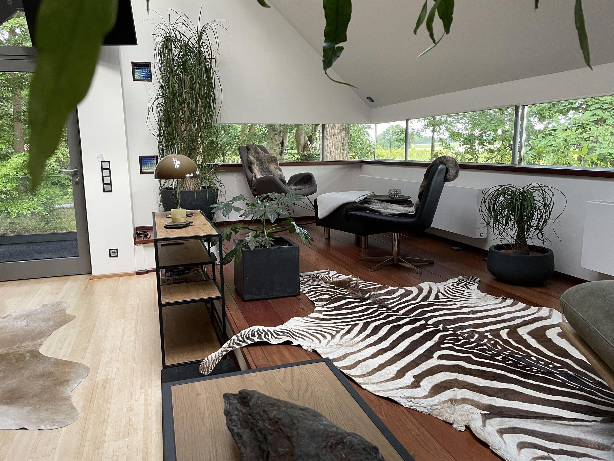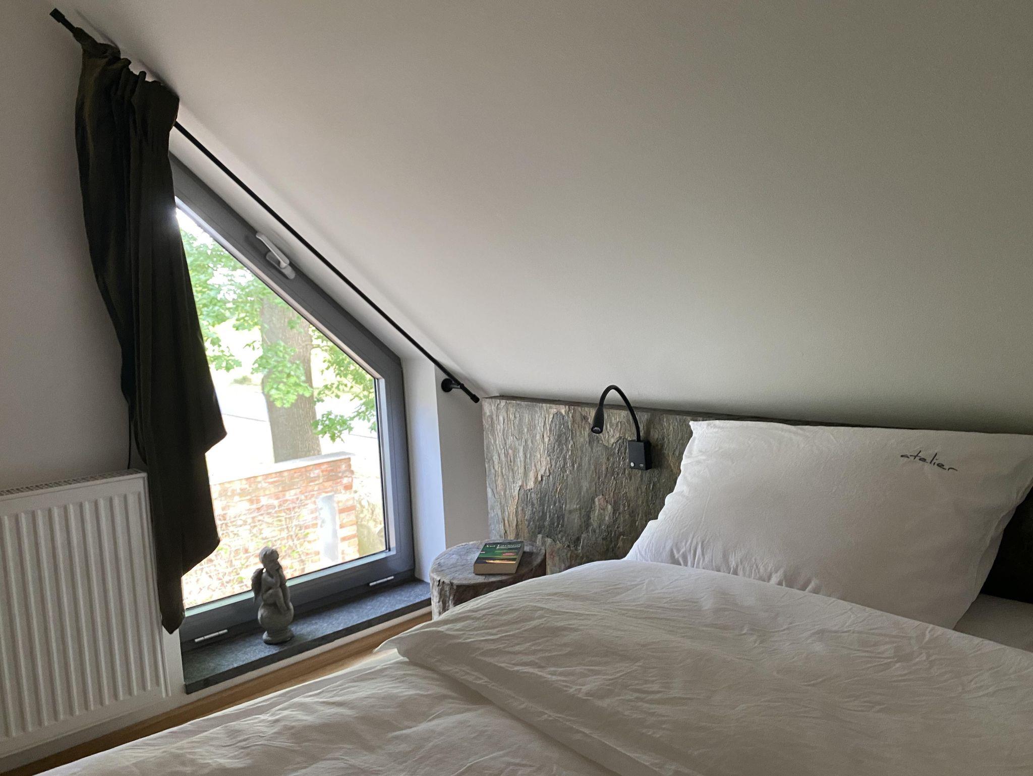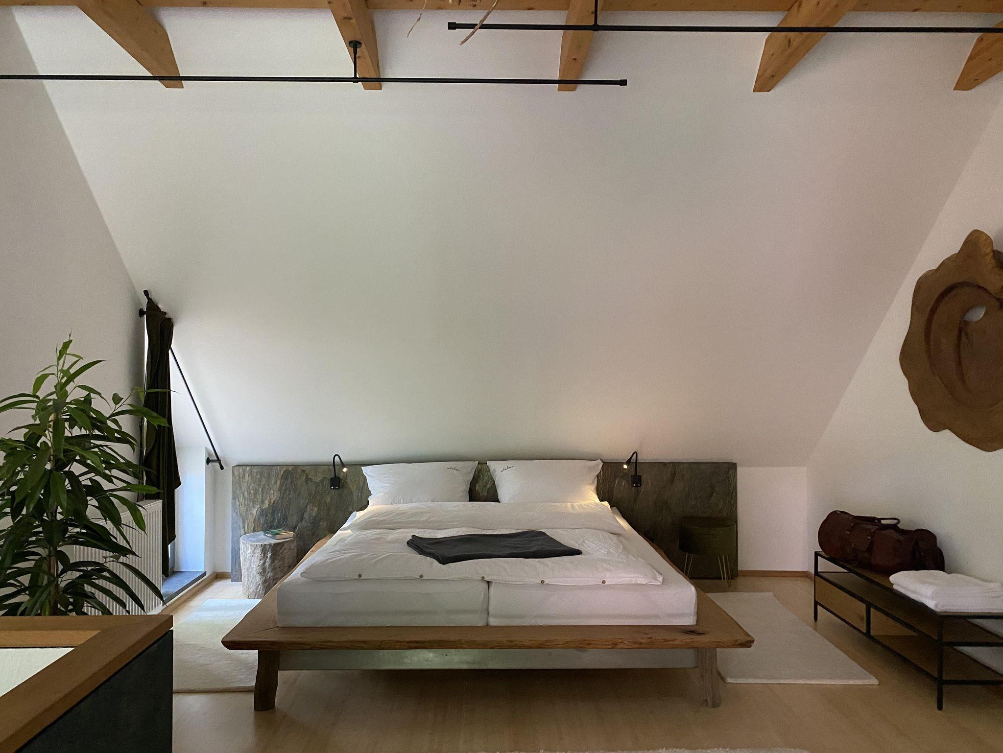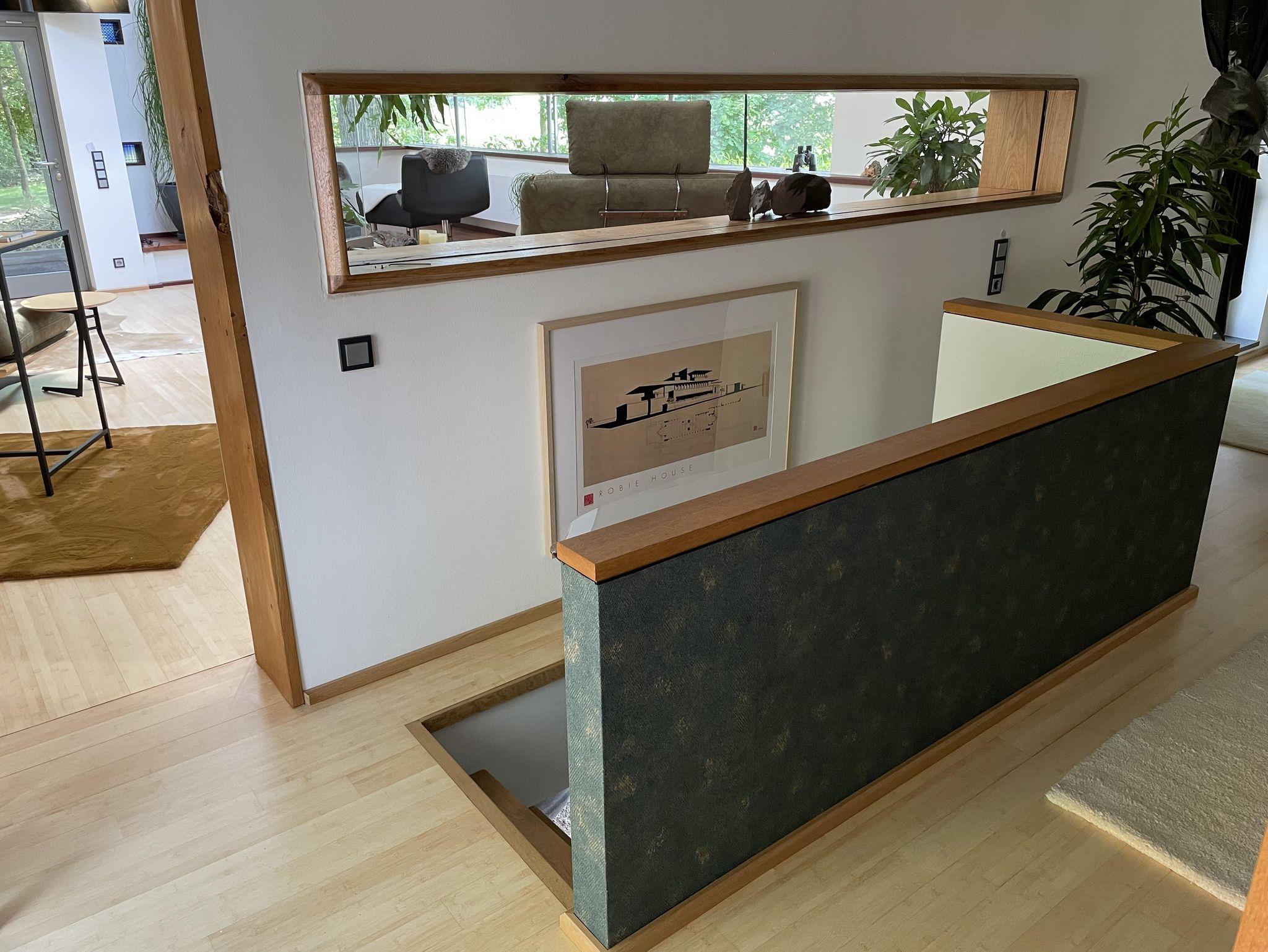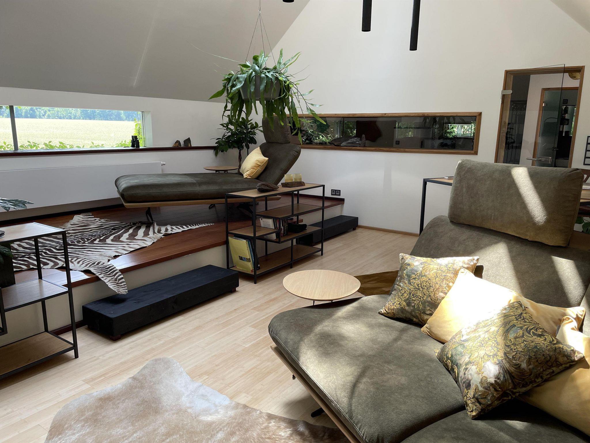 Über die Treppe gelangt man in das loftartig ausgebaute OG, mit Schlaf-Ankleidebereich, elektr. verstellbarem Massivholz-Doppelbett und dimmbaren Leseleuchten. Angrenzend liegt das separate Bad mit Wanne und Duschmöglichkeit. Über den offenen Flurbereich betritt man den lichtdurchfluteten Atelier-Wohnbereich mit Panorama-Verglasung. Diverse Sitz- und Ruhemöbel, ein kleiner Office-Bereich sowie digitale Endgeräte (TV/dab+Radio/Bluetoothbox) sind ebenso vorhanden, wie ein weiterer Kaminofen. Alle Räume, bis auf Küche und Entree, sind mit Massivholzböden belegt.