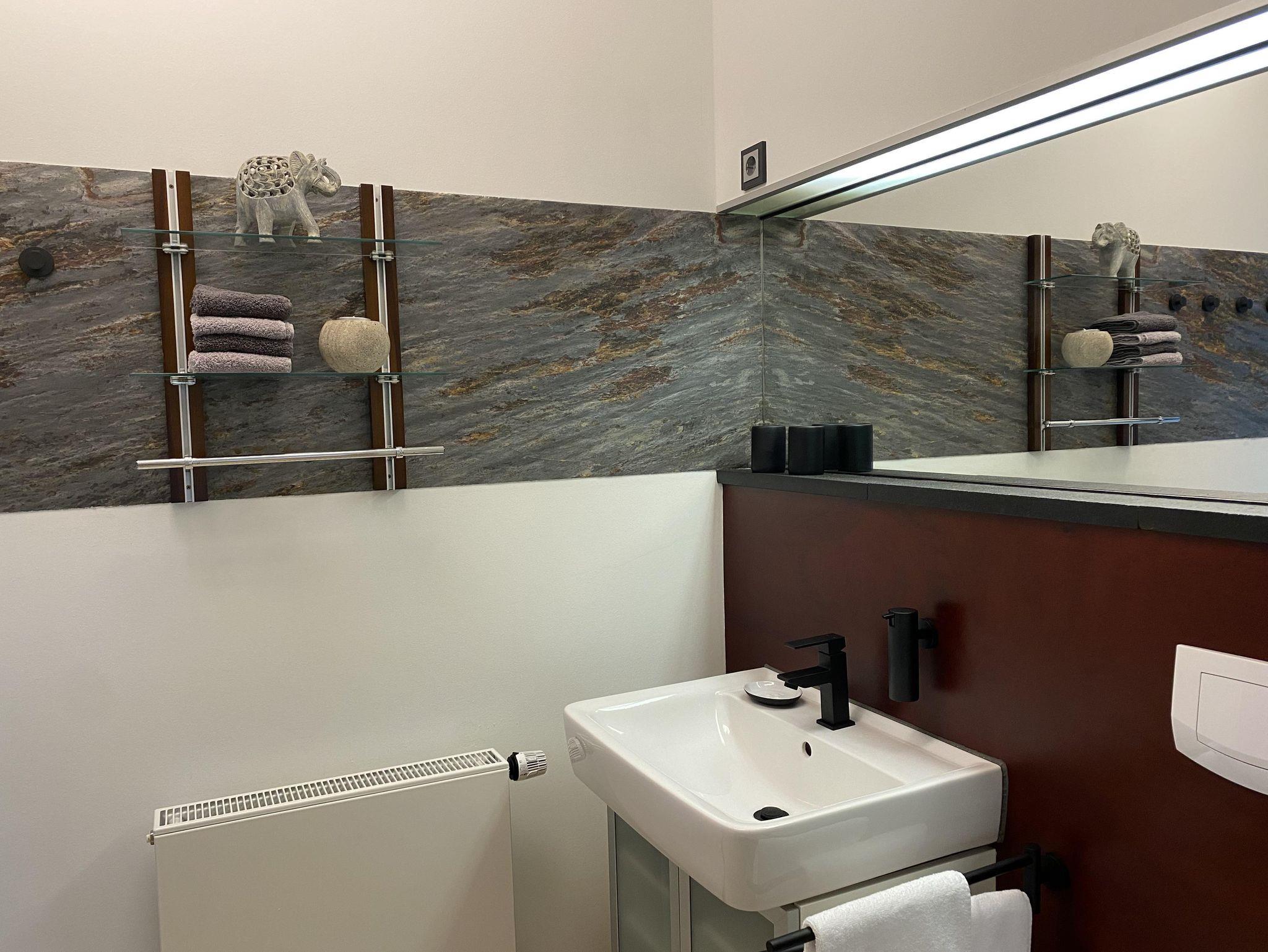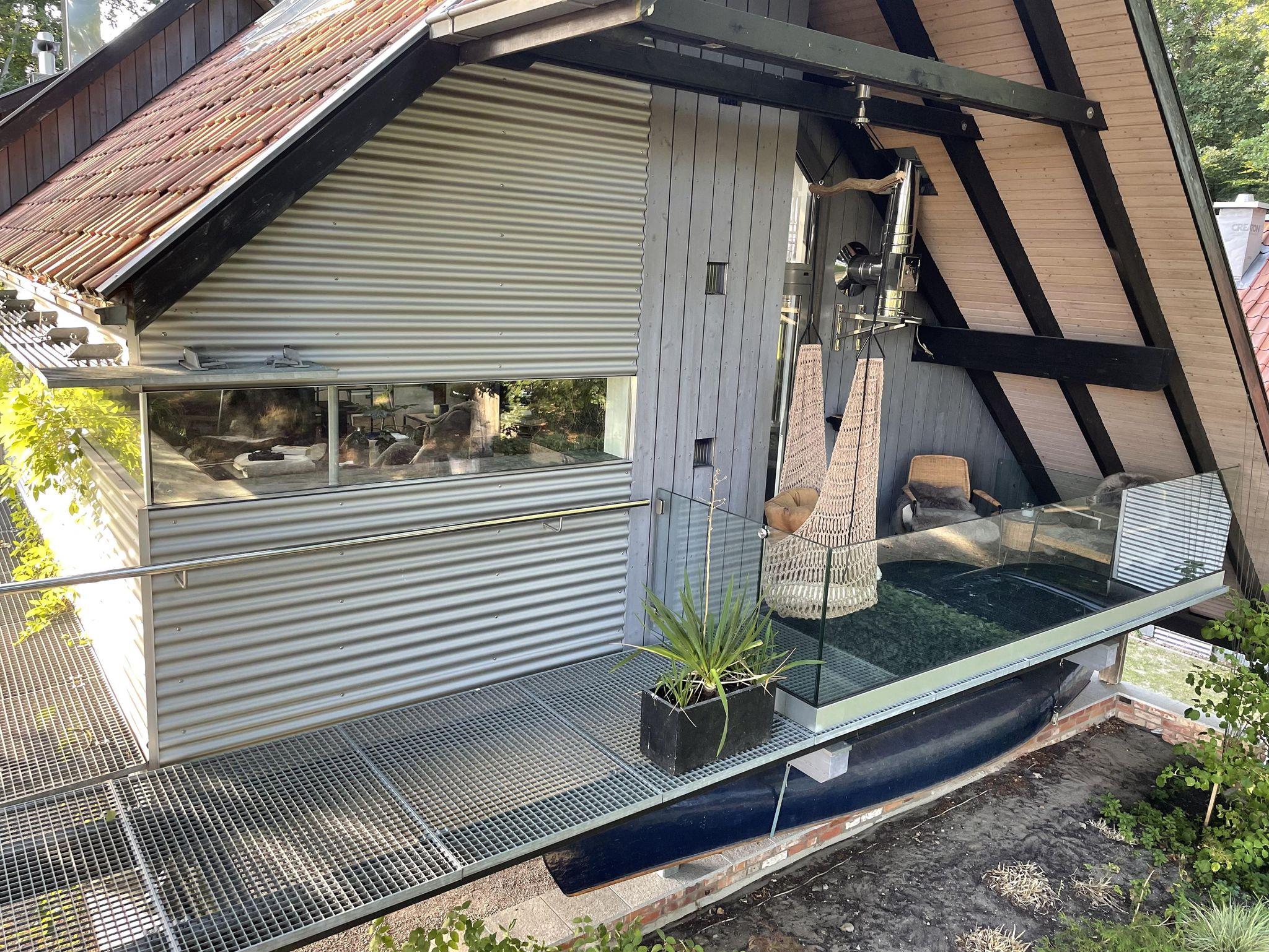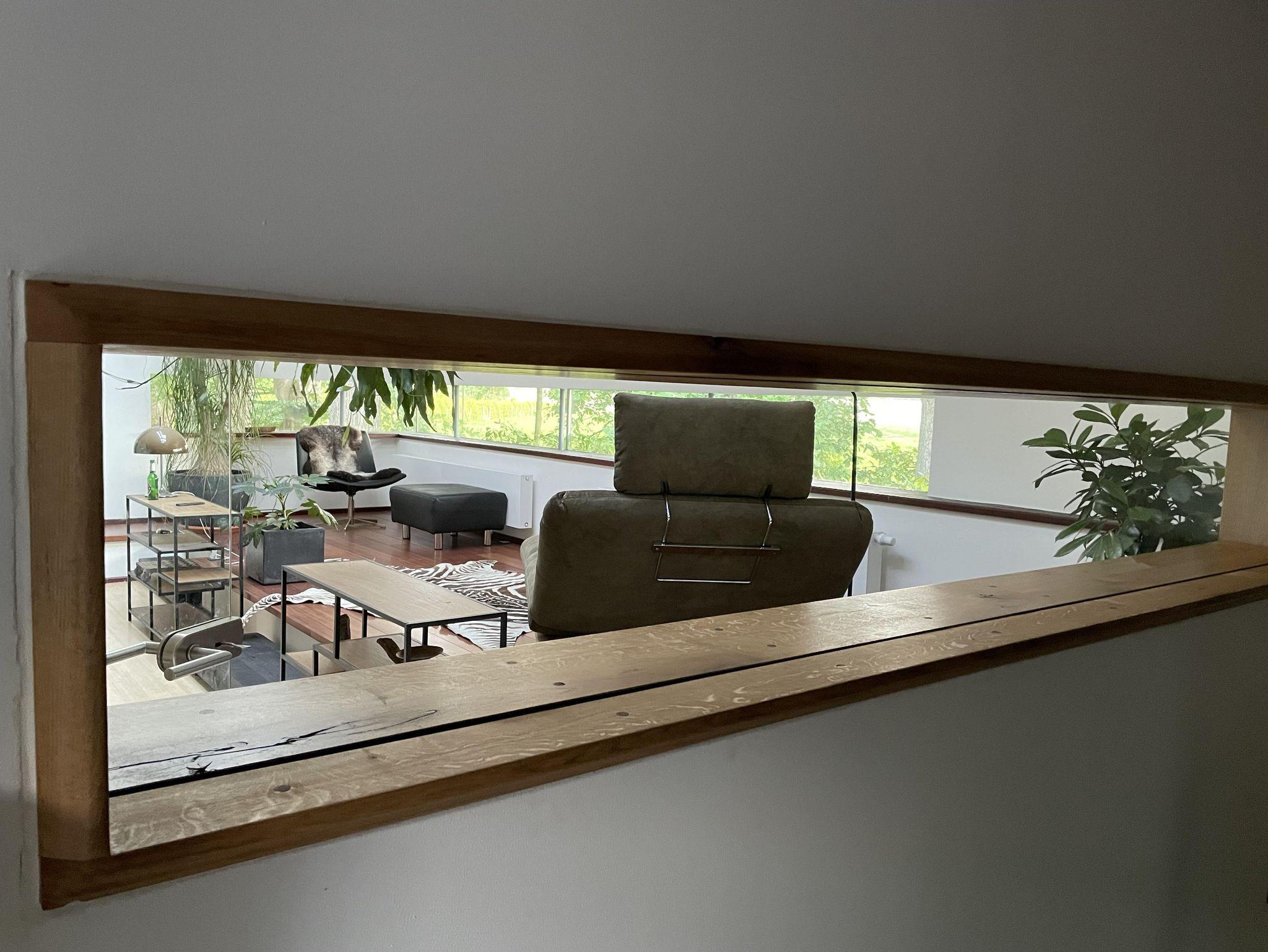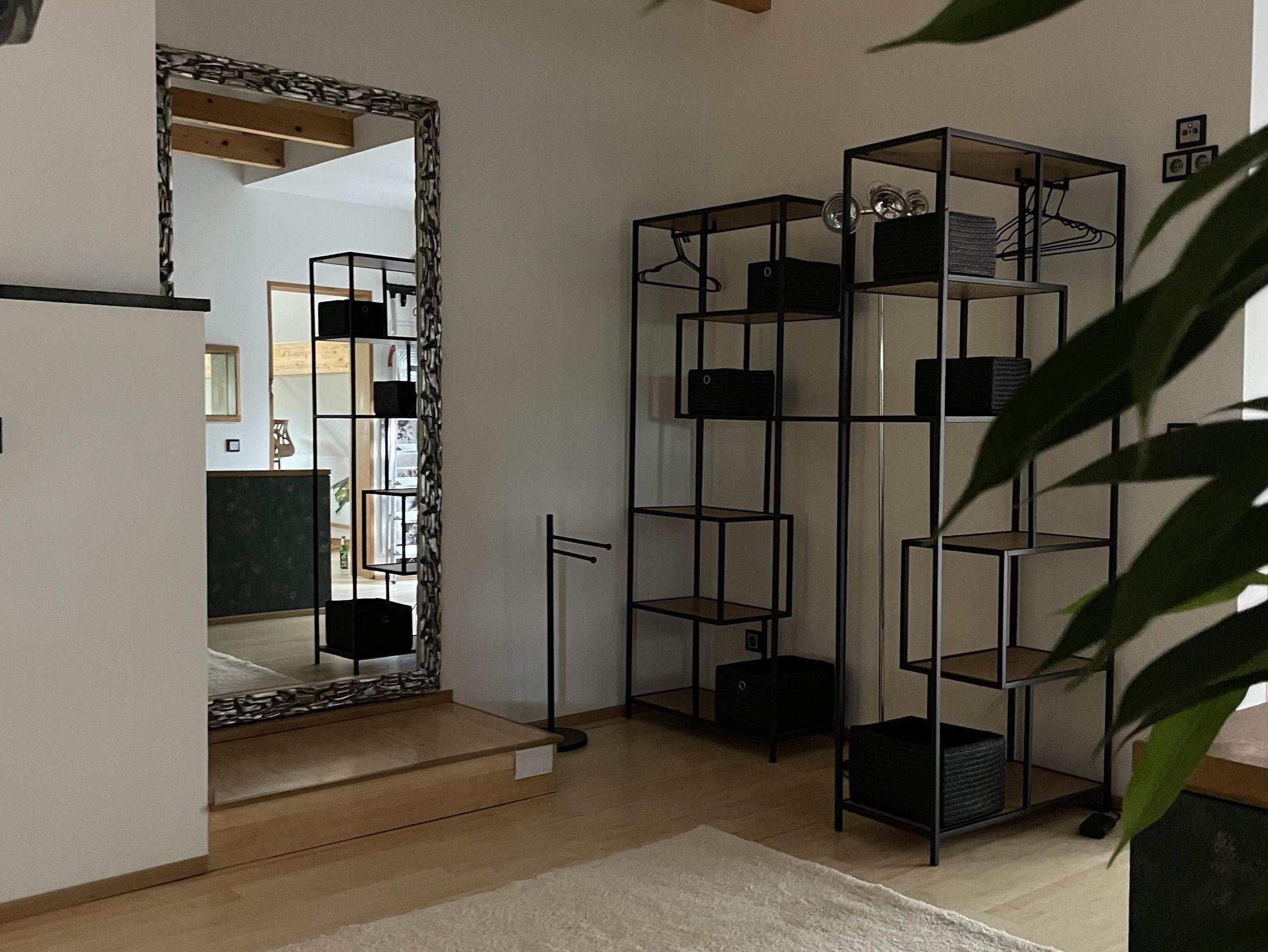 Über die Treppe gelangt man in das loftartig ausgebaute OG, mit Schlaf-Ankleidebereich, elektr. verstellbarem Massivholz-Doppelbett und dimmbaren Leseleuchten. Angrenzend liegt das separate Bad mit Wanne und Duschmöglichkeit. Über den offenen Flurbereich betritt man den lichtdurchfluteten Atelier-Wohnbereich mit Panorama-Verglasung. Diverse Sitz- und Ruhemöbel, ein kleiner Office-Bereich sowie digitale Endgeräte (TV/dab+Radio/Bluetoothbox) sind ebenso vorhanden, wie ein weiterer Kaminofen. Alle Räume, bis auf Küche und Entree, sind mit Massivholzböden belegt.