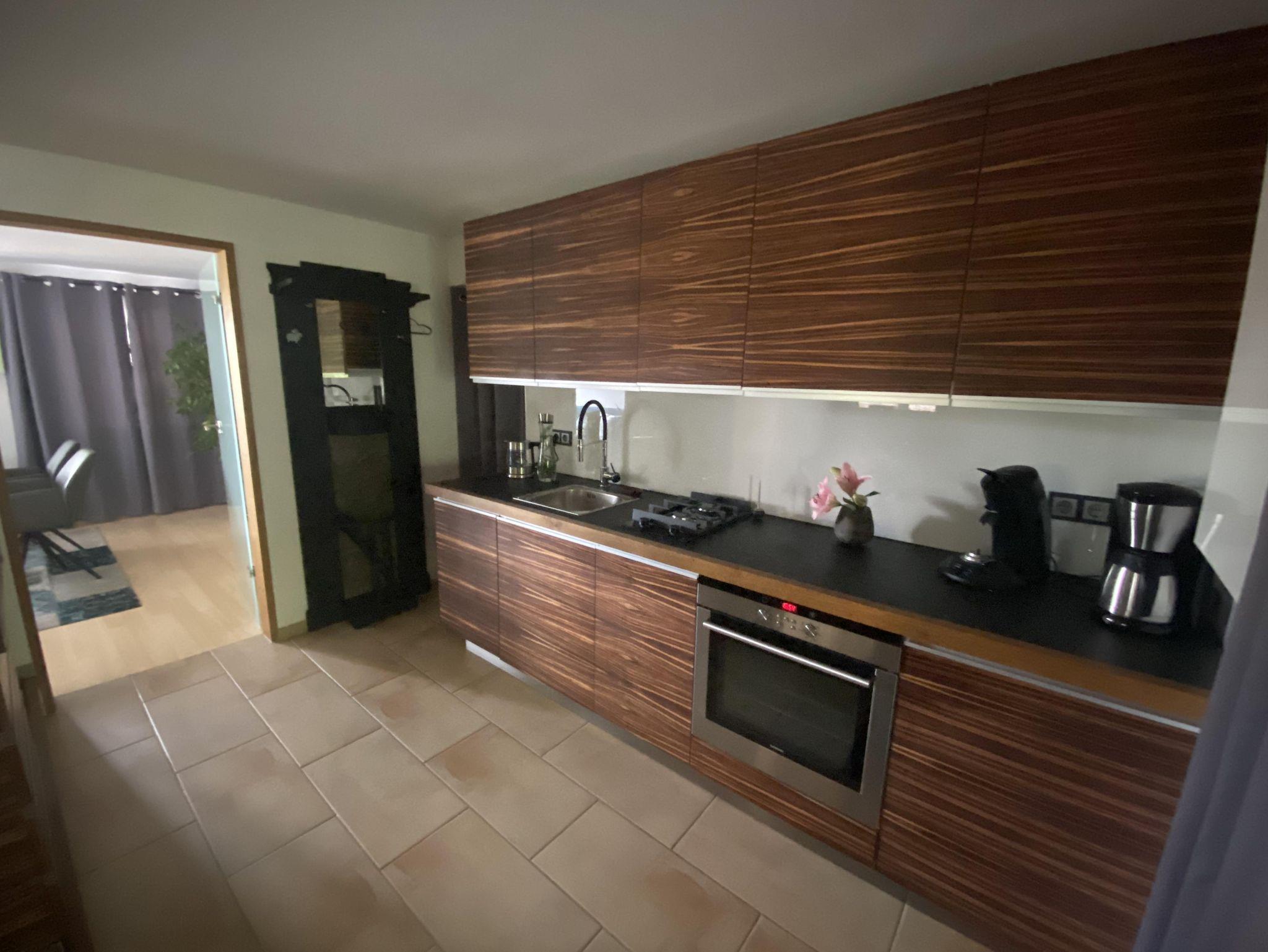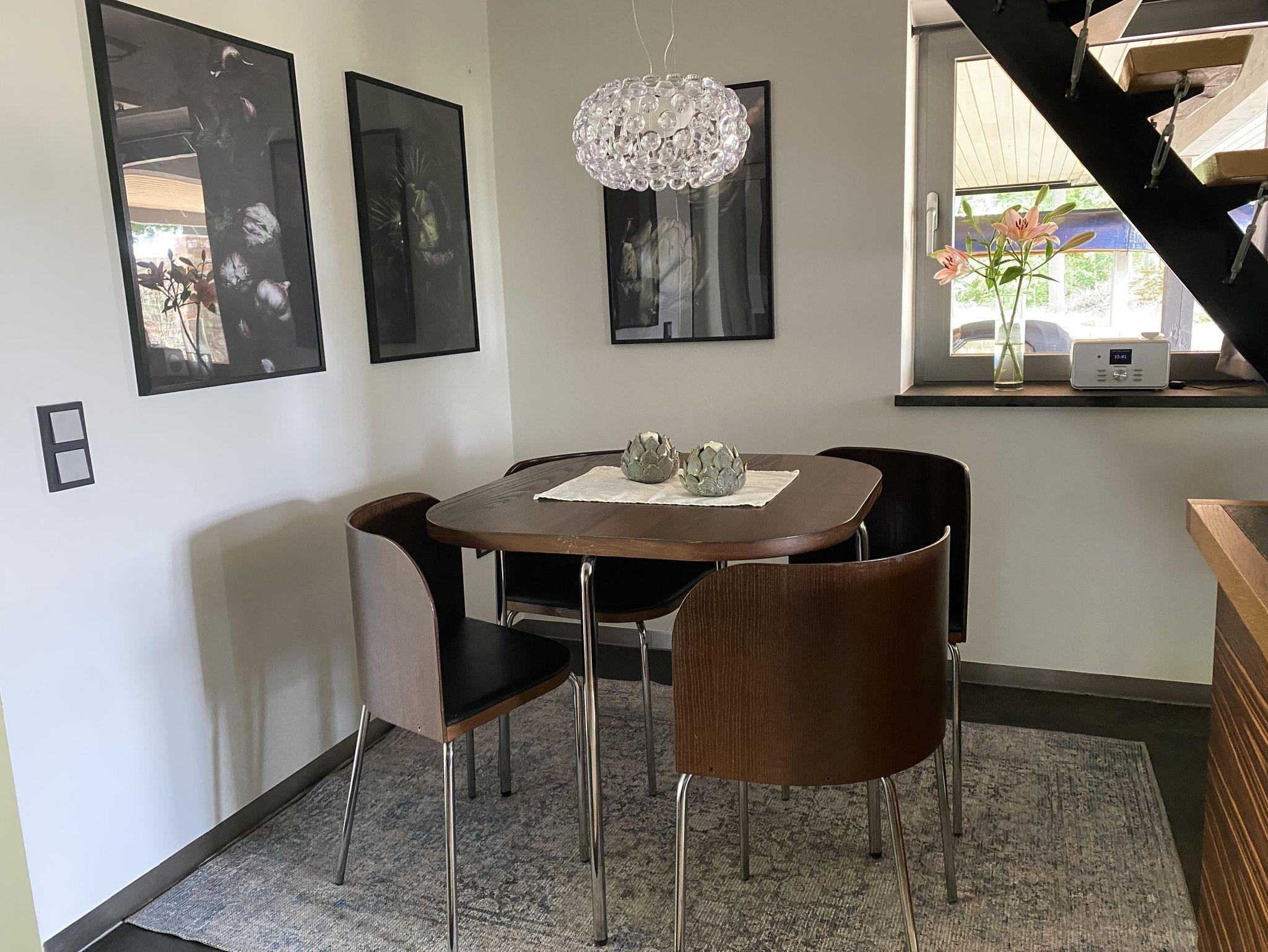 Im EG befindet sich die vollausgestattete Einbau-Küche, mit Abstellraum und Waschmaschine sowie das südausgerichtete Esszimmer mit Kaminofen.