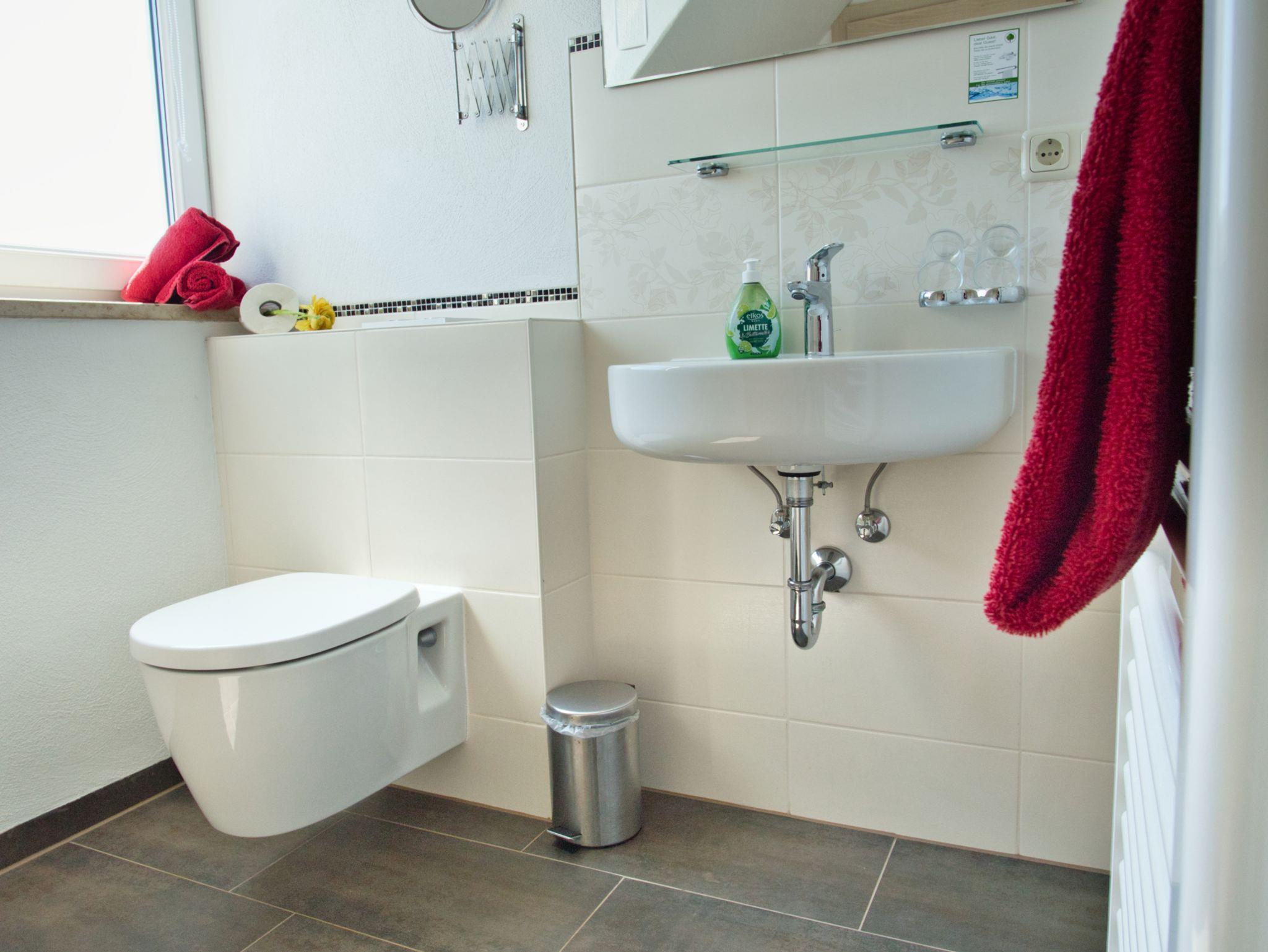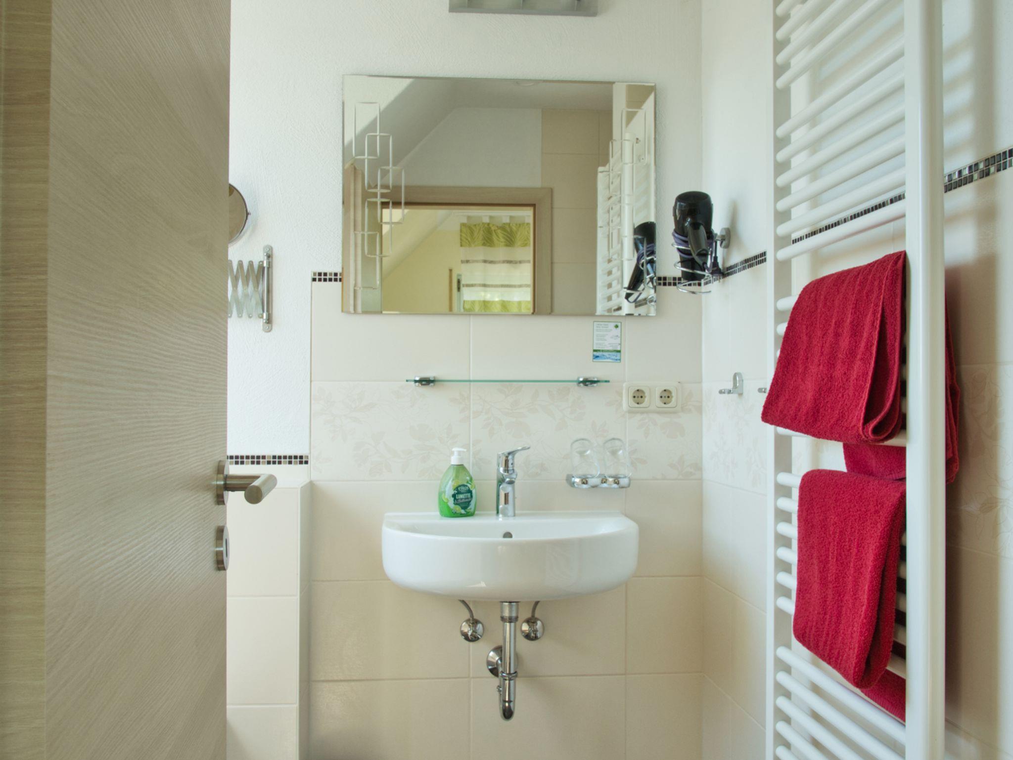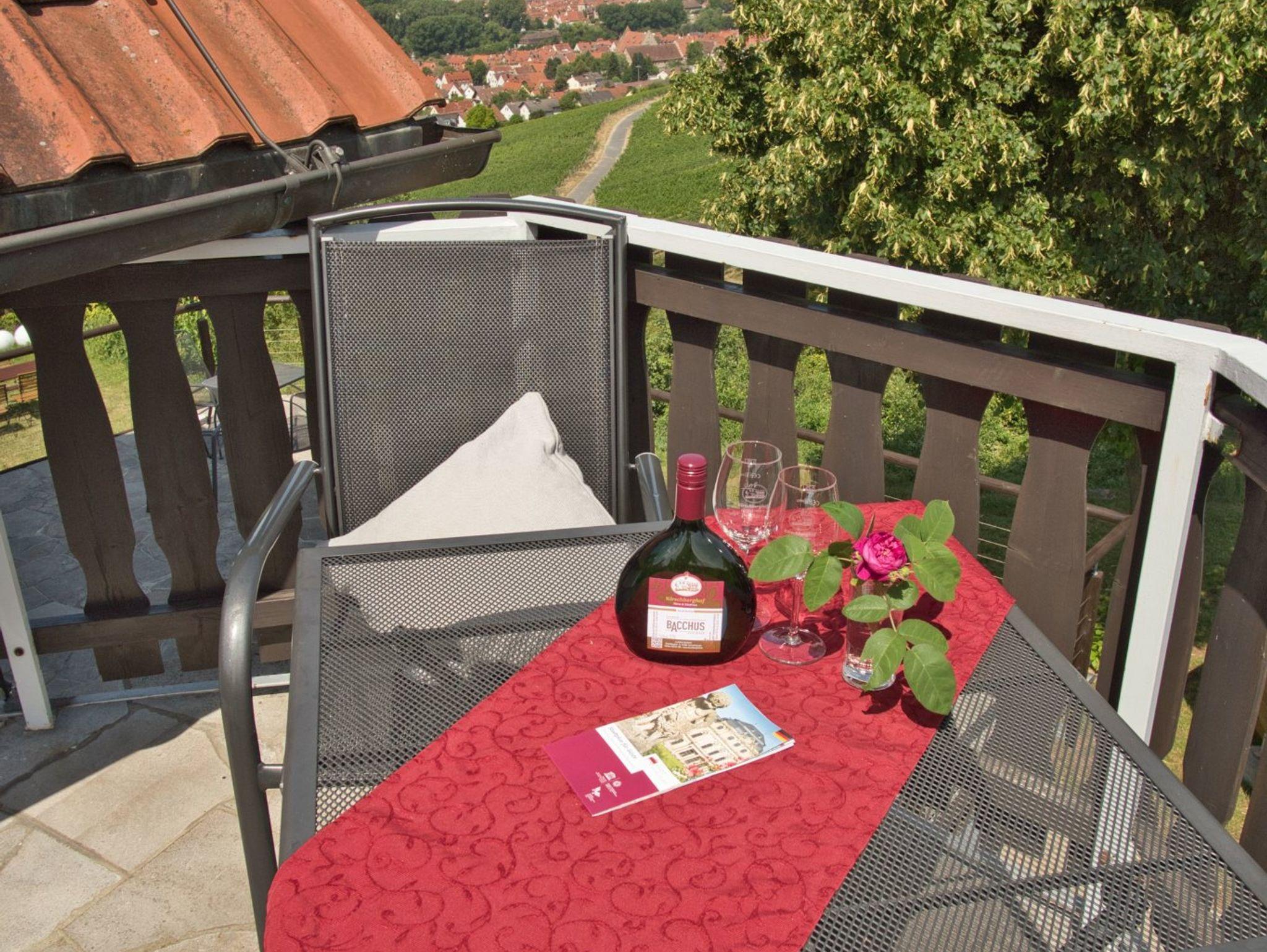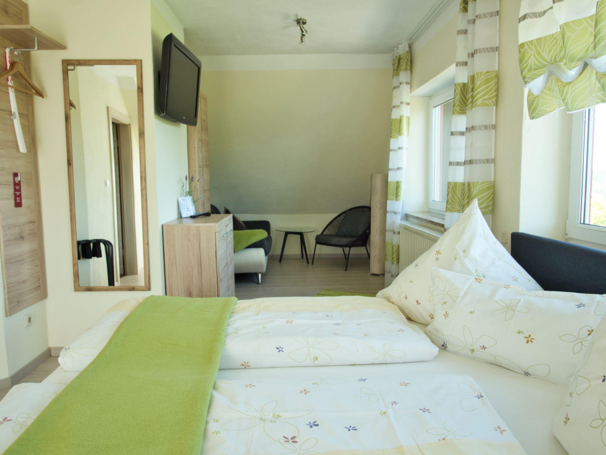 für 2 Personen (ca. 32 m²): Schlafraum mit 1,80m Doppelbett, Bad mit ebenerdiger Dusche, Sitzgelegenheit, kleiner Kühlschrank, Wasserkocher, Safe, TV, Föhn, Handtücher, mit Panoramablick ins Maintal.
