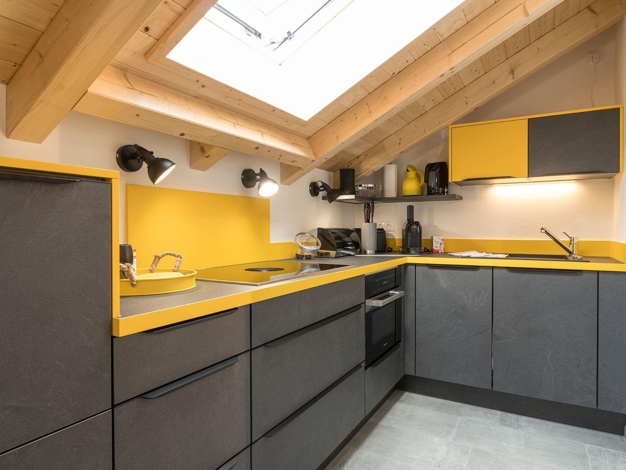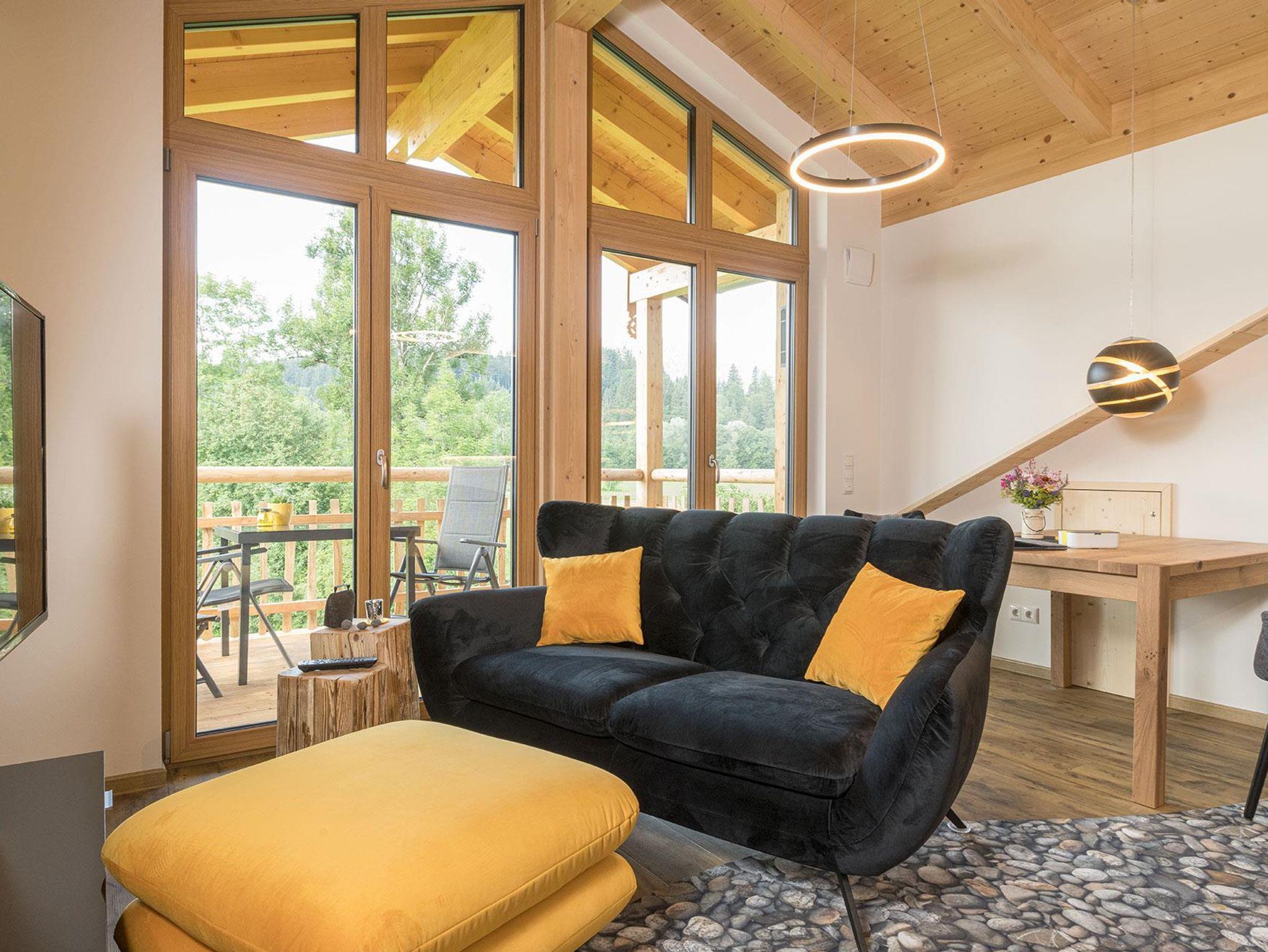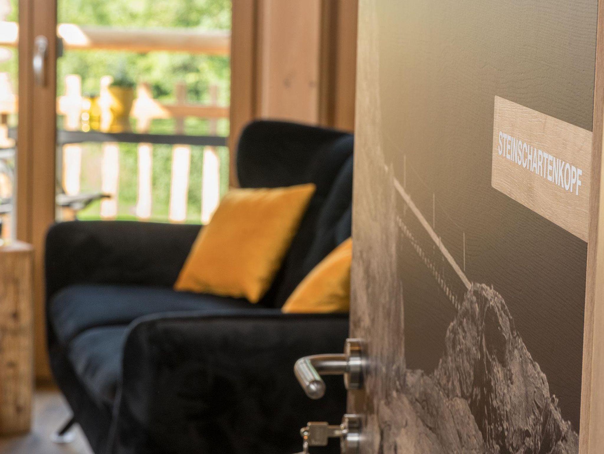 Klein aber fein ist die Ferienwohnung Steinschartenkopf in der Mitte des Dachgeschosses. Das kleine Loft mit 50 m² für zwei Personen ist für das kleine Gipfelerlebnis komplett offen gestaltet. Wohn- und Essbereich mit Süd-Westverglasung und eigenen Balkon, Flat-TV und Lounge Ecke. Küche mit Wasserkocher, Kaffeemaschine, Induktionskochfeld, Kühl- und Gefrierkombination, Geschirrspüler, Mikrowellen-Backofen. Bad mit Regendusche und eigener Sunshower Pure XL (Infrarot – Lampe), WC. Schlafzimmer mit einem Boxspringbett. Kostenloser Parkplatz direkt vor der Tür im Carport