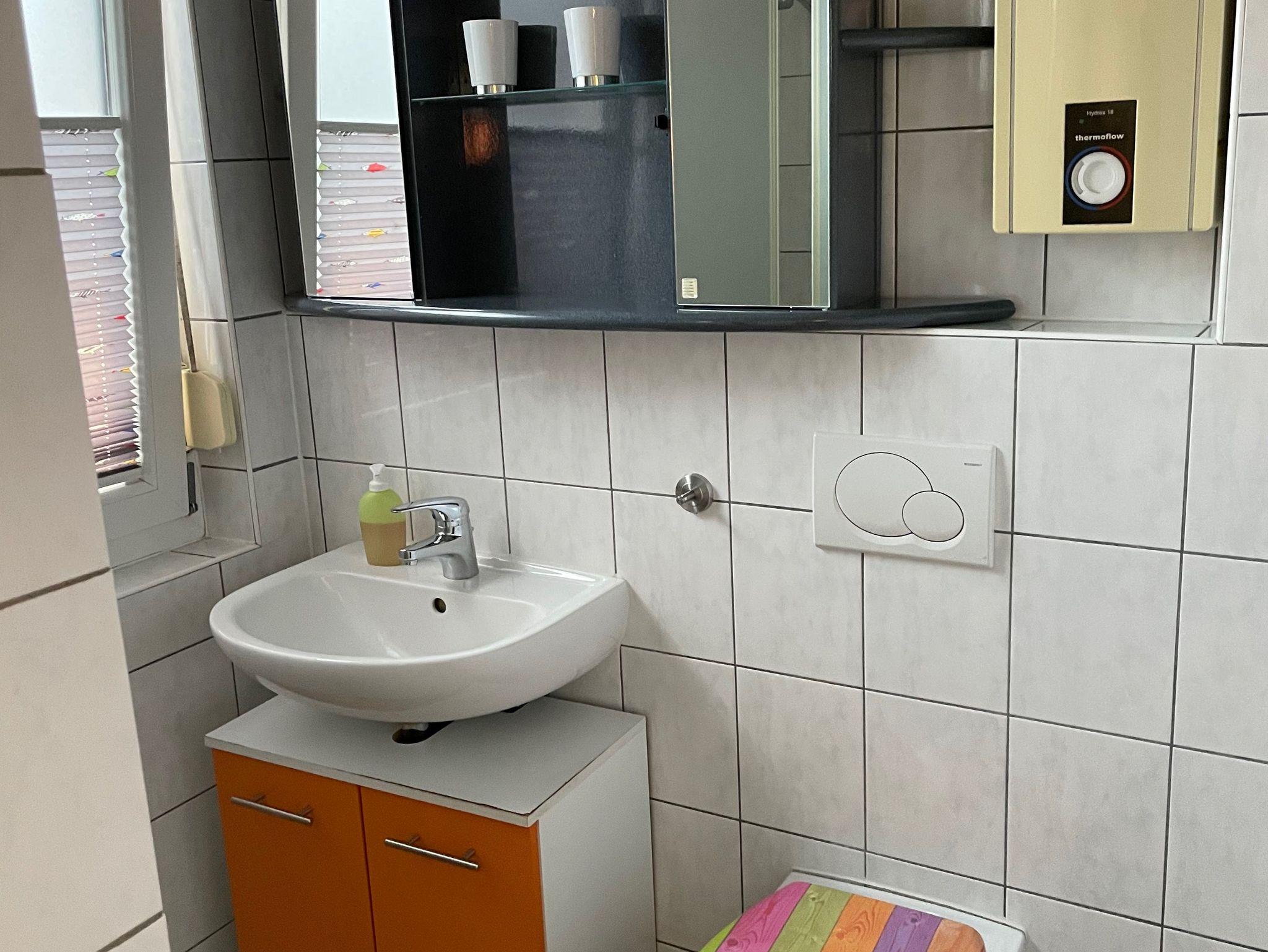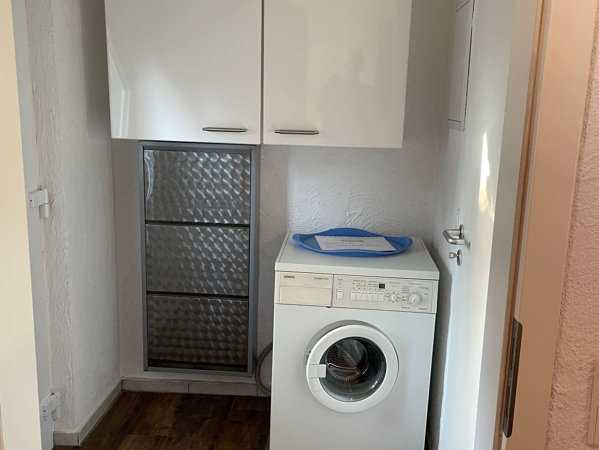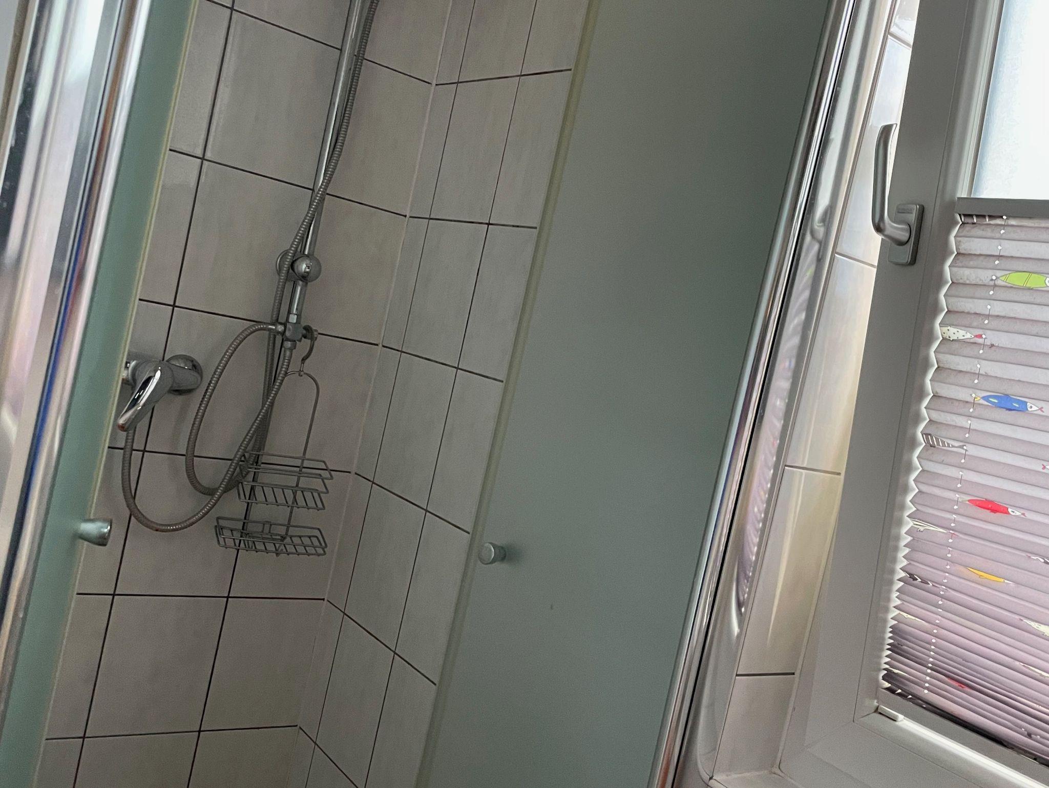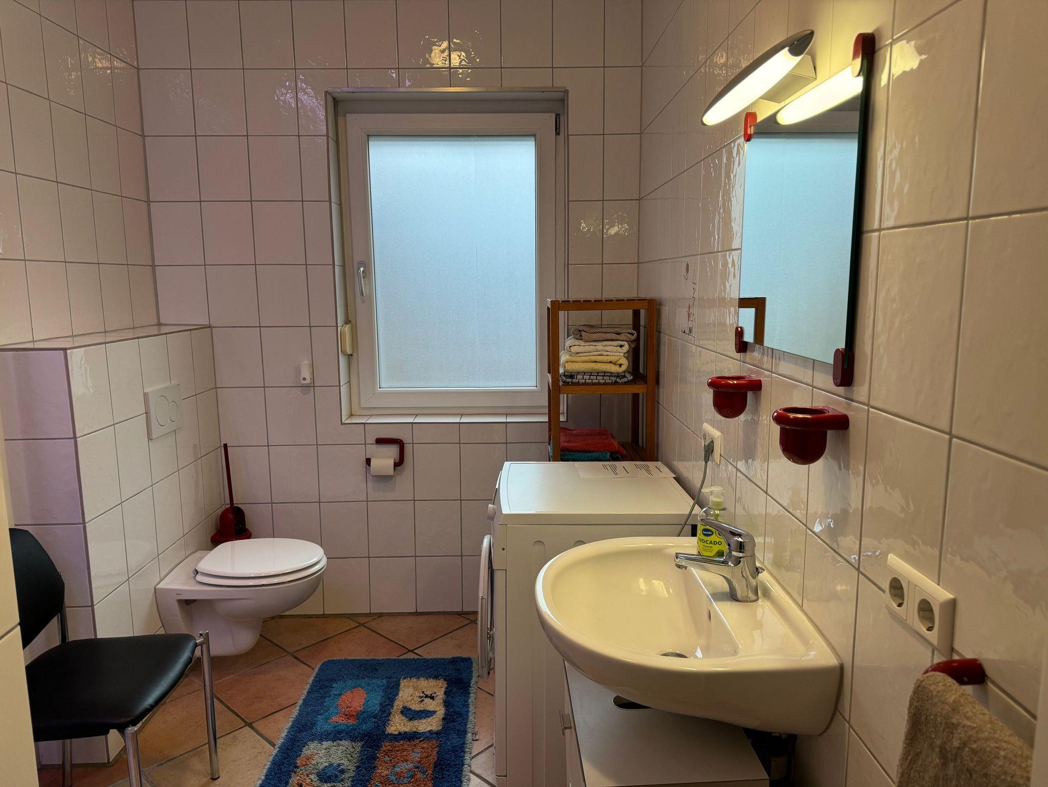 Badezimmer mit Fenster, Waschmaschine, begehbare Dusche