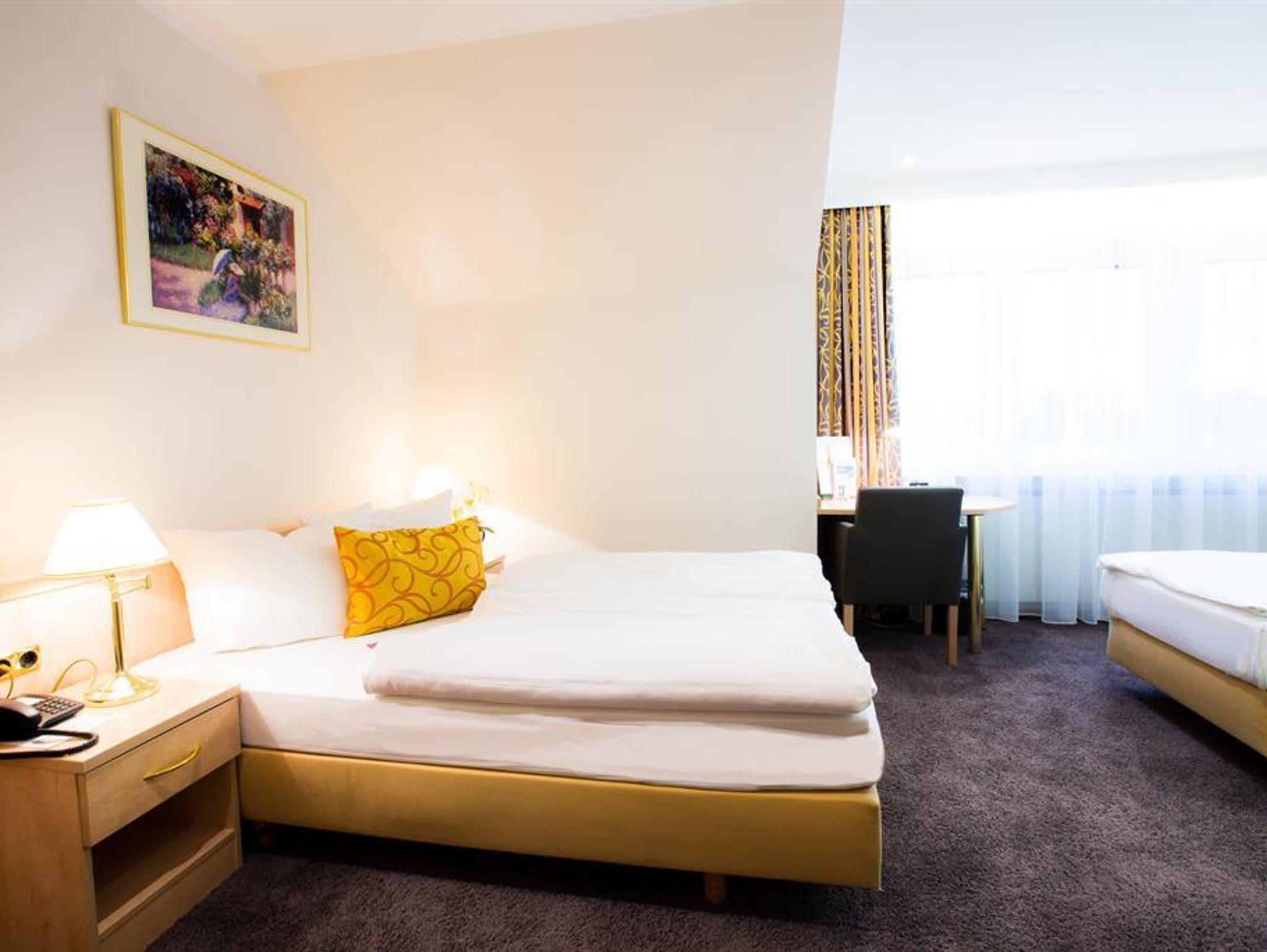 Das Zimmer ist geräumig (ca. 19-23 qm), modern eingerichtet und ausgestattet mit französischem Bett (140x200cm) oder Doppelbett (180x200cm) oder 2 Twinbetten, 1 Zusatzbett (90x200cm), Klimaanlage, Schallschutzfenster (zum Öffnen) oder Lage zum Hotelgarten, Bad mit Dusche, WC, Handtuchwärmer und Fön, LED Flatscreen-TV mit über 250 Digital-Satelitten-Programmen sowie Radio und Weckdienst, Schreibtisch, Telefon und kostenlosem W-LAN.