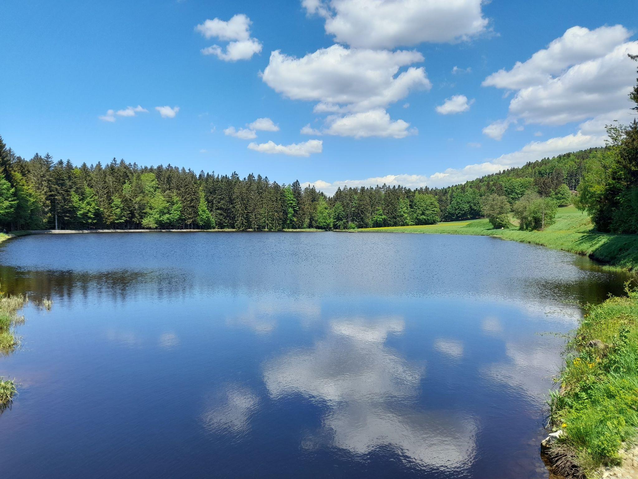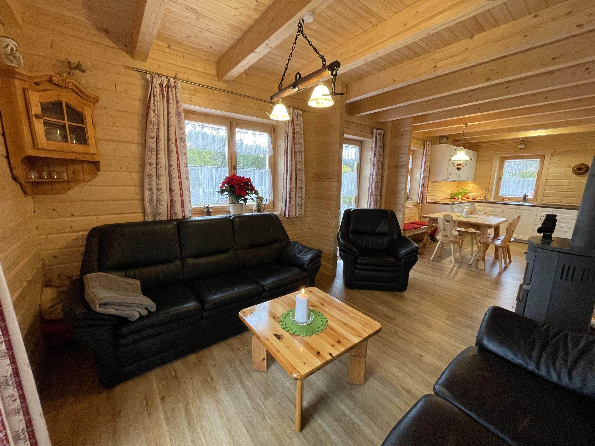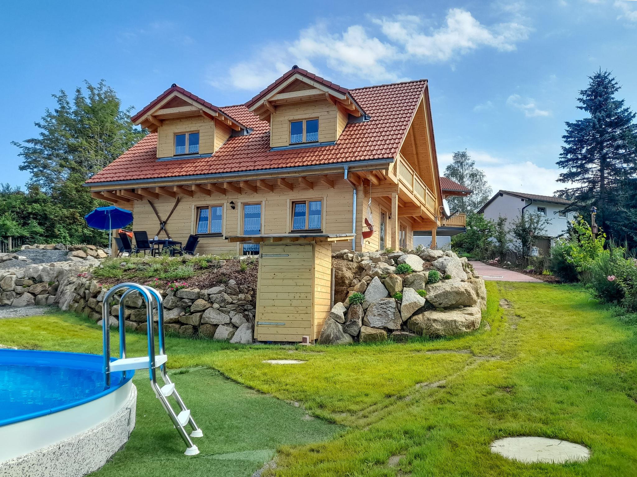 A family atmosphere in three comfortable log chalets. Largely self-sufficient energy supply with photovoltaic systems, infrared heating and Swedish stoves. Firewood comes from the property's small forest with a natural pond and stream. From approximately May 24, a chicken coop with outdoor enclosure will be available. Children can pet and feed the chickens and collect their own eggs. Small, child friendly resort, built in 2022. 3 houses in the residence. In the district of Mühlberg 2 km from the centre of Spiegelau, on a slope. For shared use: property 6'000 m2 with meadow, natural pond, swimming pool round (8 m diameter, seasonal availability: 15.May. - 30.Sep.). Patio. In the house: sauna, bicycle rental. Bread roll service. E-charging station. Shop 1 km, supermarket 2.5 km, bus stop "Palmberg" 1 km, railway station "Spiegelau" 3.5 km, outdoor swimming pool 2.5 km. Walking paths from the house 10 m, sled run 1 km. Nearby attractions: Nationalparkzentrum Neuschönau 17 km, Baumwipfelpfad 17 km, Passau 45 km. Well-known ski regions can easily be reached: Mitterfirmiansreut 31 km, Geißkopf 22 km, Großer Arber 37 km. Hiking paths: Nationalpark Bayerischer Wald 3 km. Please note: Loading and unloading of baggage is possible at the holiday house.