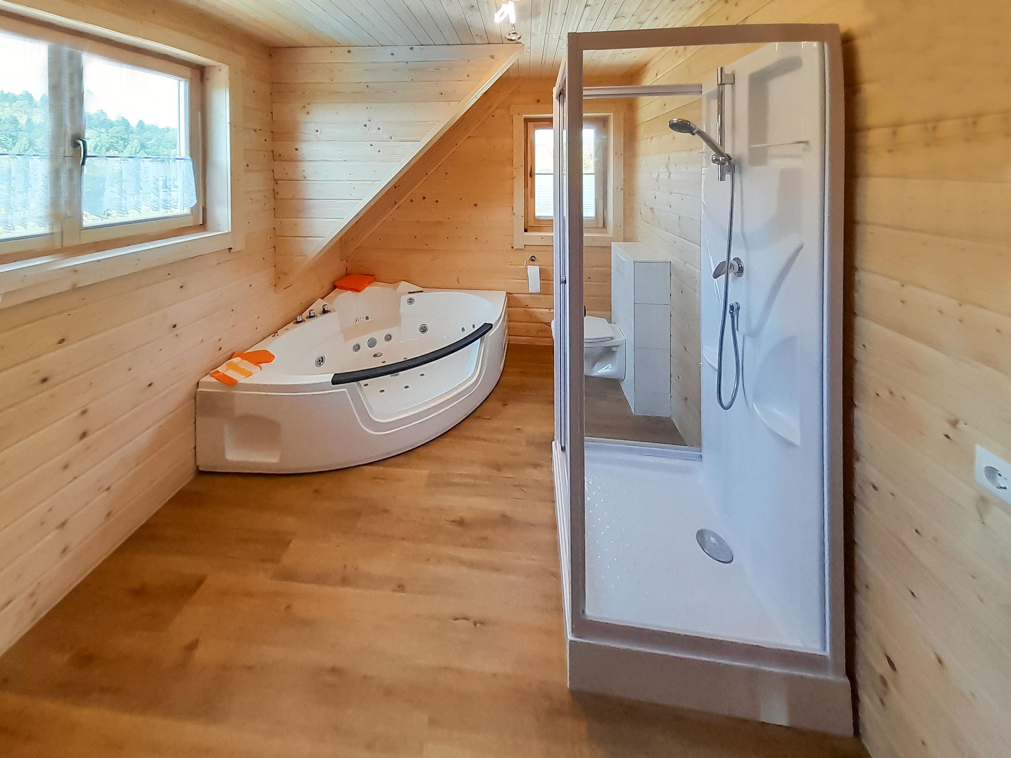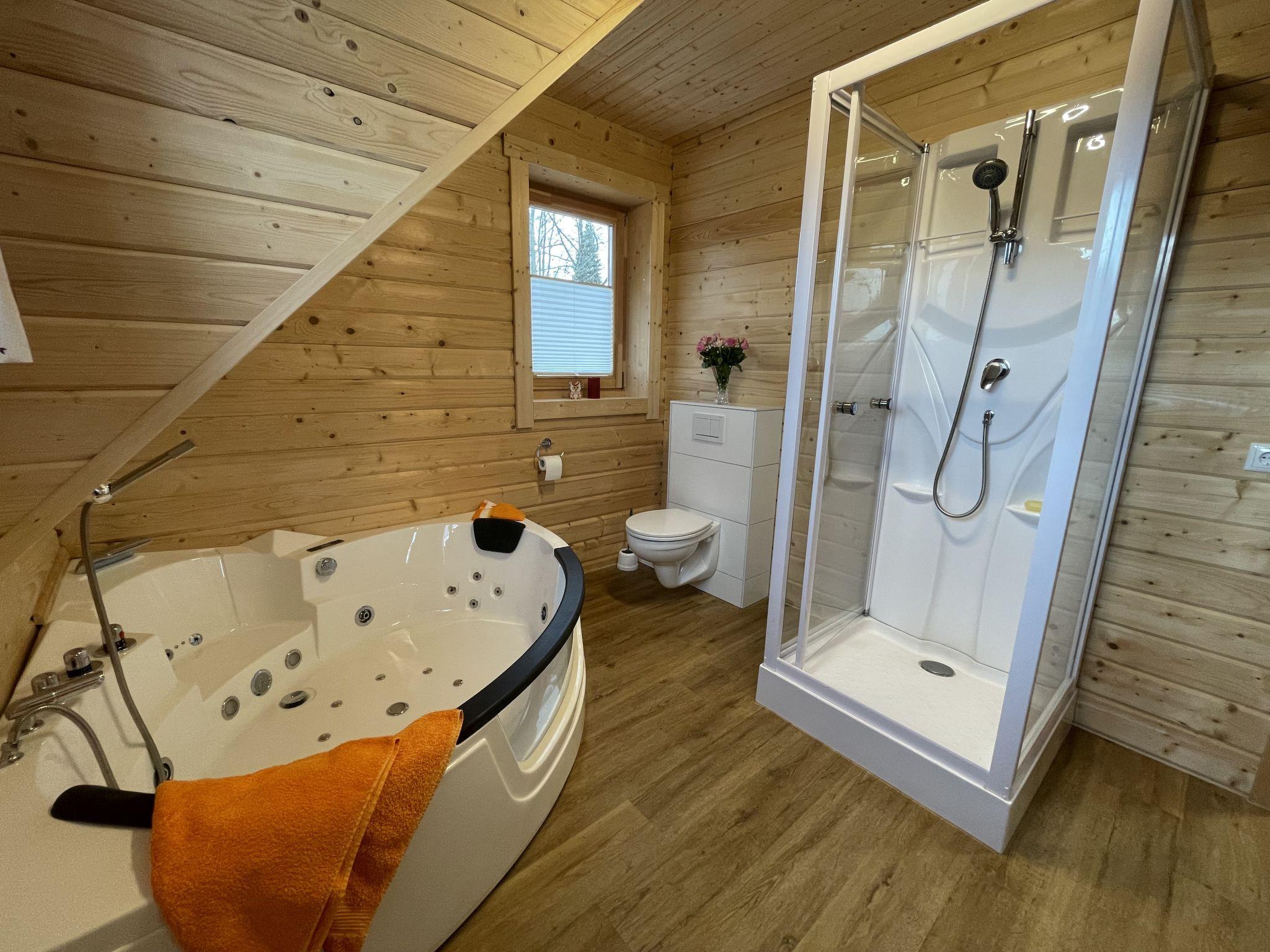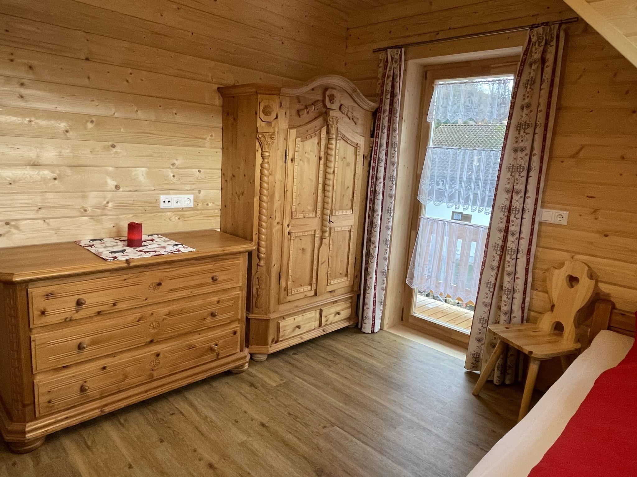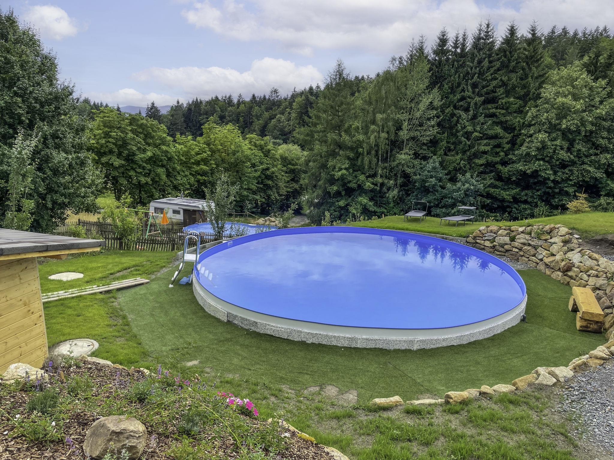 A family atmosphere in three comfortable log chalets. Largely self-sufficient energy supply with photovoltaic systems, infrared heating and Swedish stoves. Firewood comes from the property's small forest with a natural pond and stream. From approximately May 24, a chicken coop with outdoor enclosure will be available. Children can pet and feed the chickens and collect their own eggs. Small, child friendly resort, built in 2022. 3 houses in the residence. In the district of Mühlberg 2 km from the centre of Spiegelau, on a slope. For shared use: property 6'000 m2 with meadow, natural pond, swimming pool round (8 m diameter, seasonal availability: 15.May. - 30.Sep.). Patio. In the house: sauna, bicycle rental. Bread roll service. E-charging station. Shop 1 km, supermarket 2.5 km, bus stop "Palmberg" 1 km, railway station "Spiegelau" 3.5 km, outdoor swimming pool 2.5 km. Walking paths from the house 10 m, sled run 1 km. Nearby attractions: Nationalparkzentrum Neuschönau 17 km, Baumwipfelpfad 17 km, Passau 45 km. Well-known ski regions can easily be reached: Mitterfirmiansreut 31 km, Geißkopf 22 km, Großer Arber 37 km. Hiking paths: Nationalpark Bayerischer Wald 3 km. Please note: Loading and unloading of baggage is possible at the holiday house.