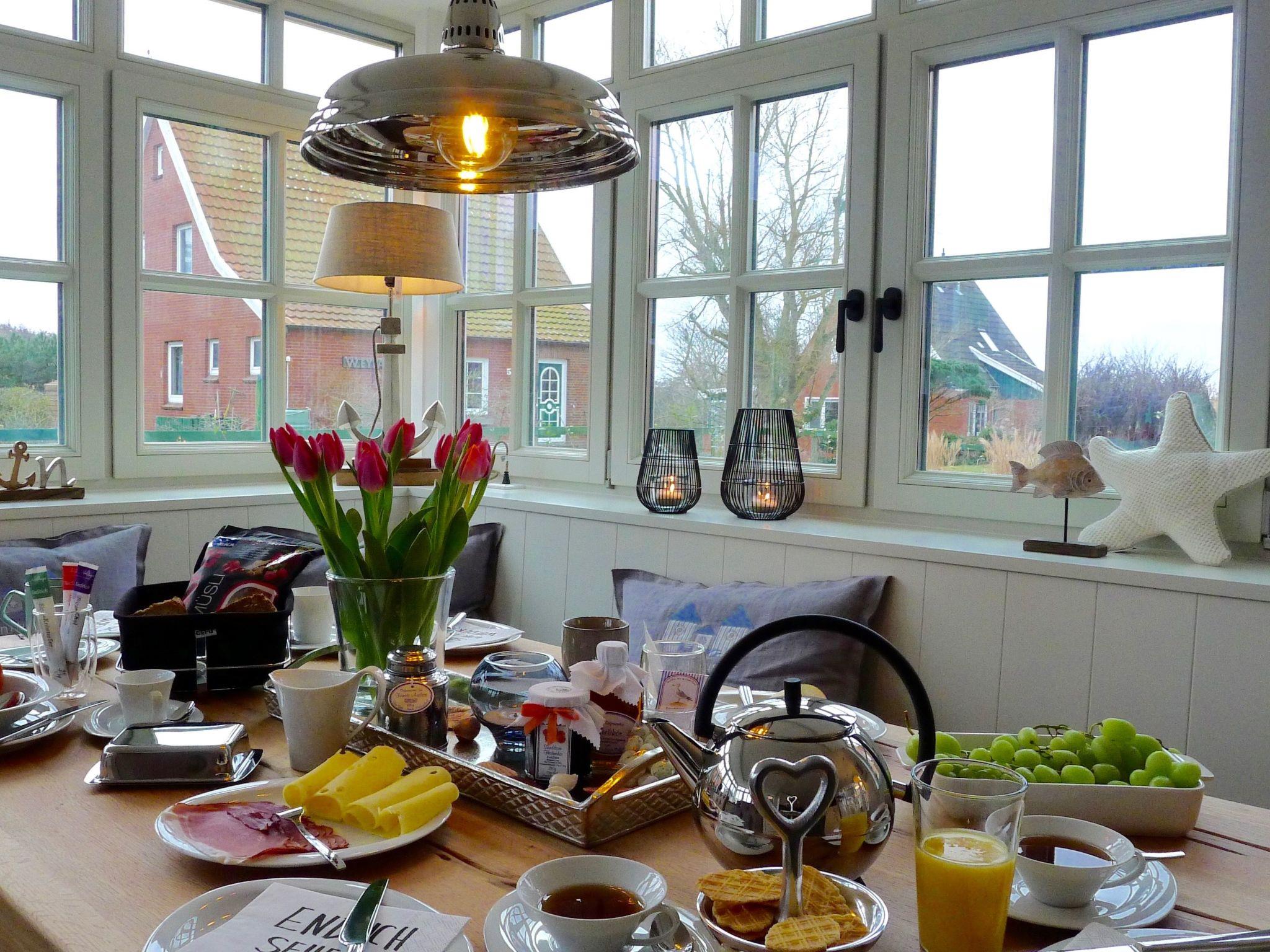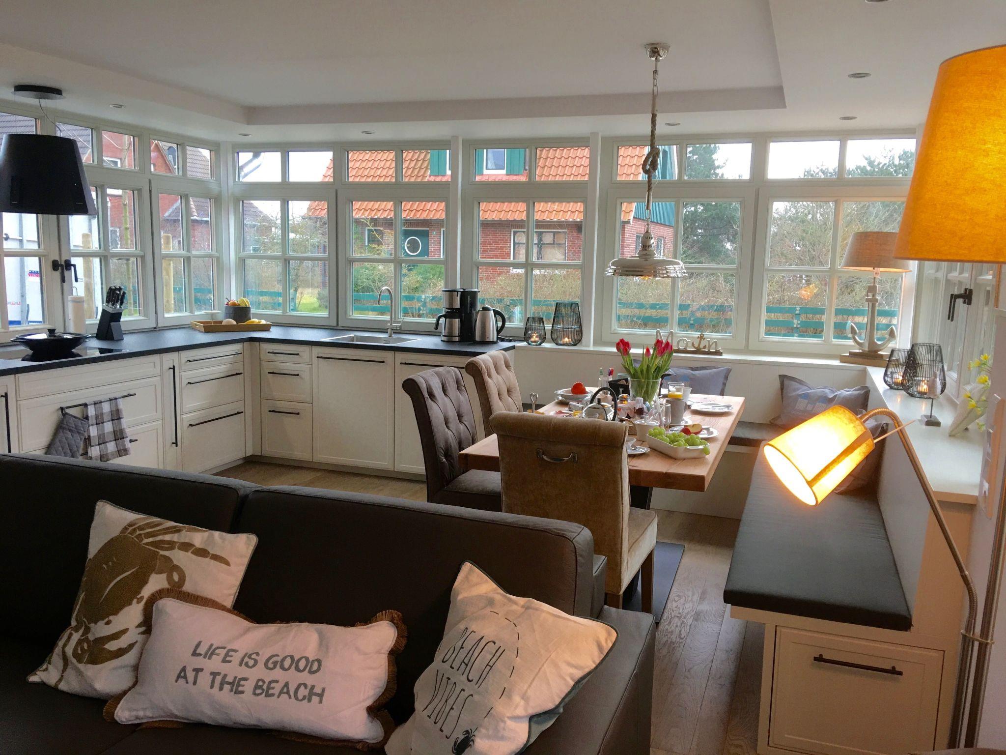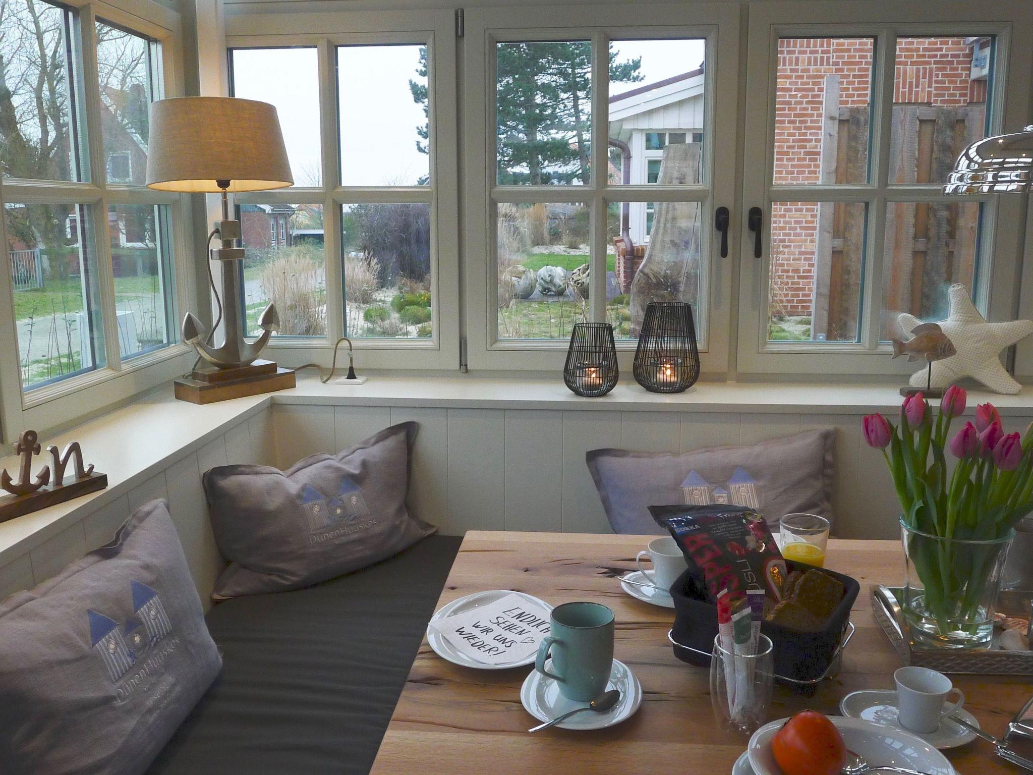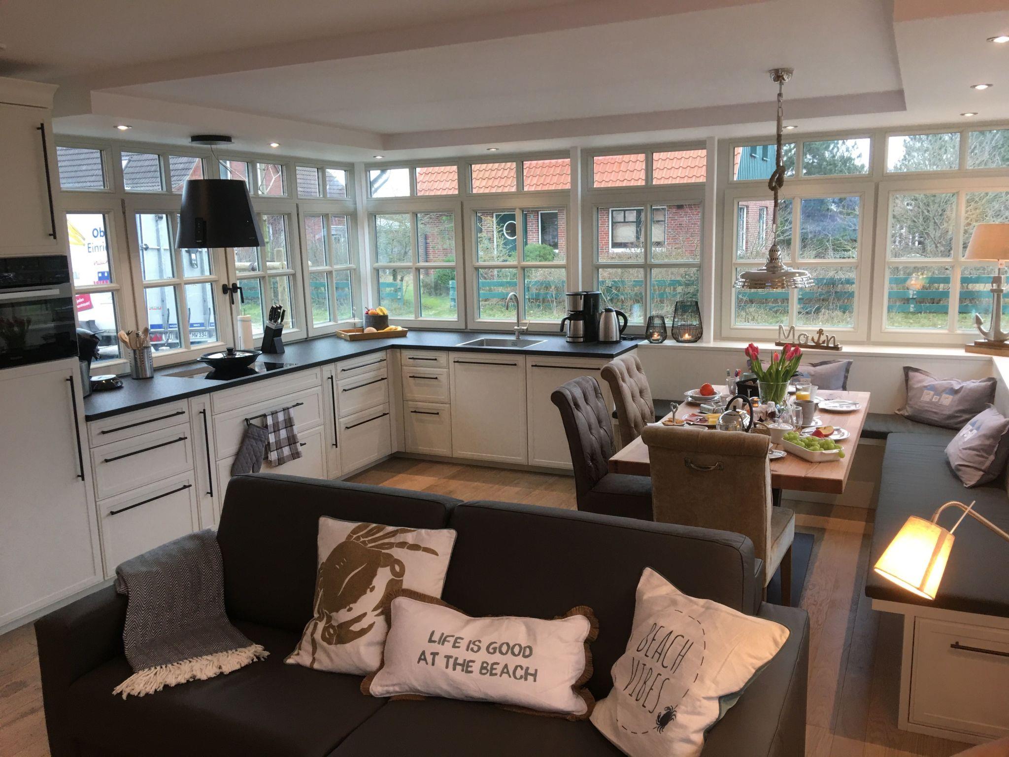 Our holiday home "InselStill" extends over 3 floors with a living space of 90 square metres for 4-6 people. It is exclusively furnished to a high standard and has a spacious living, dining and cooking area, 2 bedrooms, 2 shower rooms, 1 sauna, 1 sun shower/infrared light and underfloor heating and automatic ventilation on each floor. Outside there is also a lovely wooden terrace with comfortable garden furniture and a small lawn-lounger area.
