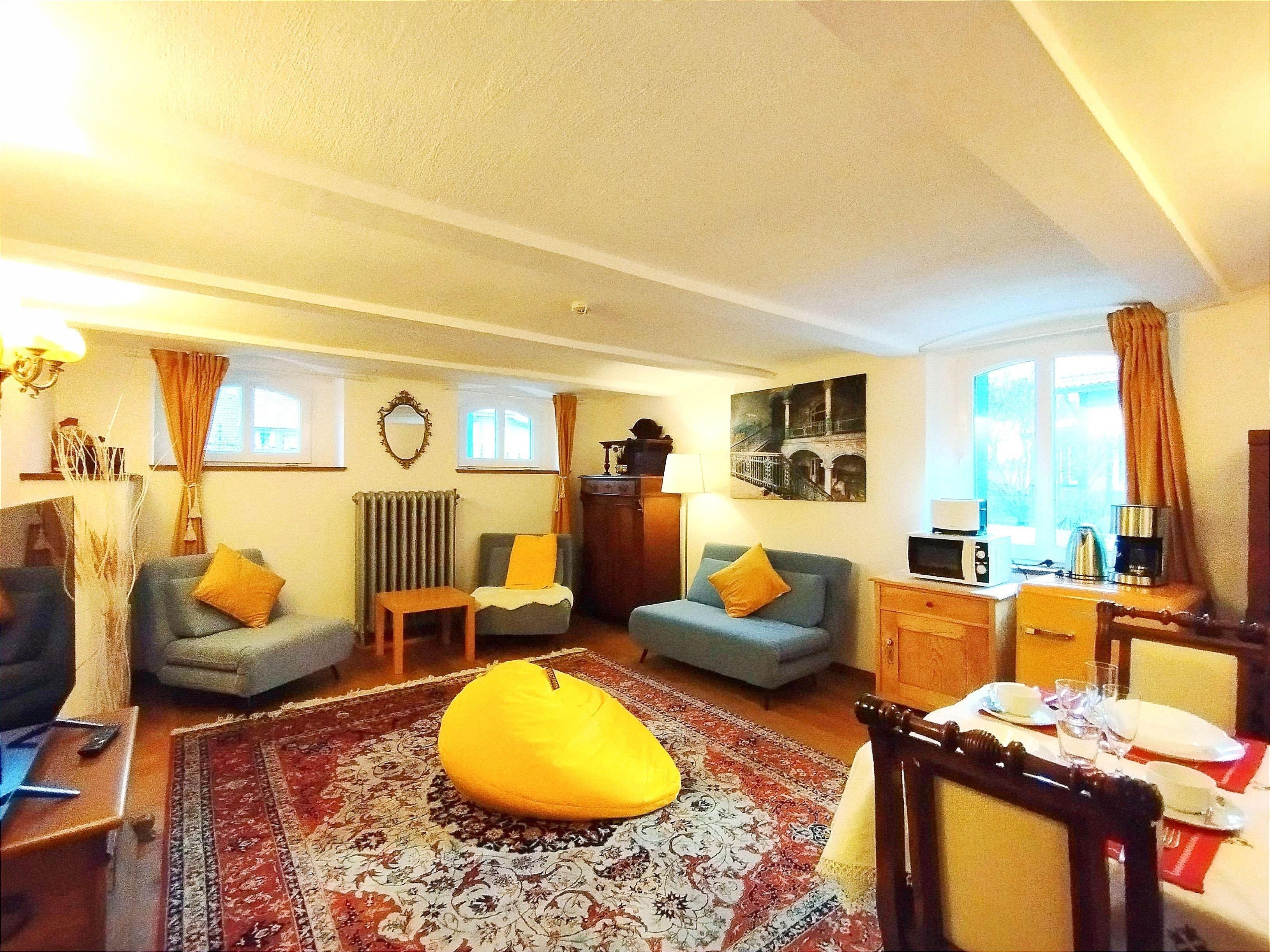 Wohnzimmer 2 sofas, TV, Kühschrank, Toaster, Microwave, Kaffeemaschine