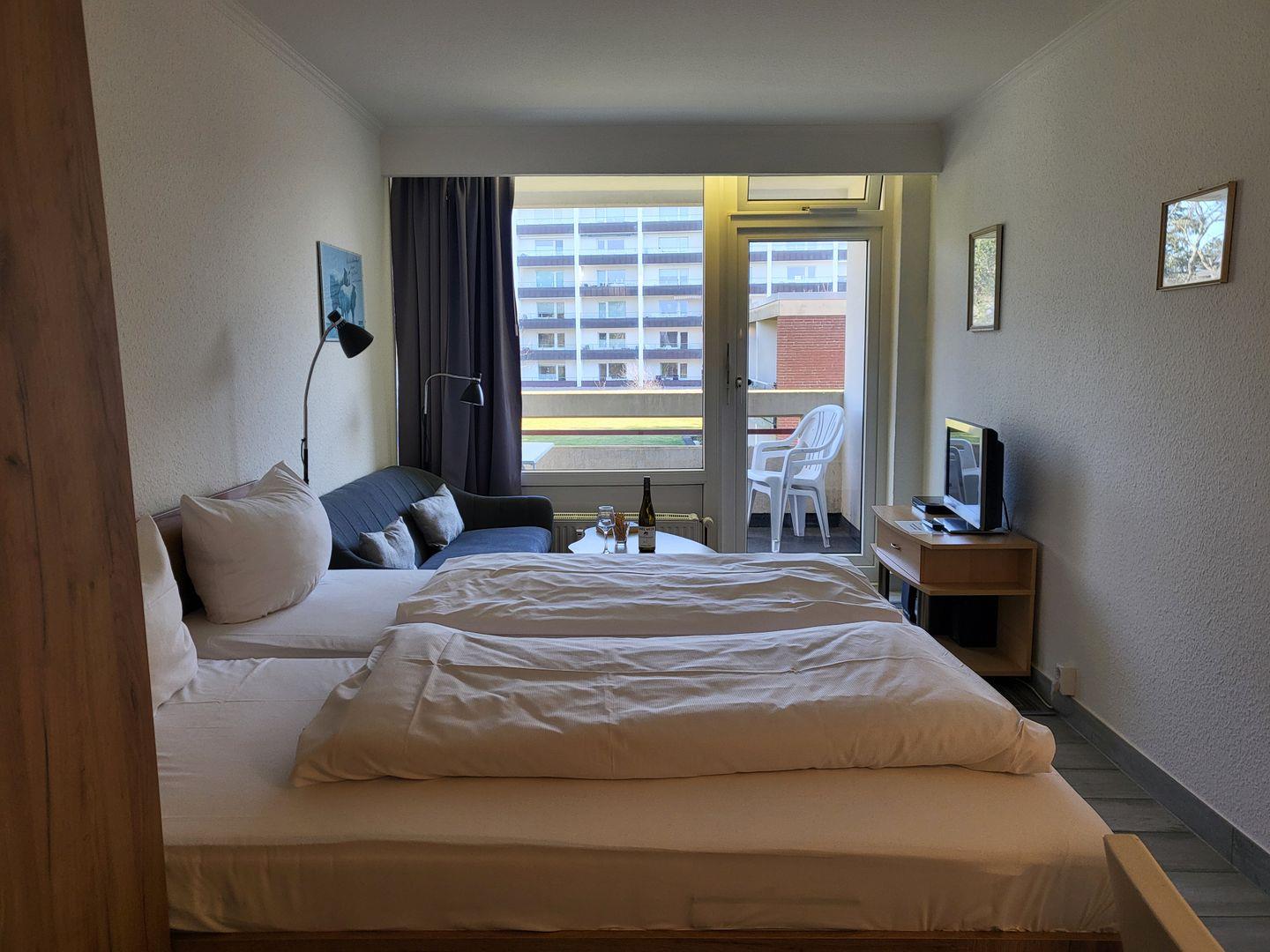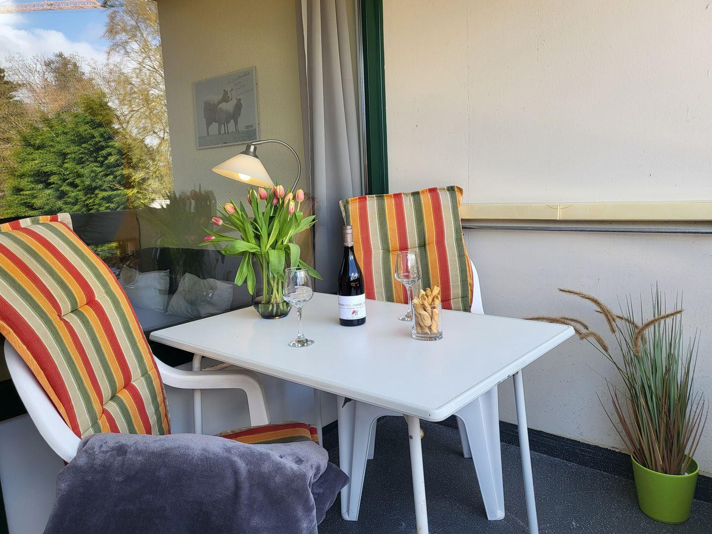 Kostenfreies W-LAN ist im strandnahen Apartment in Bestlage ebenfalls vorhanden. Die kompakte Pantry-Küche bietet Kühlschrank, Mikrowelle, Wasserkocher und Kaffeemaschine. Ein möblierter Balkon zur Landseite steht zur Verfügung.