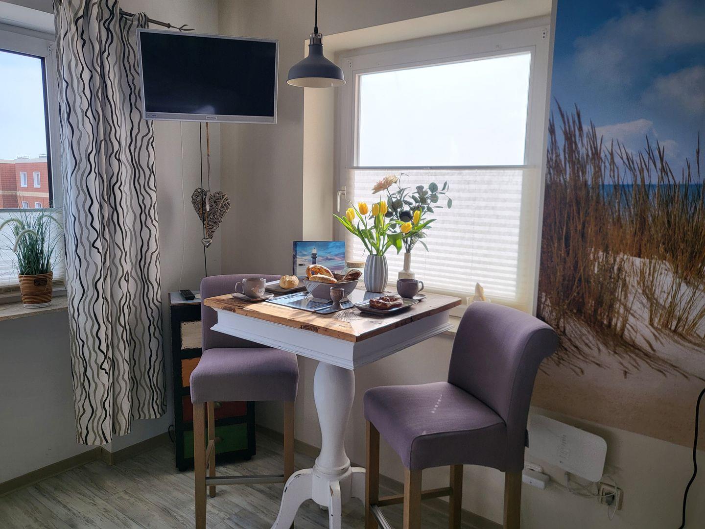 Mairitim und liebevoll eingerichtete 1-Zimmer Ferienwohnung mit direktem Seeblick in der 8. Etage. Ausgestattet mit kombiniertem Wohn- und Schlafraum mit Doppelbett, Sitzgelegenheiten und Flachbild-TV sowie einer