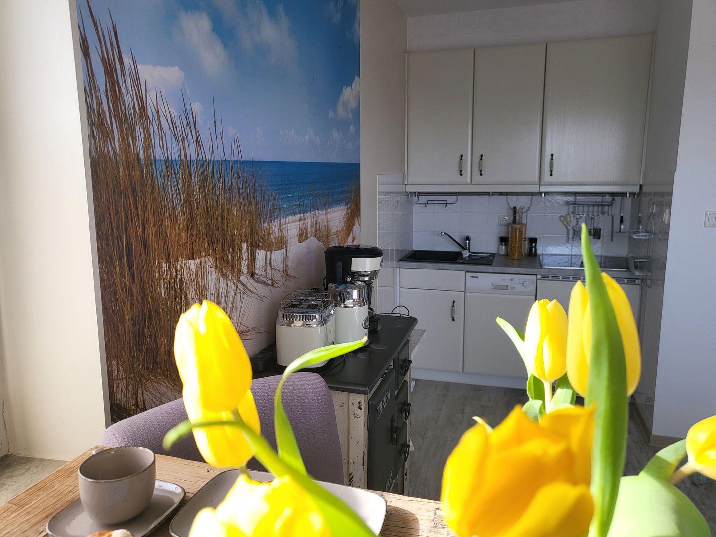 Die integrierte Küche ist gut ausgestattet und biete unter anderem Kochfeld, Kühlschrank mit Gefrierfach sowie Kaffeemaschine.