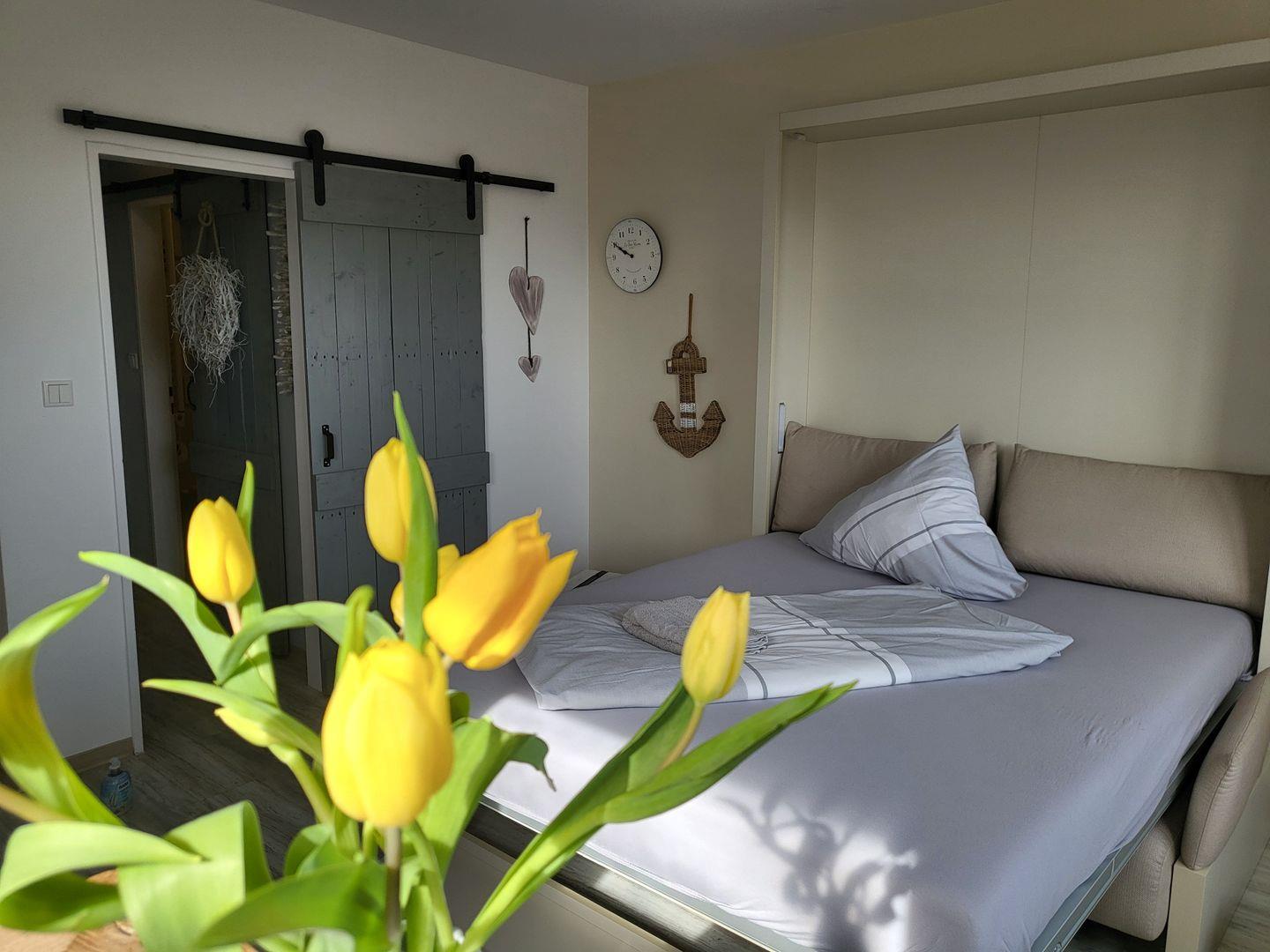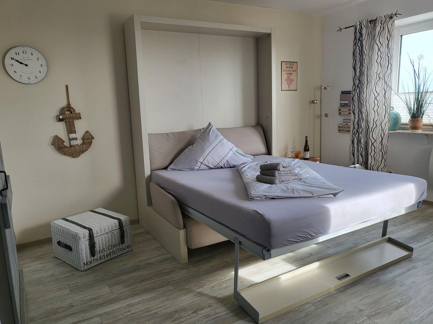 Durch die große Fensterfront wirkt der kombinierte Wohn- und Schlafraum wunderbar hell und einladend – Hier fühlt man sich direkt gut aufgehoben. Zur Ausstattung gehört hier das komfortable und überaus praktische Schrankbett, dass tagsüber einer gemütlichen Couch weicht. Beim Essen schweift der Blick ins Grüne, für die multimediale Unterhaltung in der Ferienwohnung mit Meerblick sorgen Flachbild-TV und kostenfreies W-LAN.