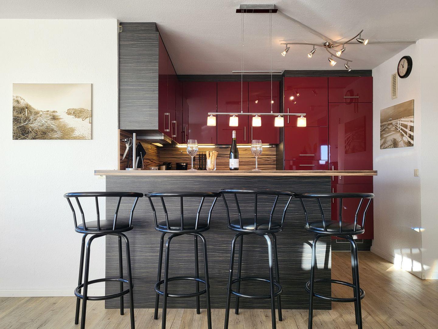 In den Raum integriert liegt die moderne Küche der Ferienwohnung, die mit einem edlen Esstresen vom Wohnraum abgetrennt ist.