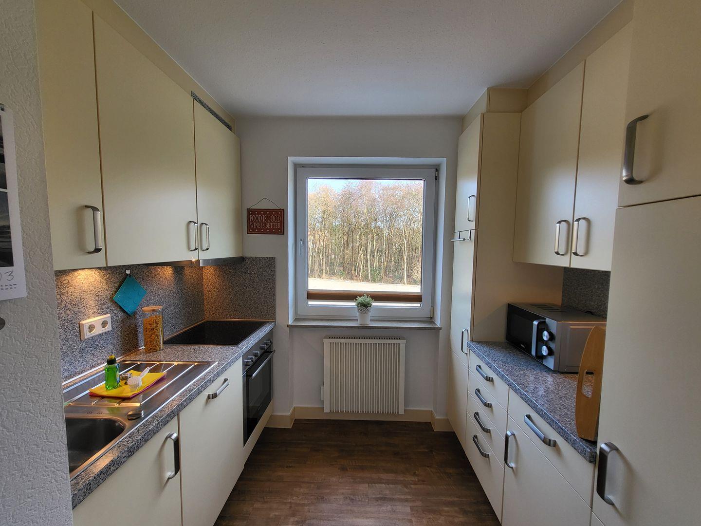 Am ausziehbaren Esstisch kann die ganze Familie Platz nehmen und von dort den Blick ins Grüne genießen. Für die Unterhaltung ist mit Flachbild-TV, Multi Media Musikanlage sowie kostenfreiem W-LAN bestens gesorgt. Die separate Küche der Ferienwohnung ist sehr gut ausgestattet und bietet unter anderem Cerankochfeld und Backofen sowie Kühlschrank mit Gefrierfach, Eierkocher, einen Geschirrspüler und eine Kaffeemaschine. Eine Mikrowelle und ein WMF-Tischgrill sind ebenfalls vorhanden.