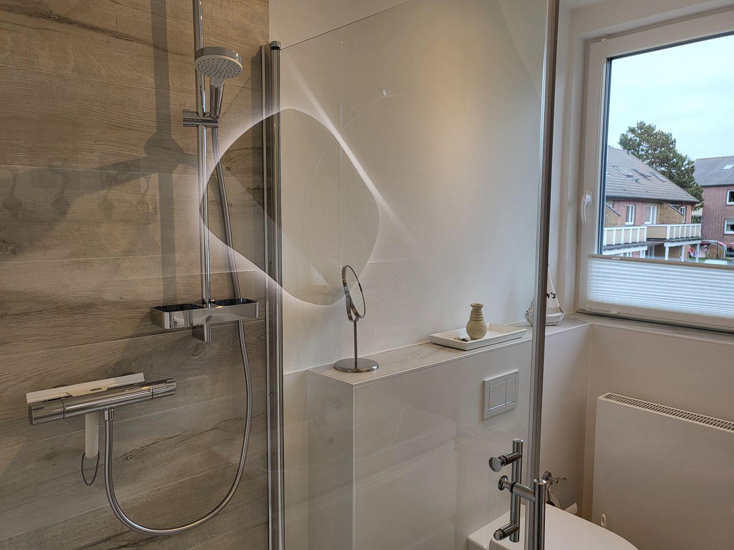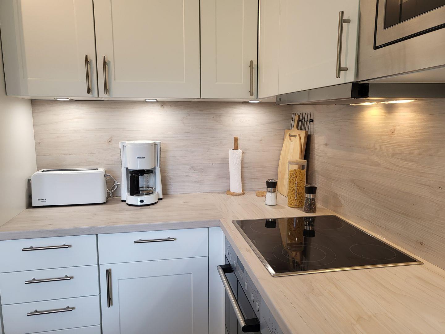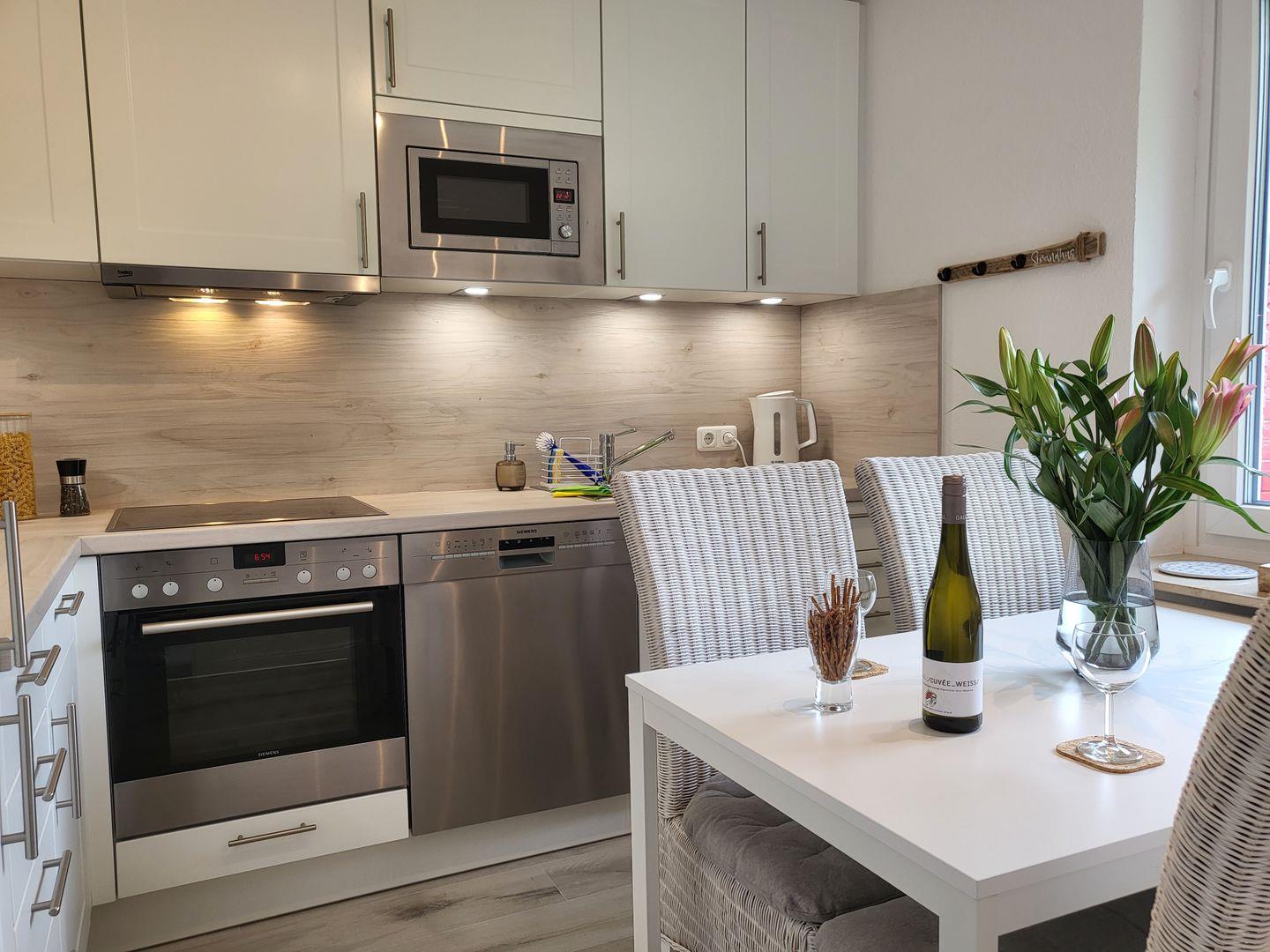 Die separate Küche ist sehr gut ausgestattet, unter anderem stehen hier Cerankochfeld und Backofen sowie Kühlschrank mit Gefrierfach und Geschirrspüler zur Verfügung. Zum Erdgeschoss gehört weiterhin ein helles Tageslichtbadezimmer, das mit Dusche, Waschbecken und WC ausgestattet ist.