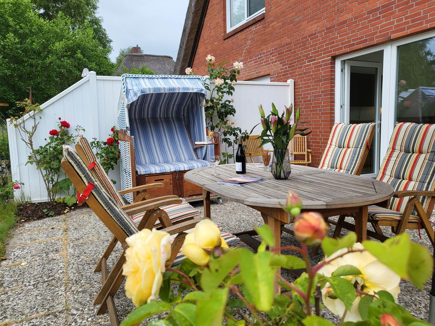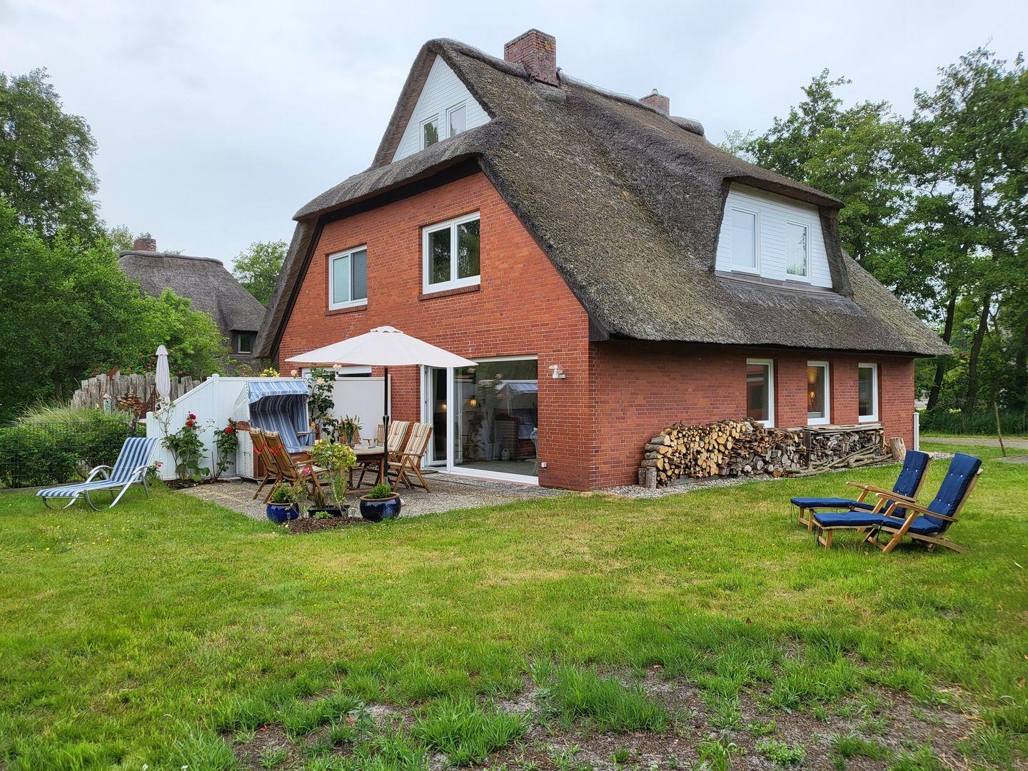 Ferienhaus DHH unter Reetdach mit Terrasse und Garten. Ausgestattet mit großem Wohnzimmer, separater Küche mit Esstisch und zwei separaten Schlafzimmern. Eines mit Doppelbett, eines mit zwei Einzelbetten. Zwei Duschbäder vorhanden.