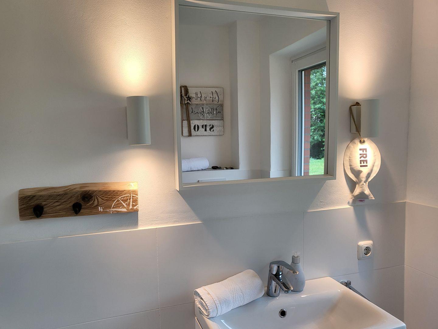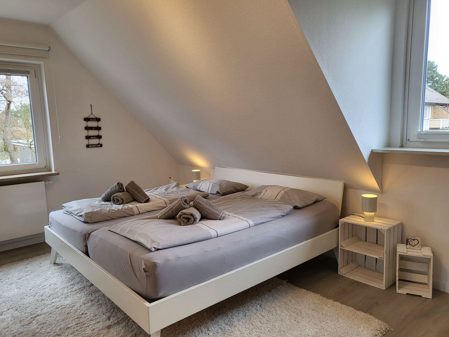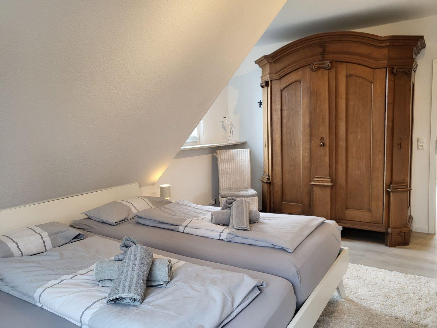 Im geräumigen Obergeschoss sind zwei Schlafzimmer eingerichtet. Eines ist ausgestattet mit großem 180x200cm Doppelbett, im zweiten stehen zwei Einzelbetten zur Verfügung. Ein weiteres Tageslichtbadezimmer mit Dusche, Waschbecken und WC ist ebenfalls auf der Etage.