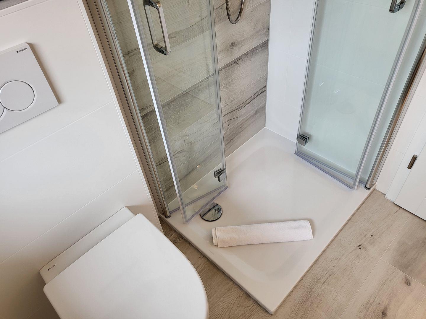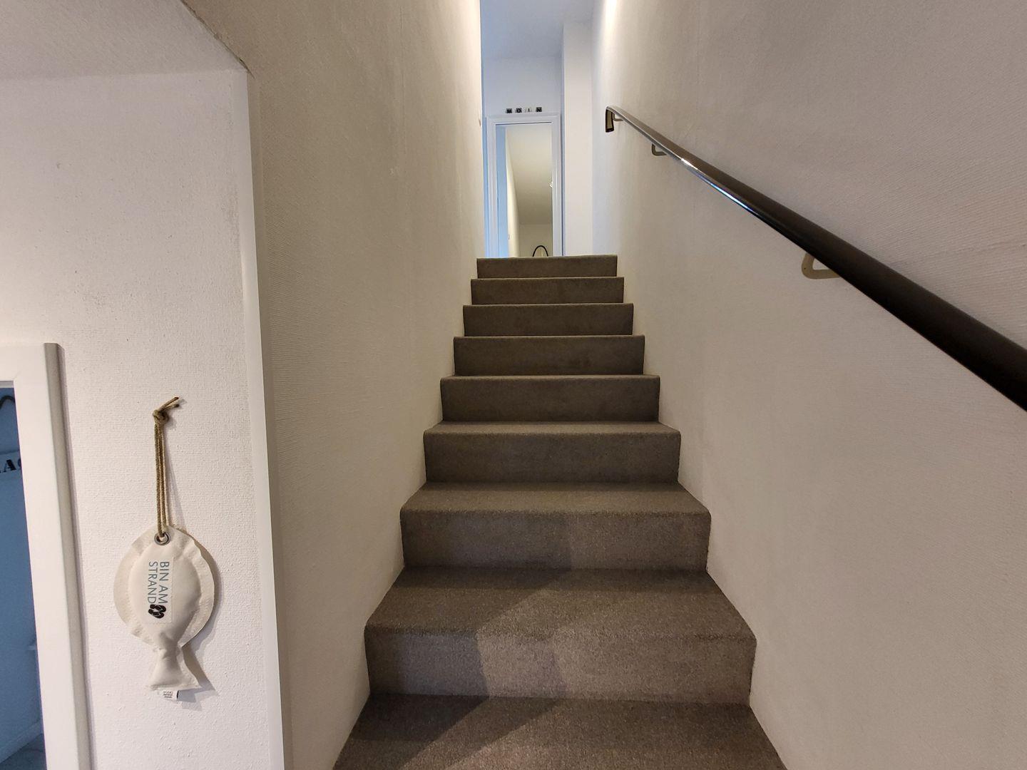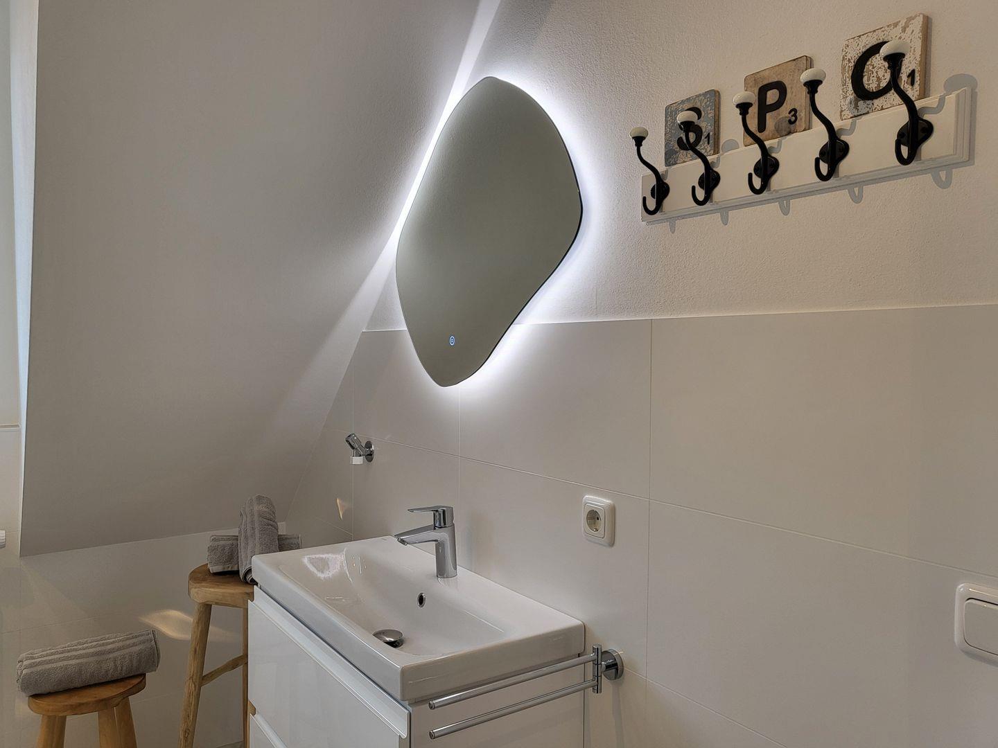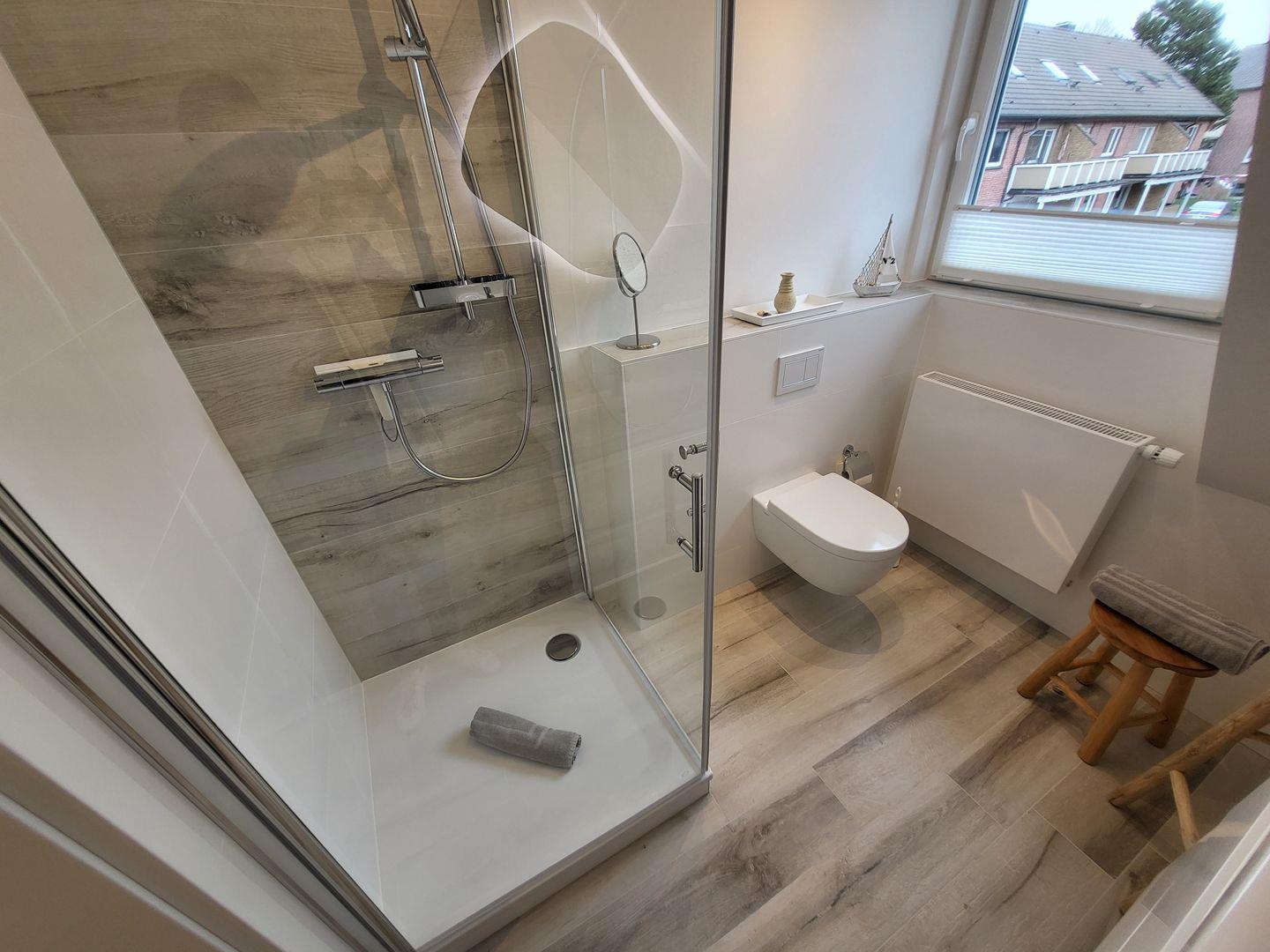 Im geräumigen Obergeschoss sind zwei Schlafzimmer eingerichtet. Eines ist ausgestattet mit großem 180x200cm Doppelbett, im zweiten stehen zwei Einzelbetten zur Verfügung. Ein weiteres Tageslichtbadezimmer mit Dusche, Waschbecken und WC ist ebenfalls auf der Etage.