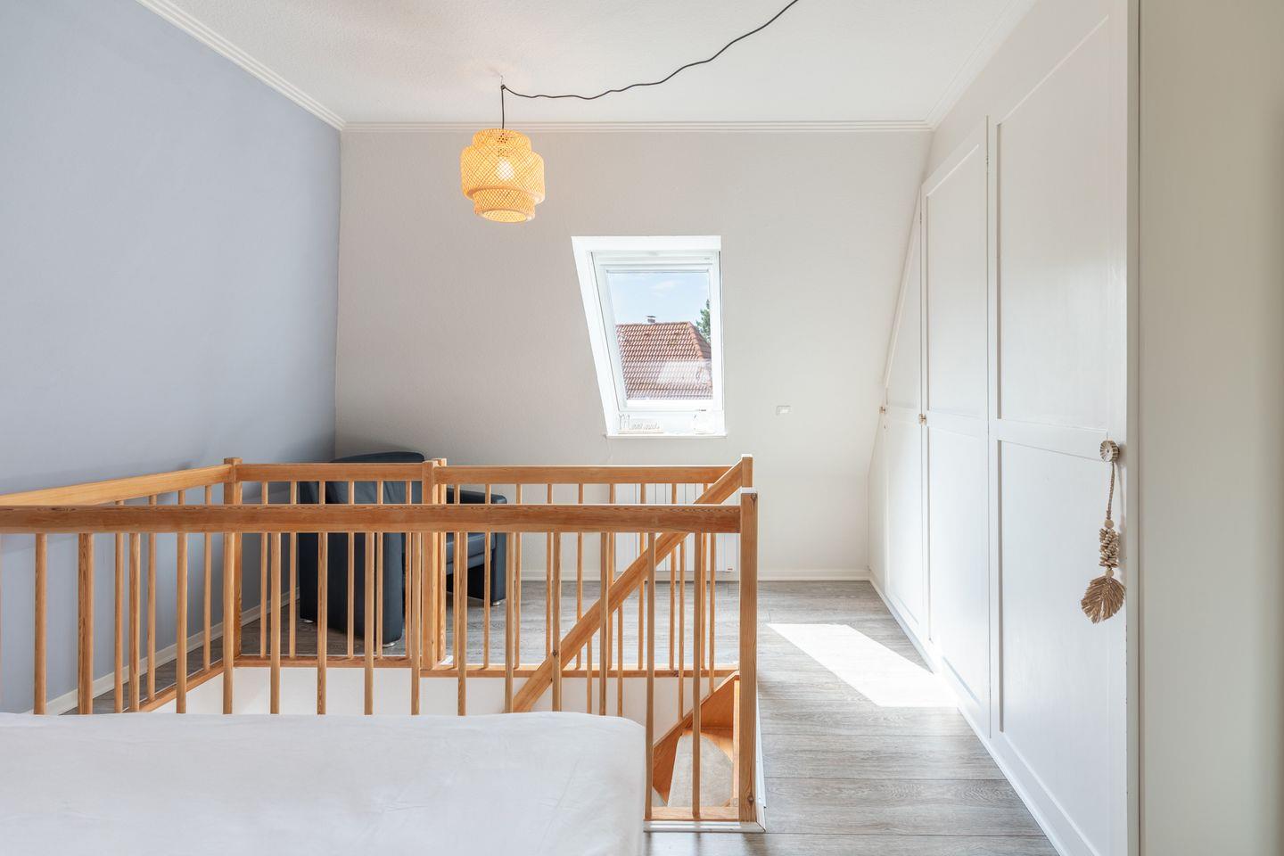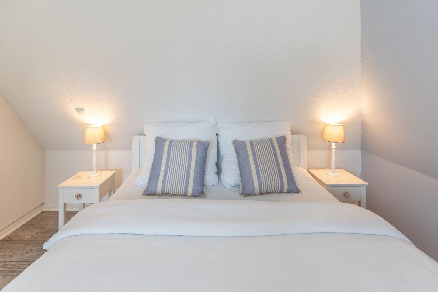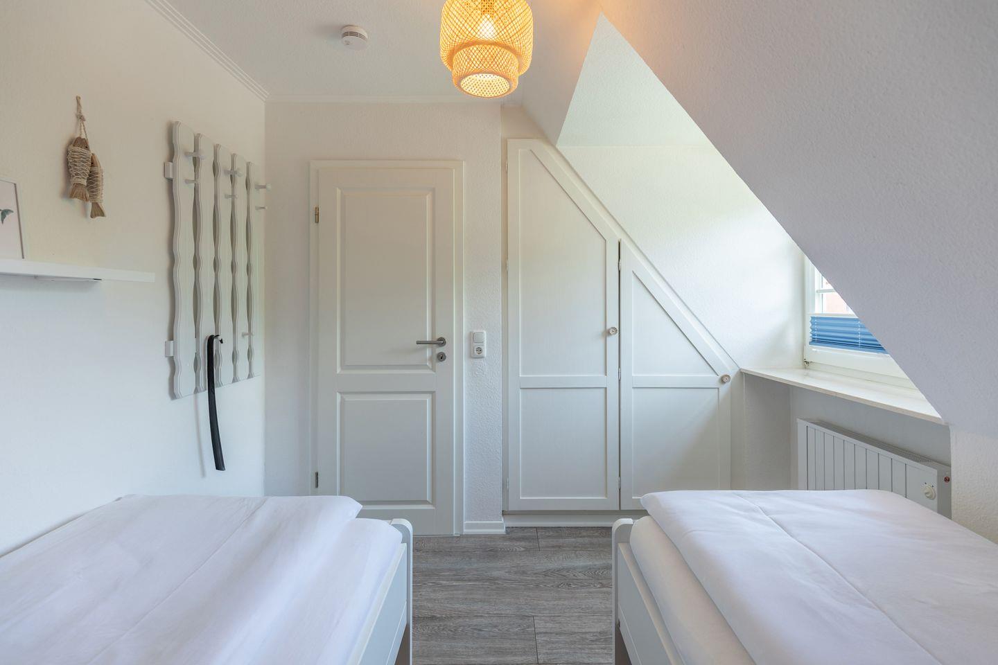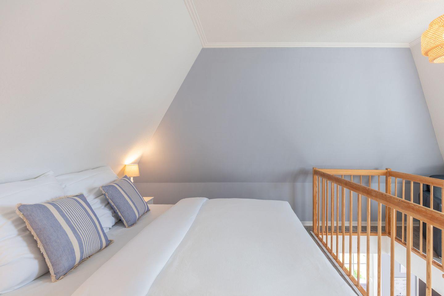 Über eine offene Holztreppe erreicht man das separate Staffelgeschoß, das mit einem weißen Doppelbett mit Einzelmatratzen ( 2 x 80 ), Nachttischen und weißem Kleiderschrank ausgestattet ist. Das Zimmer verfügt über ein Veluxfenster (nicht einsehbar).