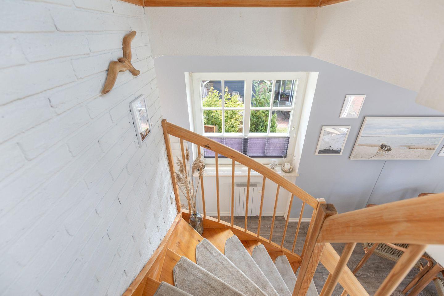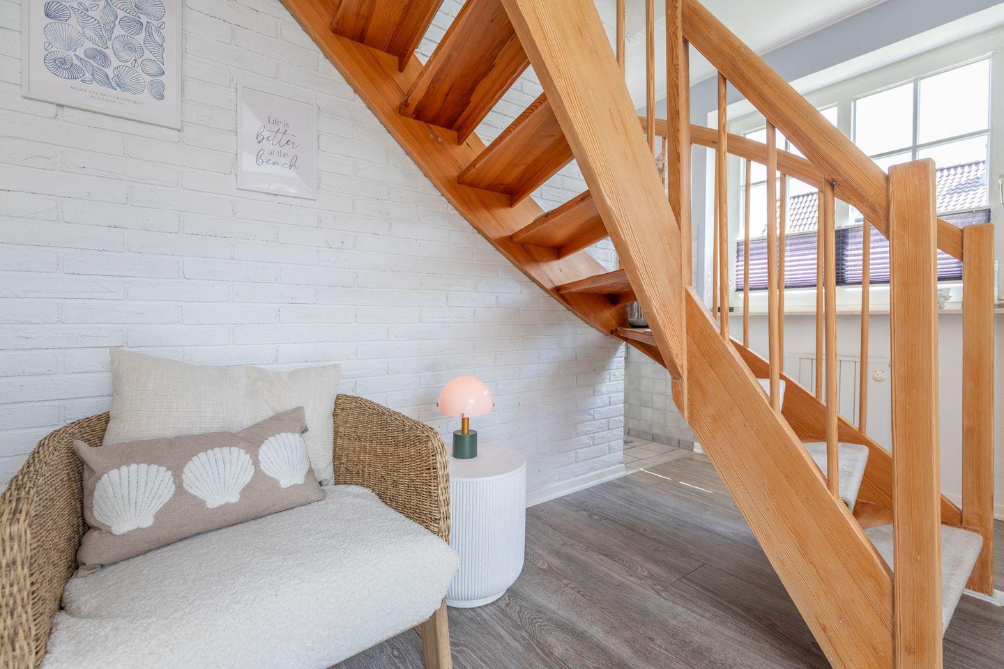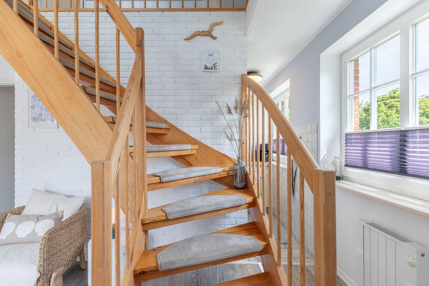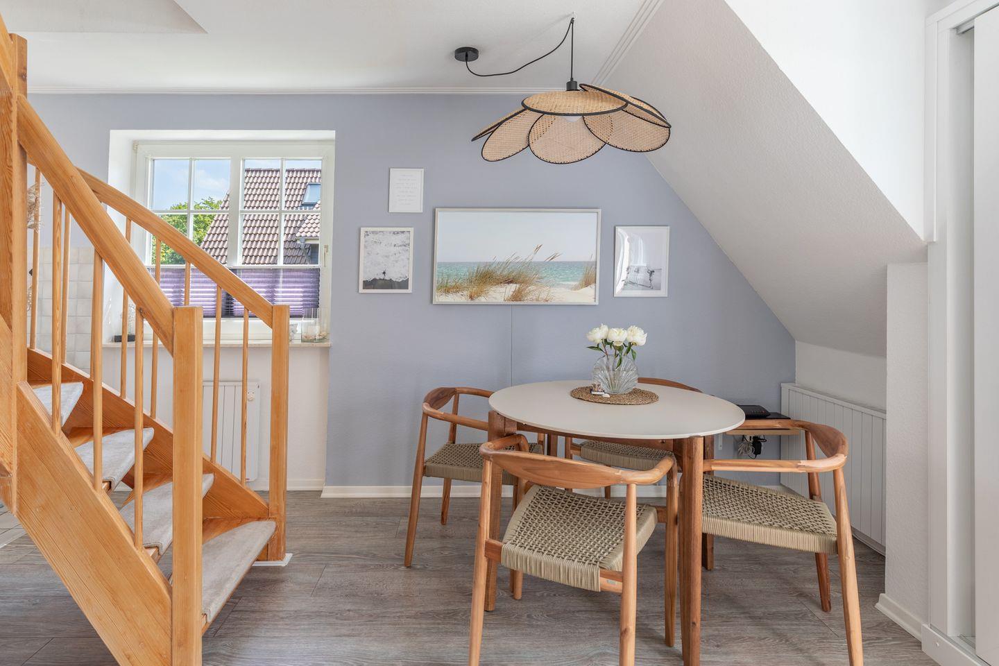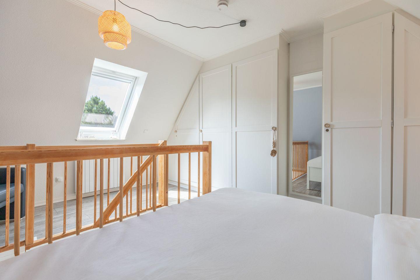 Über eine offene Holztreppe erreicht man das separate Staffelgeschoß, das mit einem weißen Doppelbett mit Einzelmatratzen ( 2 x 80 ), Nachttischen und weißem Kleiderschrank ausgestattet ist. Das Zimmer verfügt über ein Veluxfenster (nicht einsehbar).