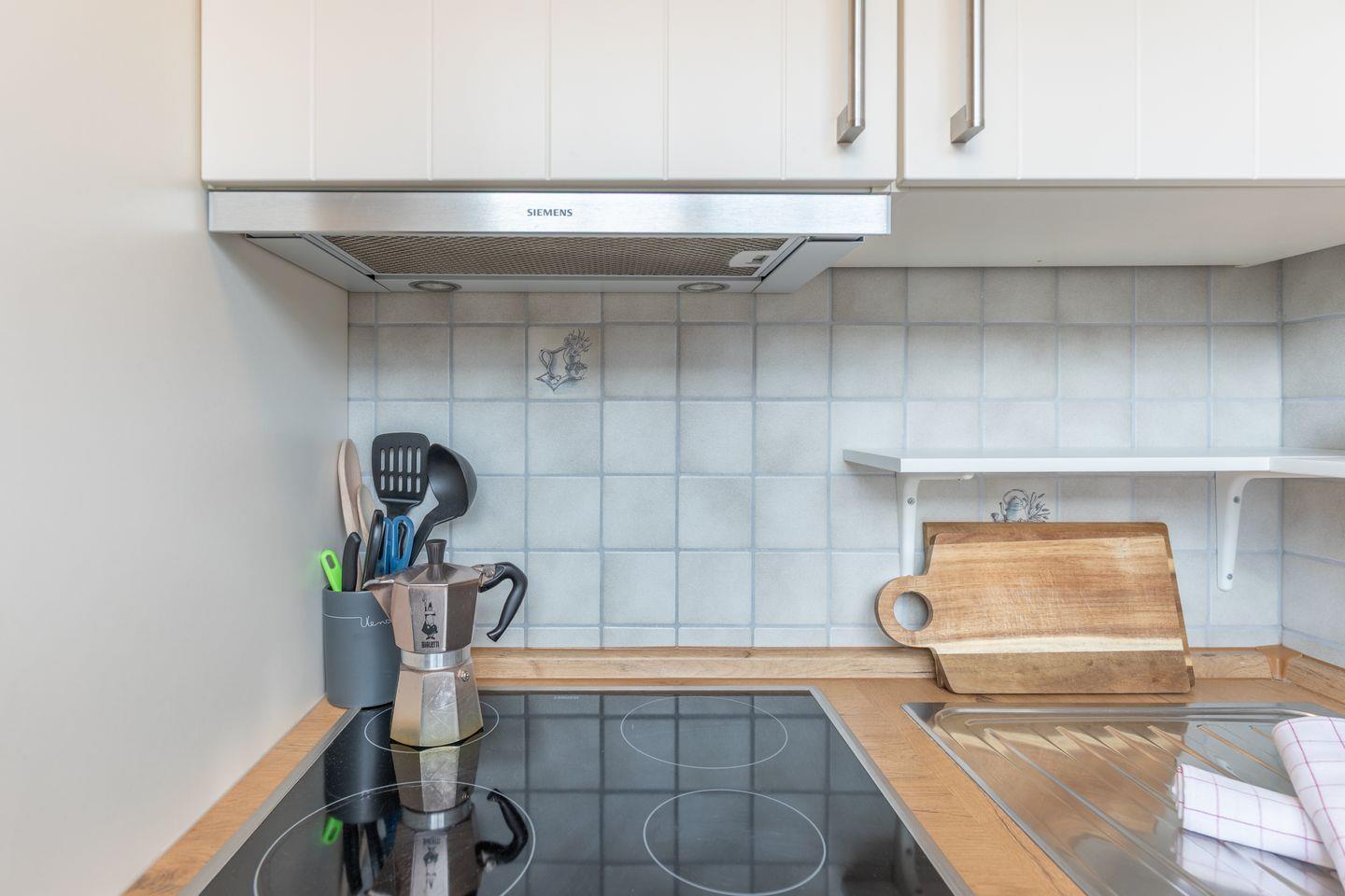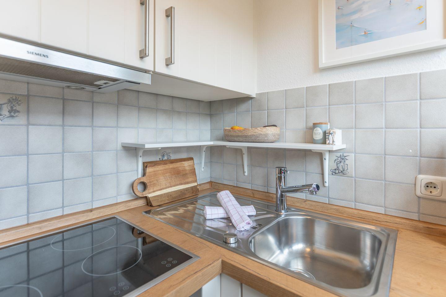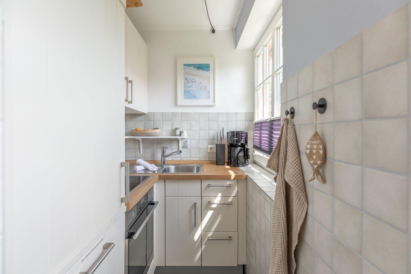 Die kleine Küche ist offen zum Wohnzimmer und ausgestattet mit einem Cerankochfeld und Backofen, Kühlschrank mit Gefrierfach und einer Geschirrspülmaschine. Kaffeemaschine, Wasserkocher, Toaster und alles weitere Küchenzubehör wie Geschirr, Besteck, Töpfe und Pfannen sind ausreichend vorhanden.