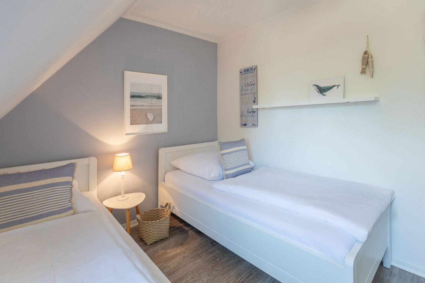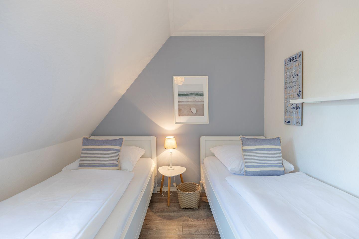 Ein weiteres Schlafzimmer mit zwei einzelnen Betten befindet sich im unteren Bereich der Wohnung.
